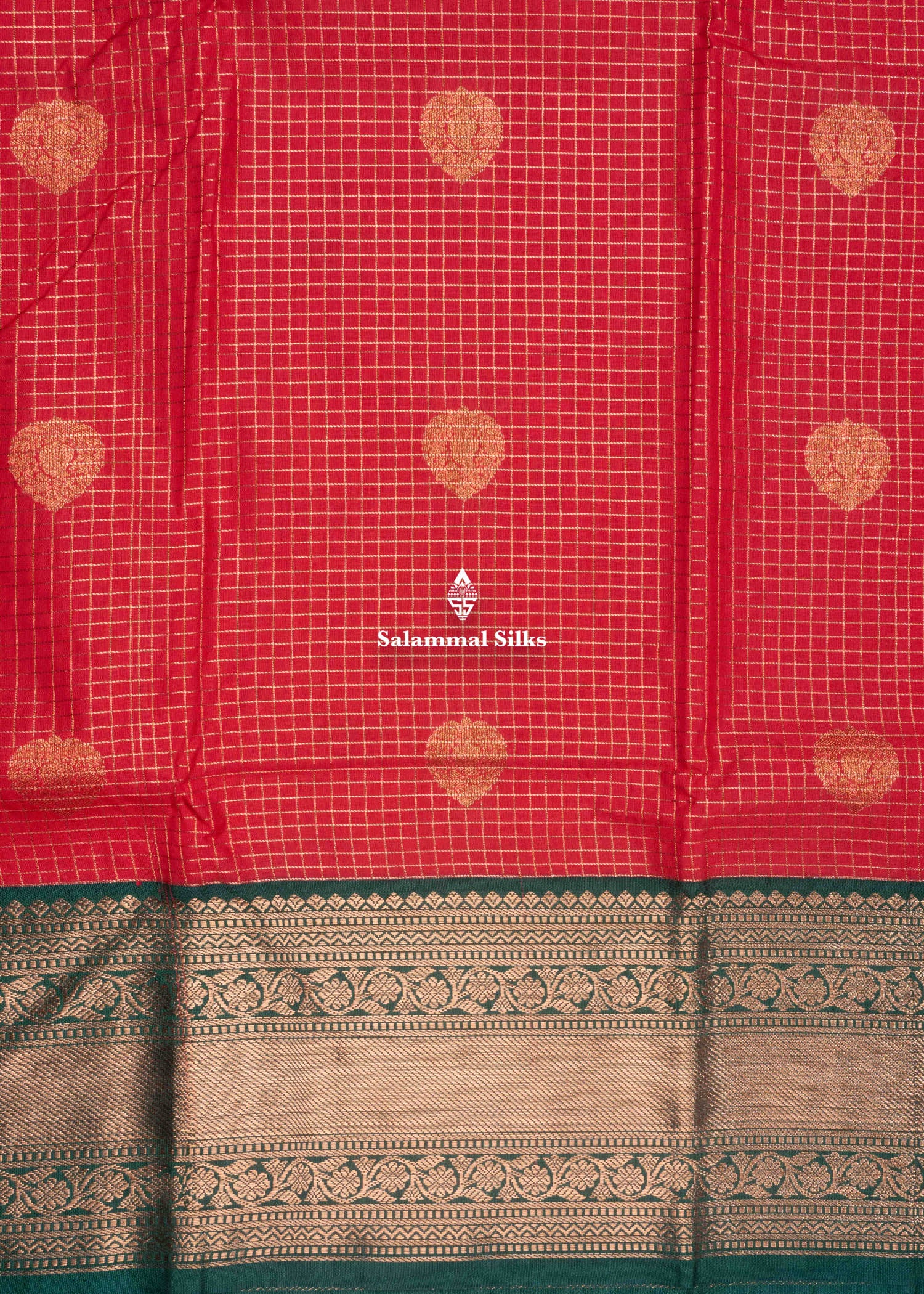 Chilly Red Colour Semi Silk Saree With Copper Zari Bottle Green Border