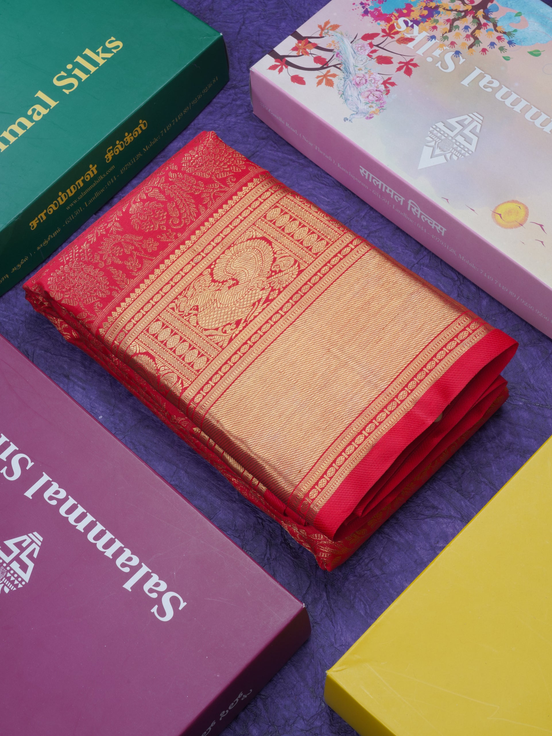 Salammal is known for its handloom sarees. In some sarees, there is cross-weaving between the body and the pallu, which is a sign of pure handloom sarees. This can be seen in Kanchipuram embossed sarees.