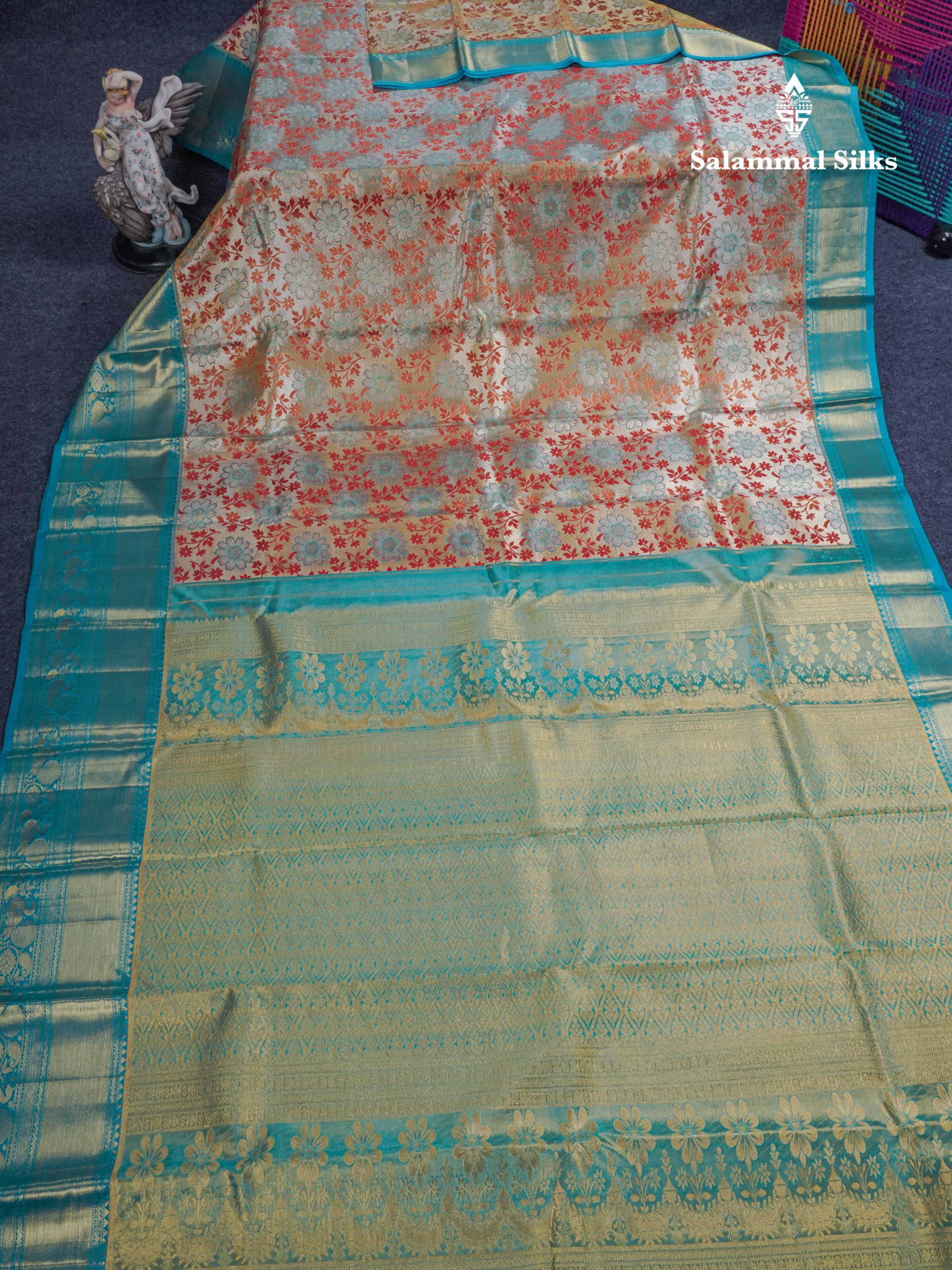 Salammal is known for its handloom sarees. In some sarees, there is cross-weaving between the body and the pallu, which is a sign of pure handloom sarees. This can be seen in Kanchipuram embossed sarees.