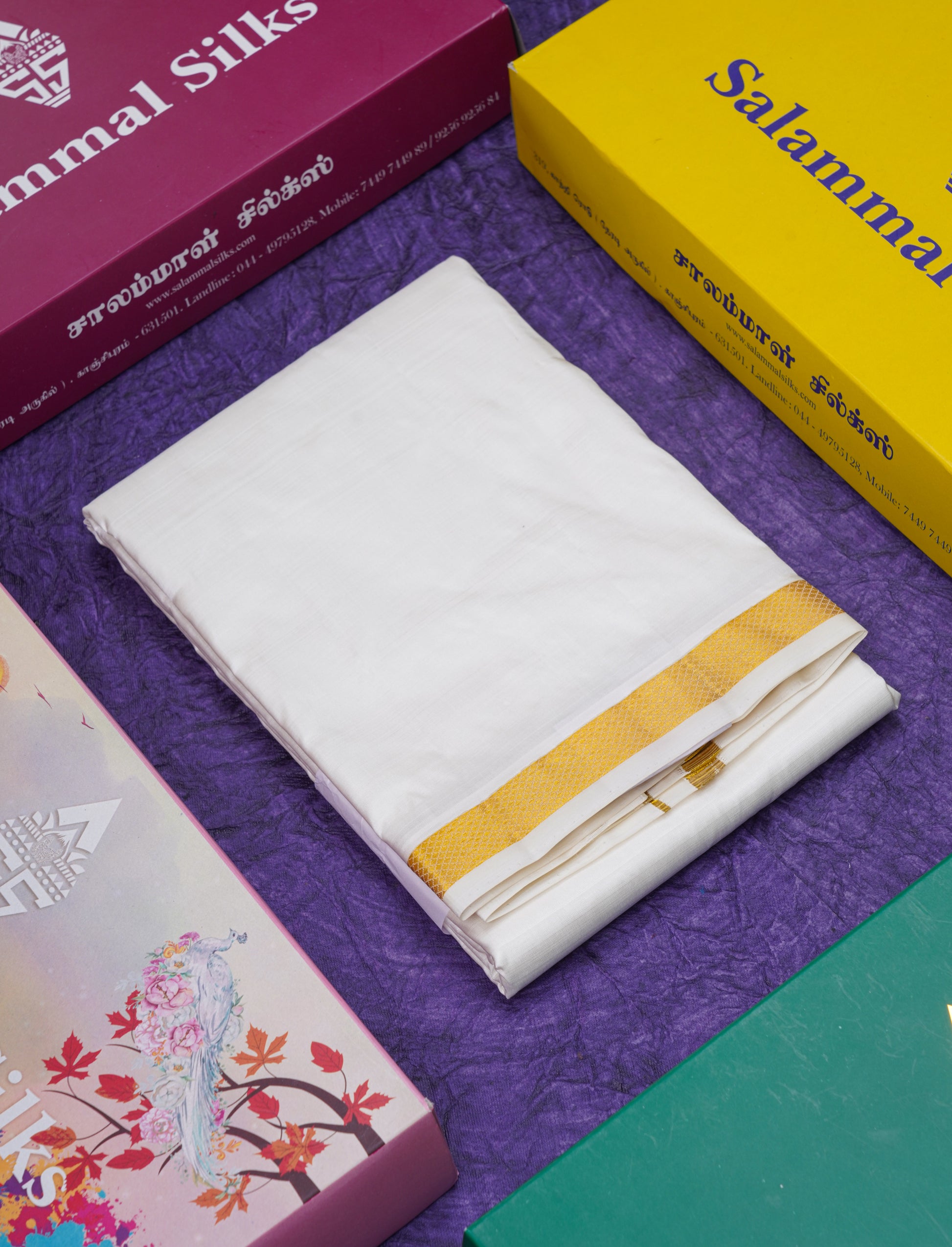 Salammal is known for its handloom sarees. In some sarees, there is cross-weaving between the body and the pallu, which is a sign of pure handloom sarees. This can be seen in Kanchipuram embossed sarees.