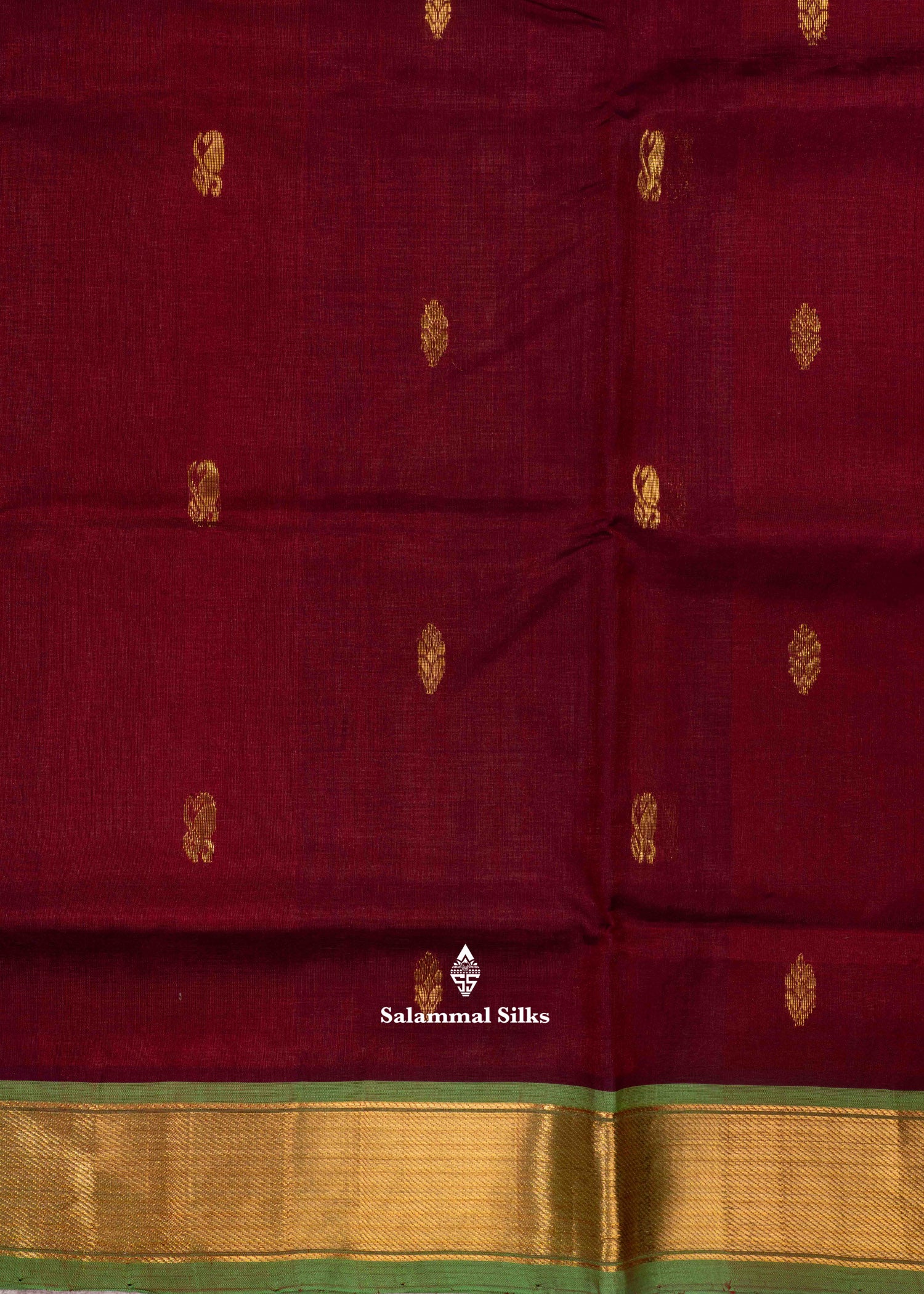 Dark Maroon Pure Silk Cotton Saree With Olive Green Blouse