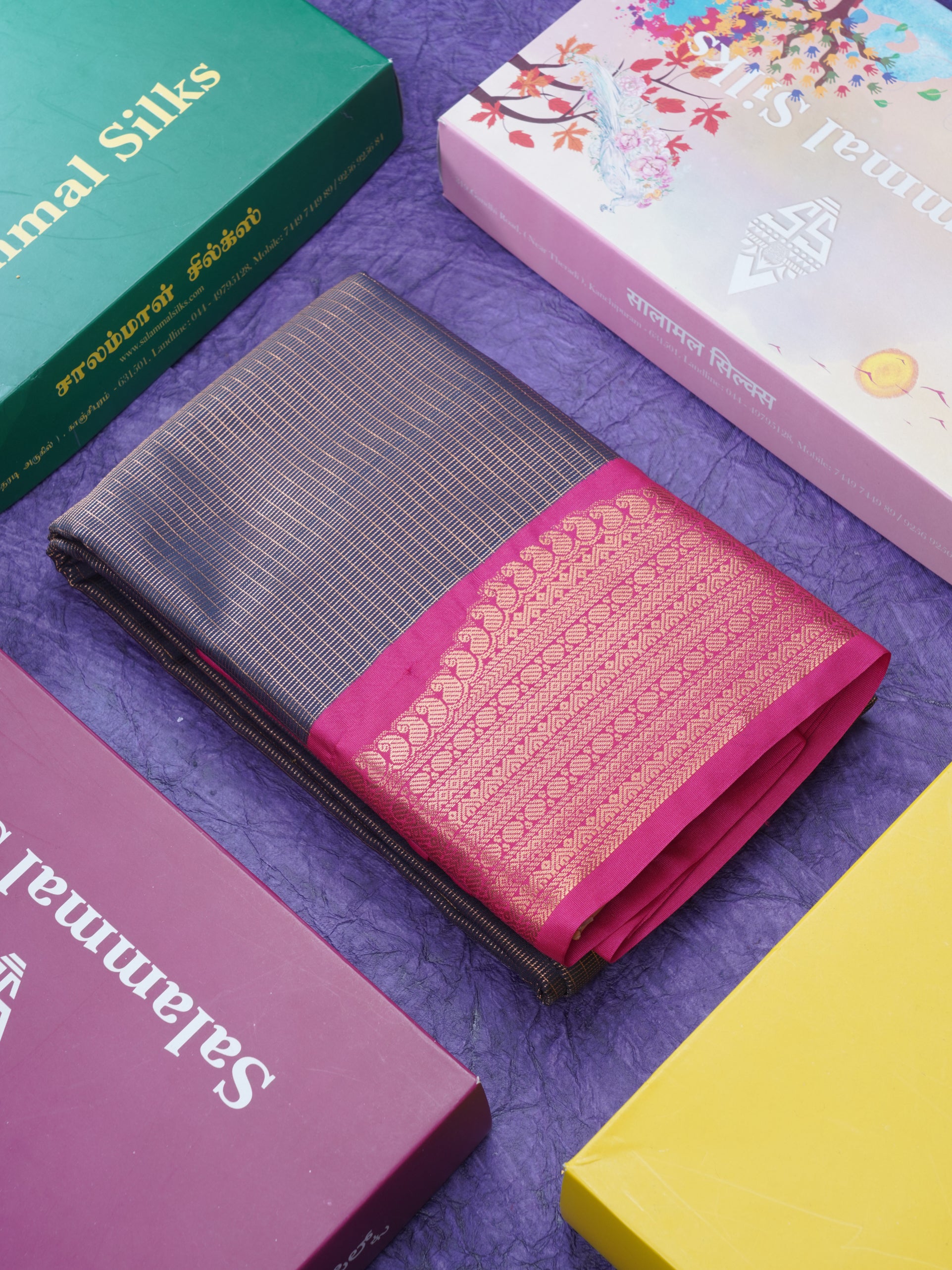 Salammal is known for its handloom sarees. In some sarees, there is cross-weaving between the body and the pallu, which is a sign of pure handloom sarees. This can be seen in Kanchipuram embossed sarees.
