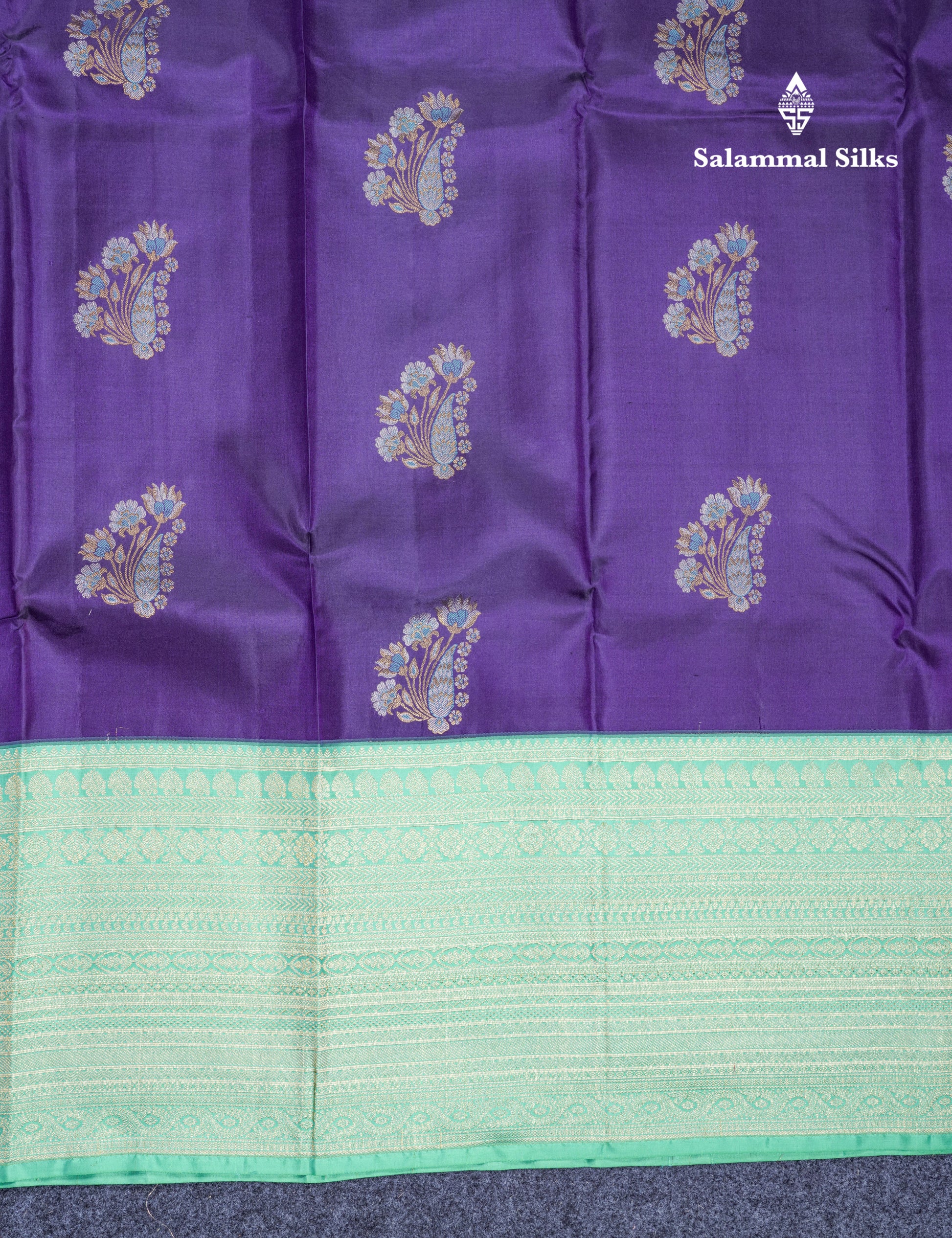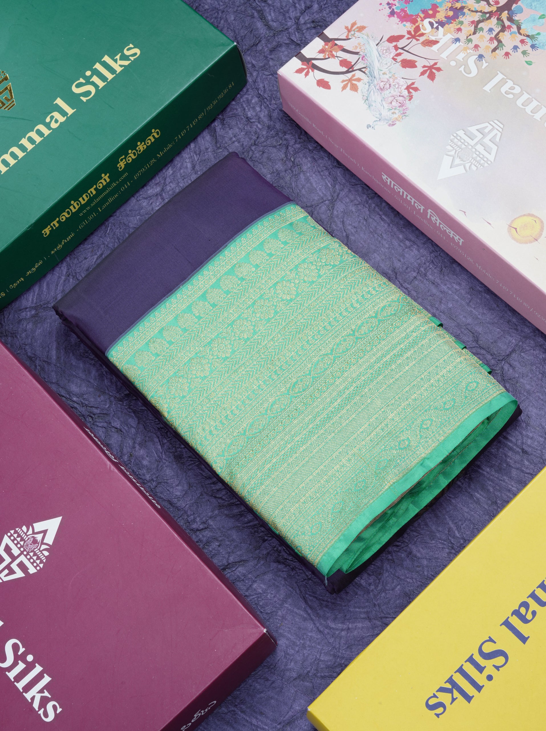 Dark Purple Pure Kanjivaram Silk Saree With Contrast Rexona Green Long Border