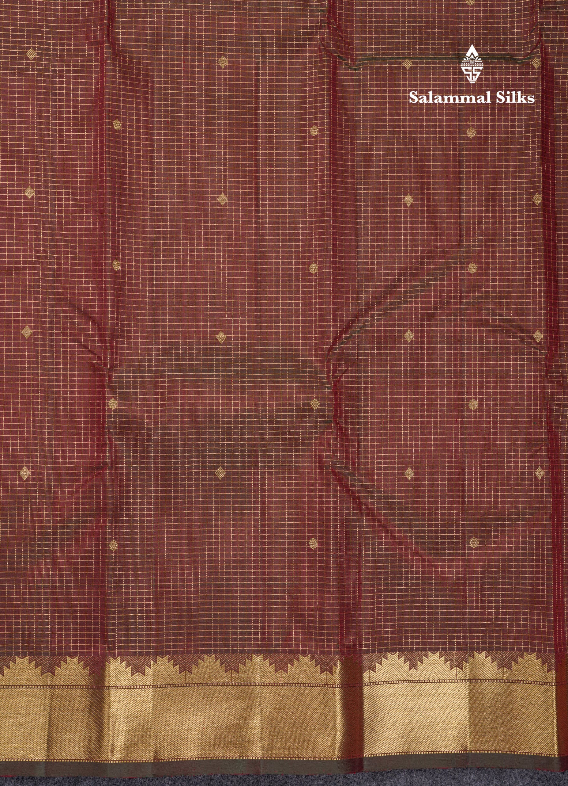Dual Tone Maroon Tiny Checks Pure Kanjivaram Silk Saree With Traditional Temple Border