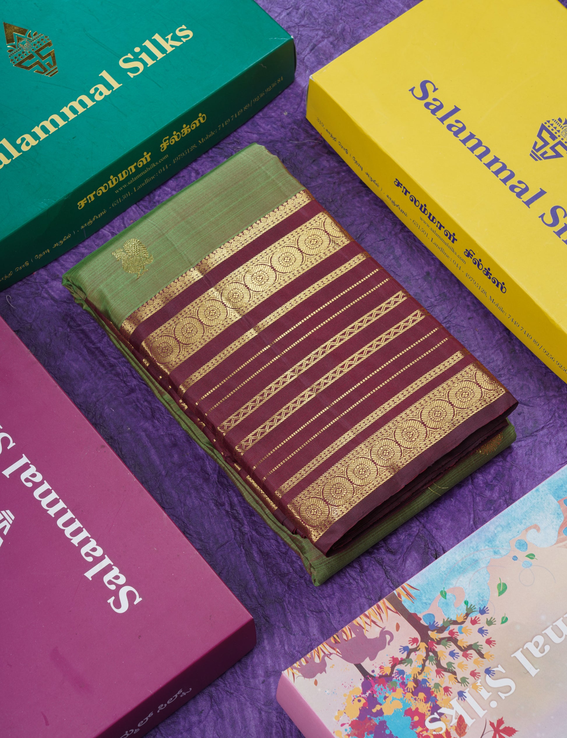 Salammal is known for its handloom sarees. In some sarees, there is cross-weaving between the body and the pallu, which is a sign of pure handloom sarees. This can be seen in Kanchipuram embossed sarees.