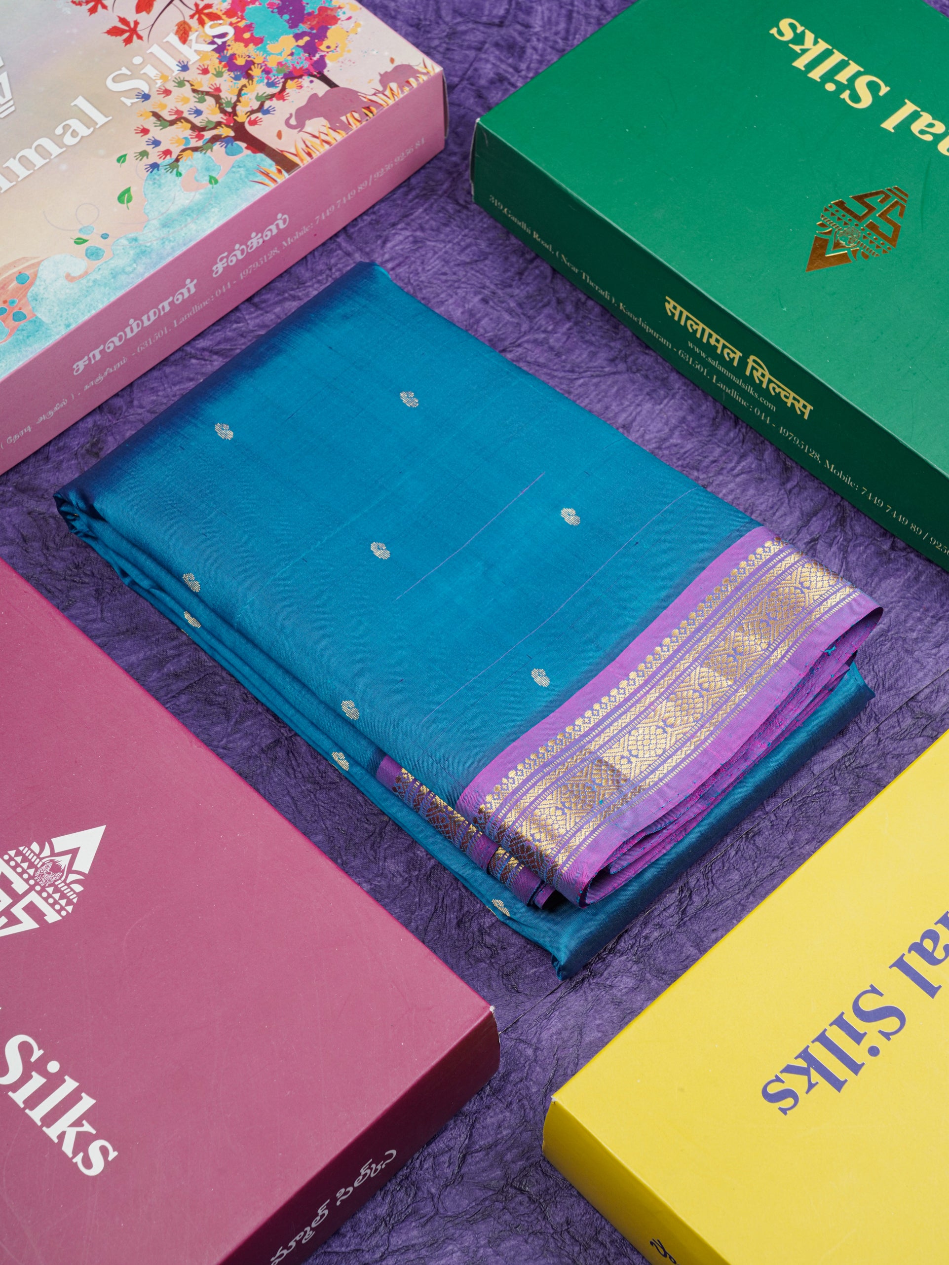 Dual Tone Peacock Blue Pure Kanjivaram Silk Saree With Contrast Vadamalli Small Border