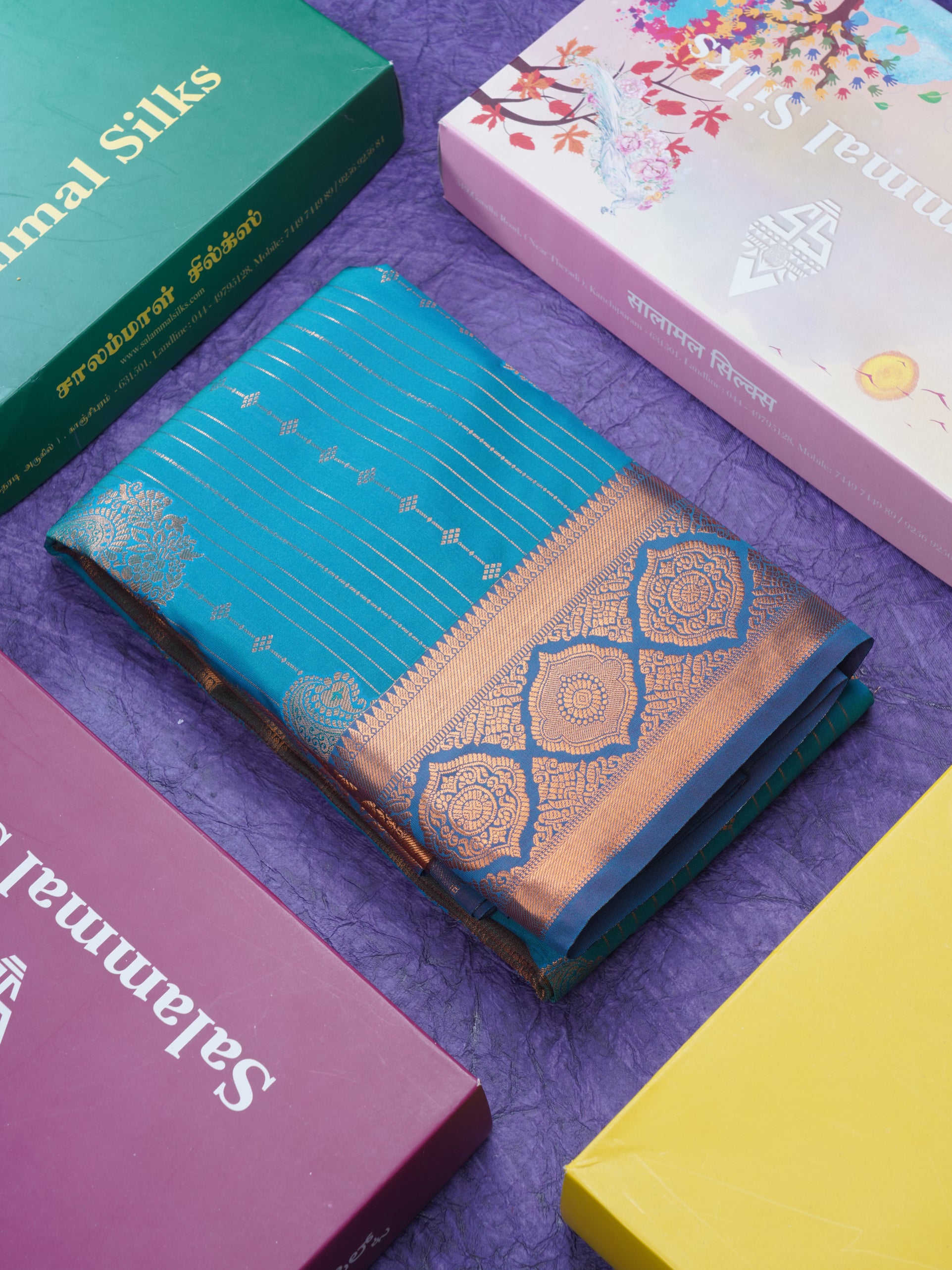 Salammal is known for its handloom sarees. In some sarees, there is cross-weaving between the body and the pallu, which is a sign of pure handloom sarees. This can be seen in Kanchipuram embossed sarees.