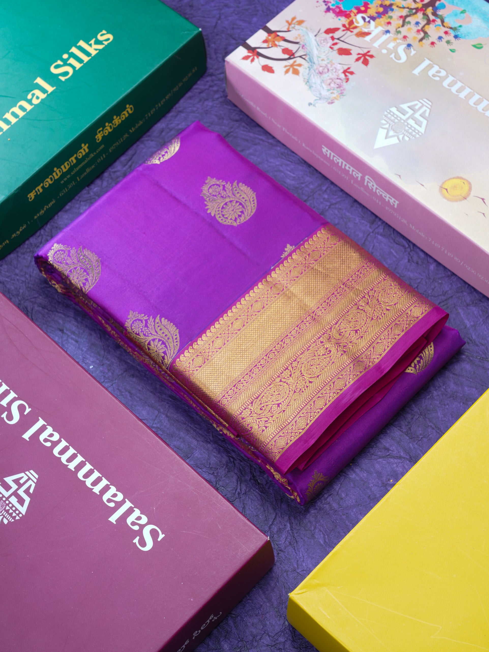 Dual Tone Purple Pure Kanjivaram Silk Saree With Contrast Magenta Pink Border