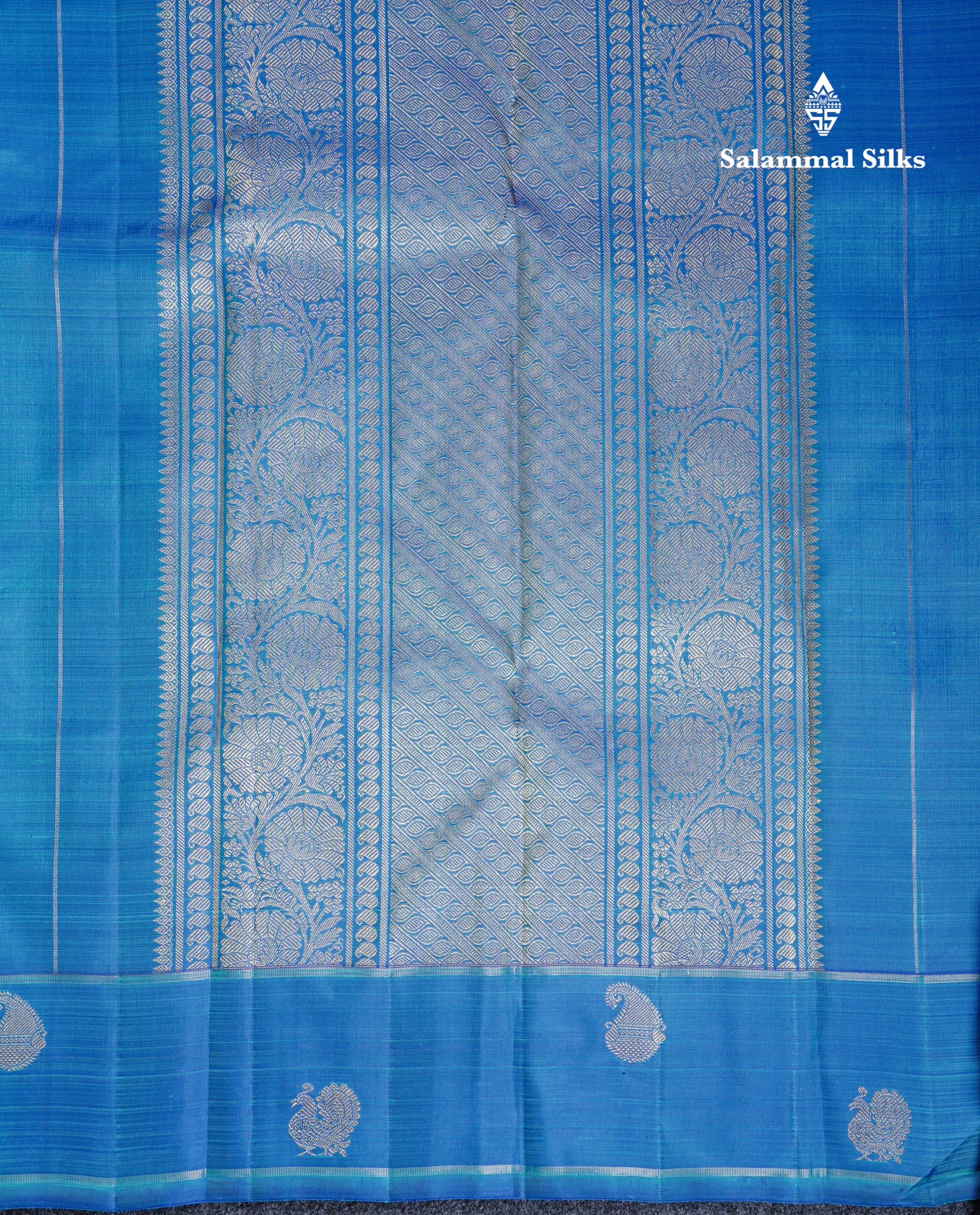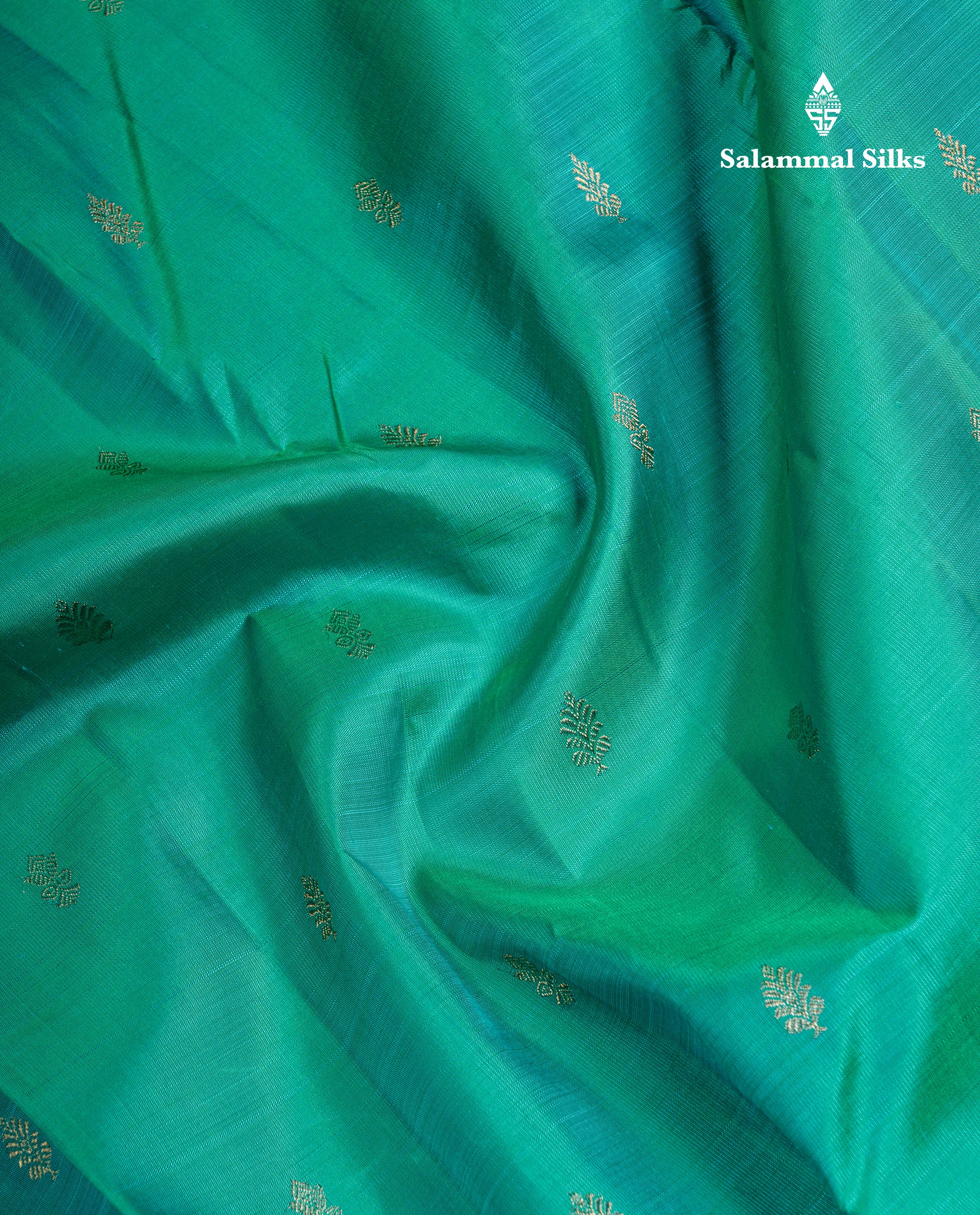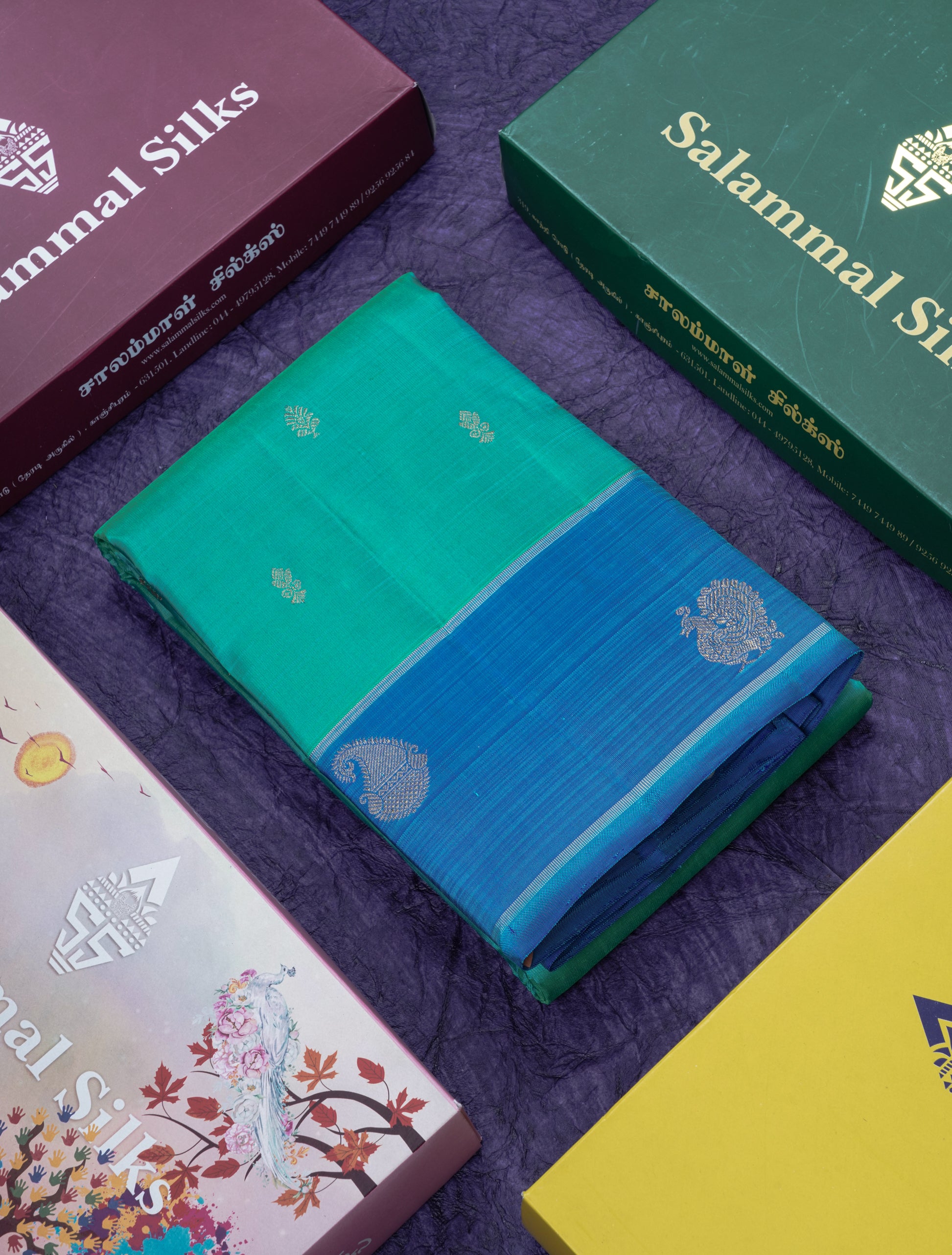 Dual Tone Sapphire Green Pure Kanjivaram Silk Saree Pure Zari with Contrast Blue Traditional Rettapet Border
