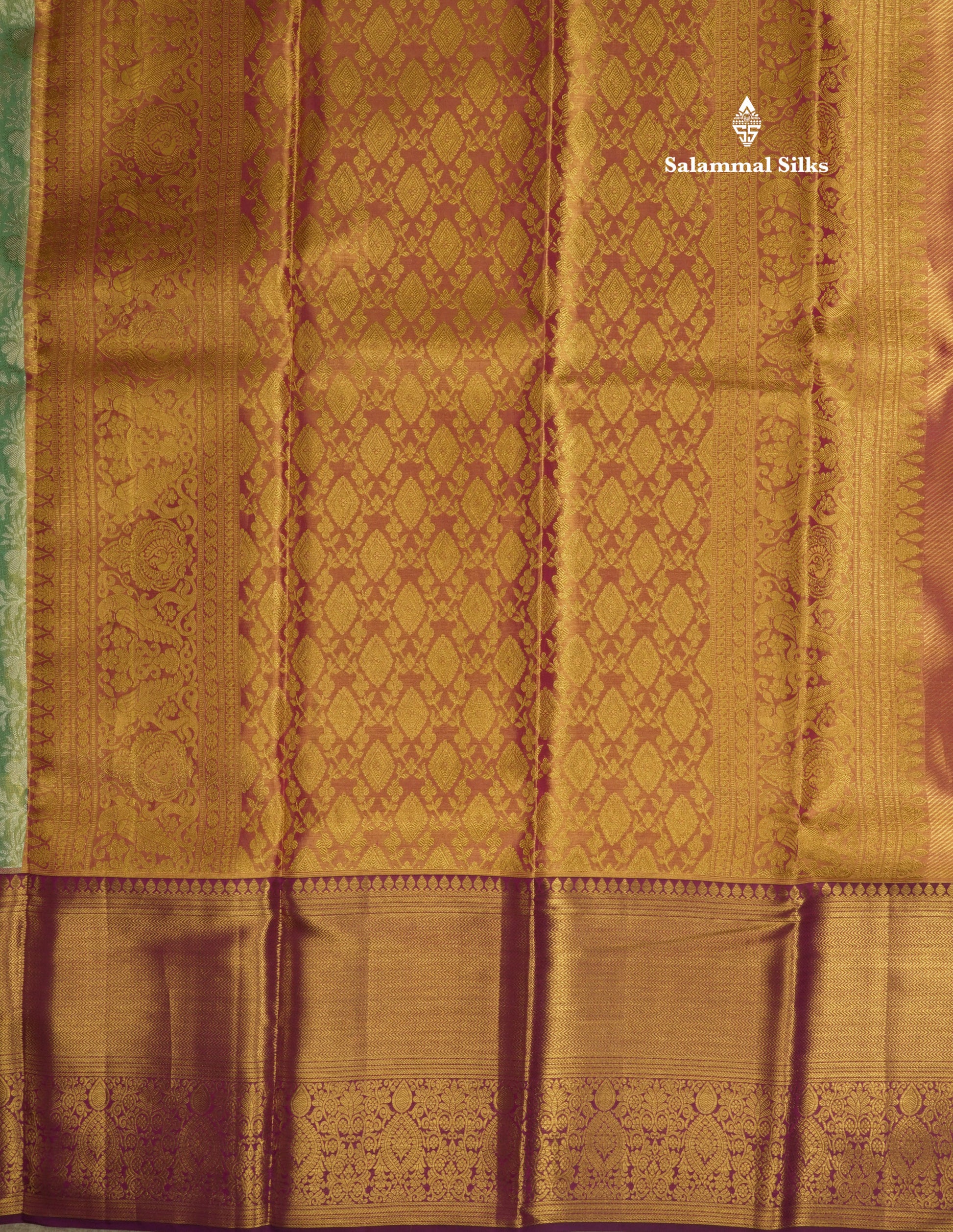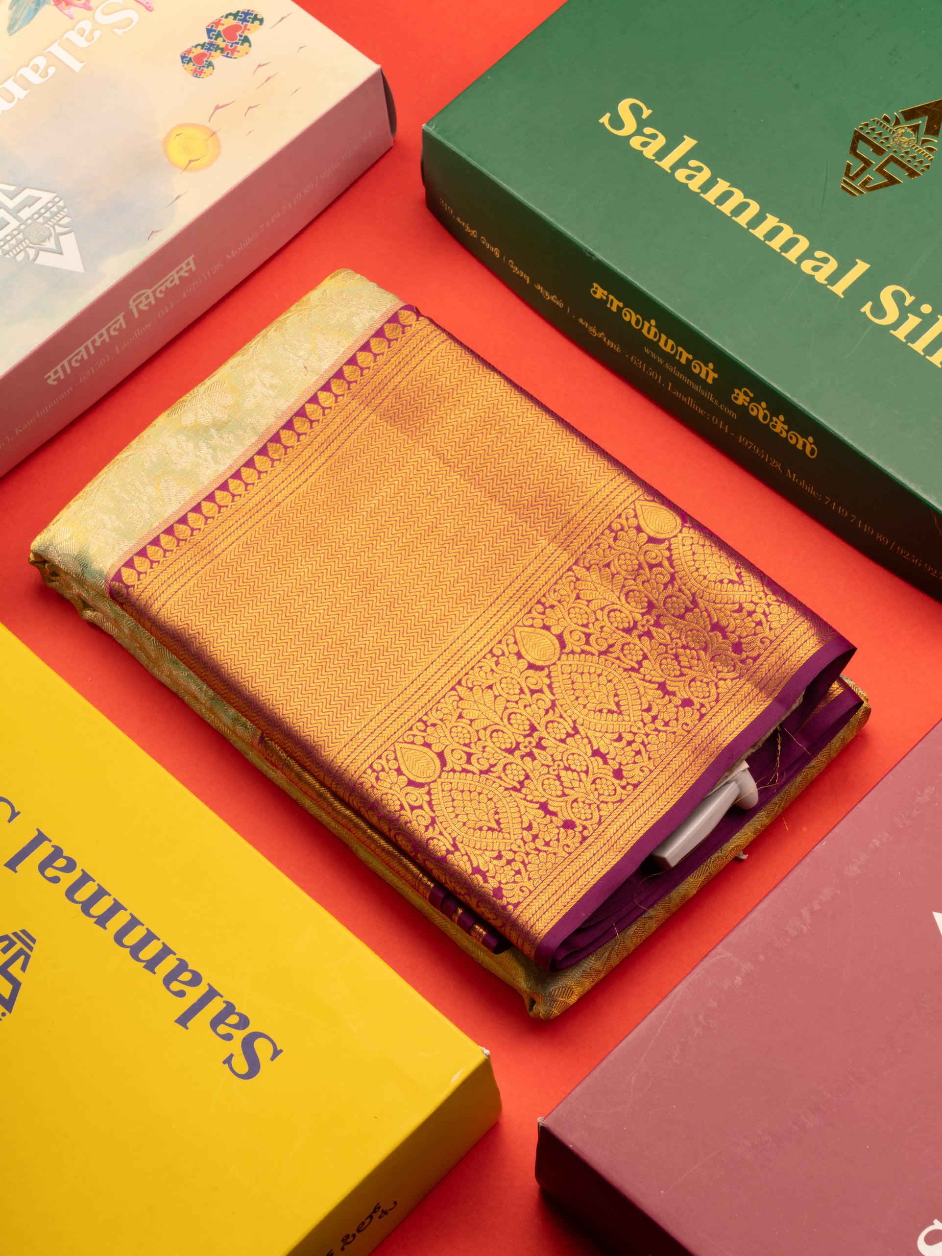 Salammal is known for its handloom sarees. In some sarees, there is cross-weaving between the body and the pallu, which is a sign of pure handloom sarees. This can be seen in Kanchipuram embossed sarees.
