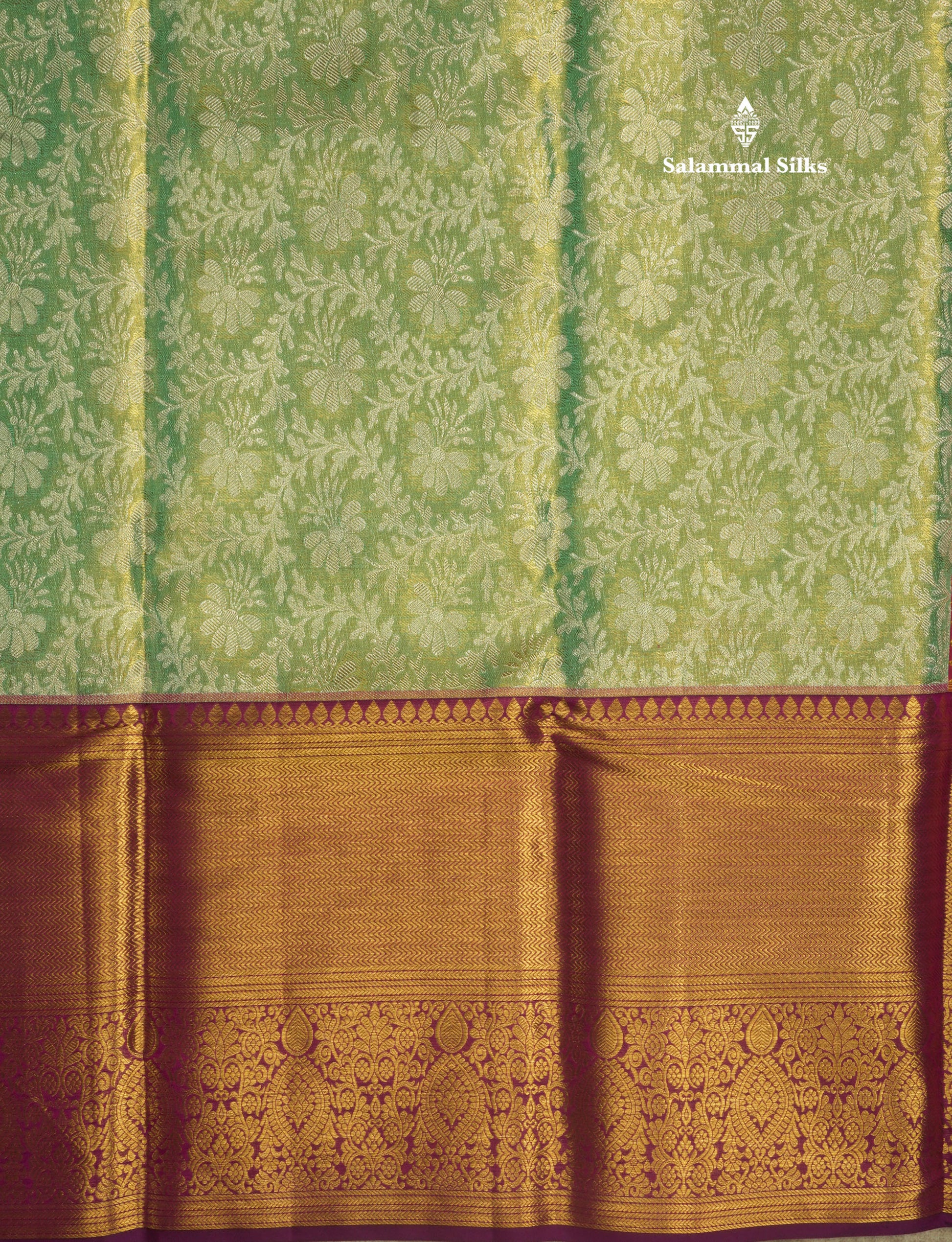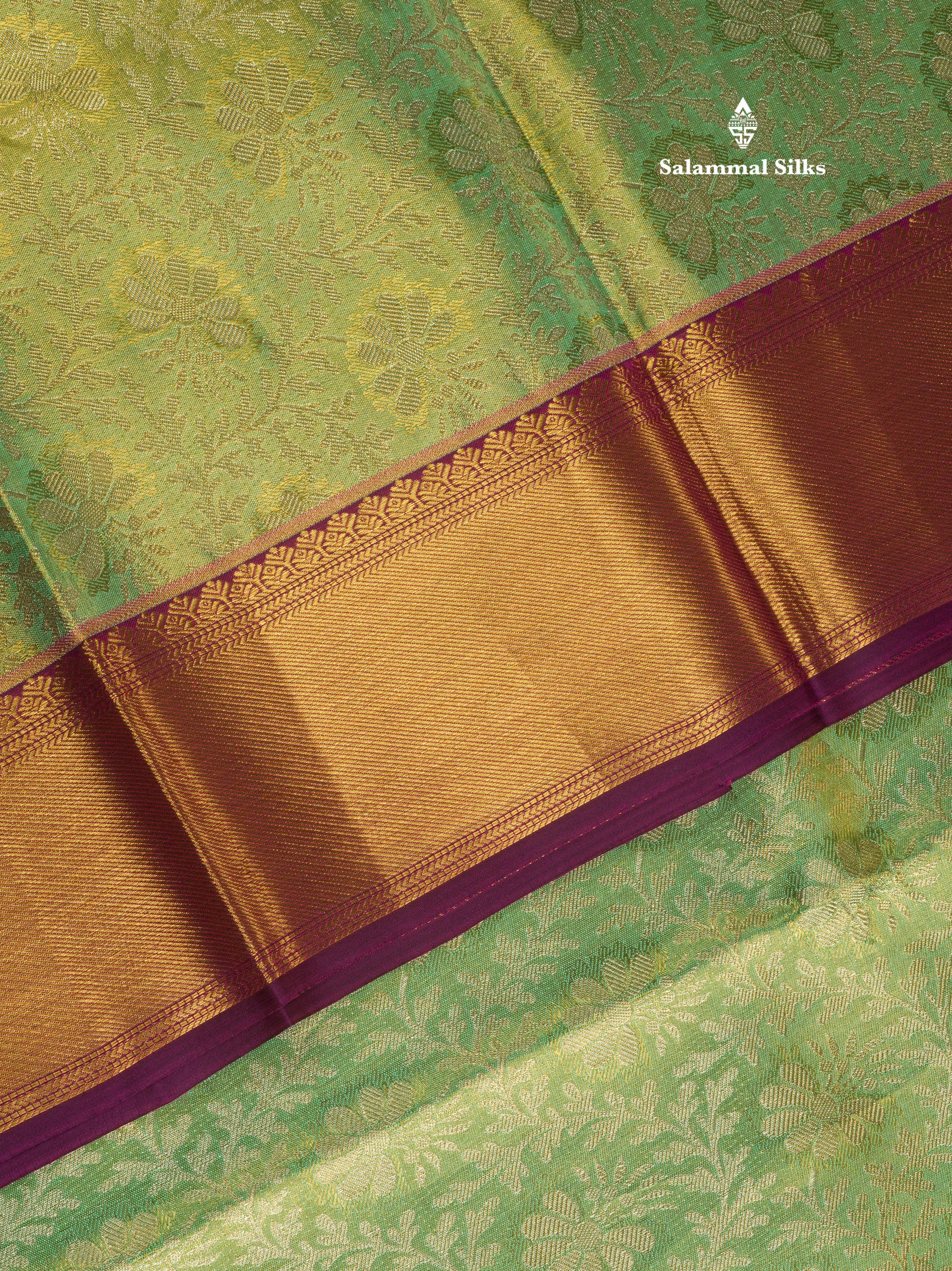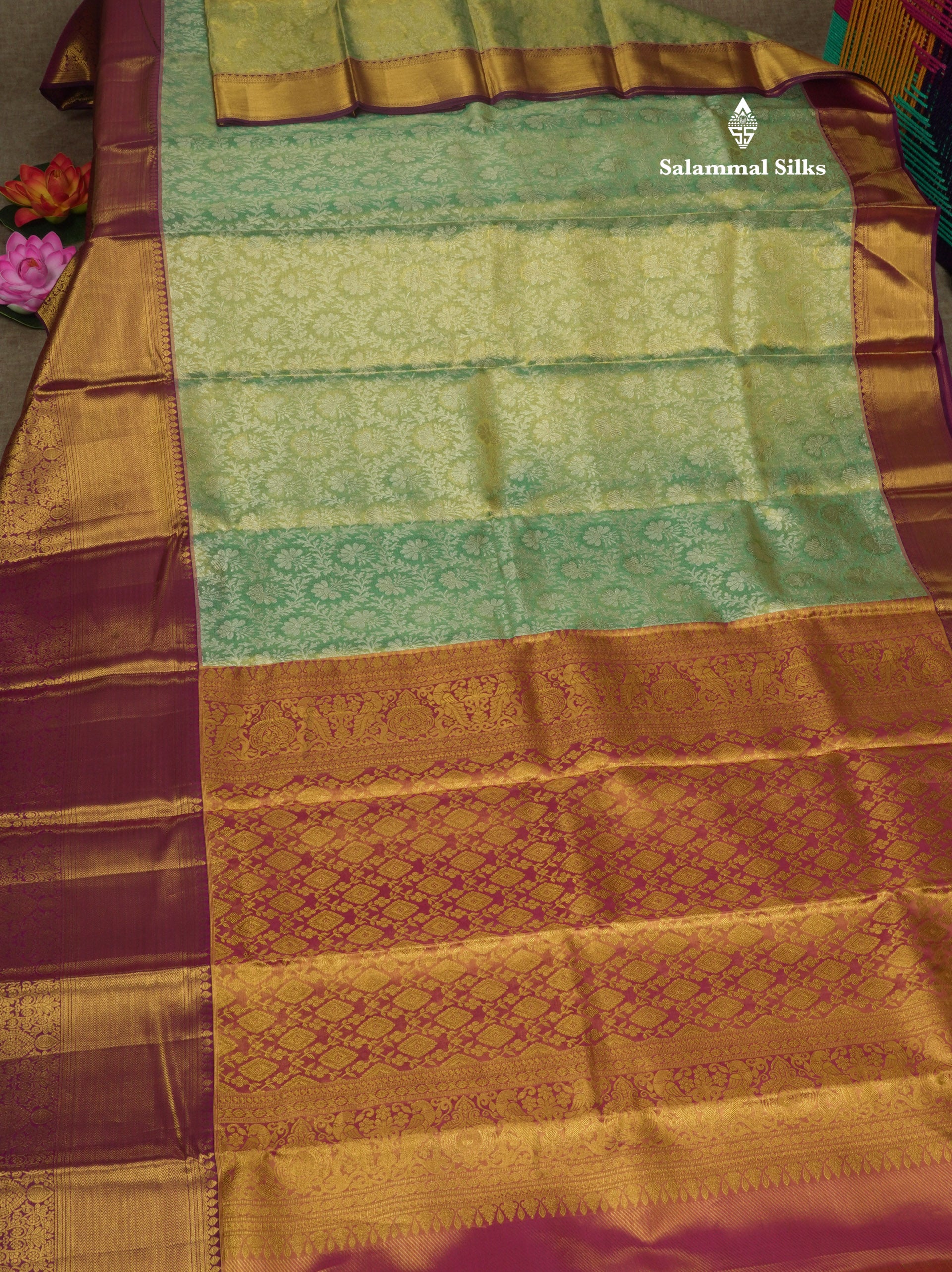 Korvai Elaichi Green Beautiful Tissue Bridal Pure Silk Saree With Magenta Border