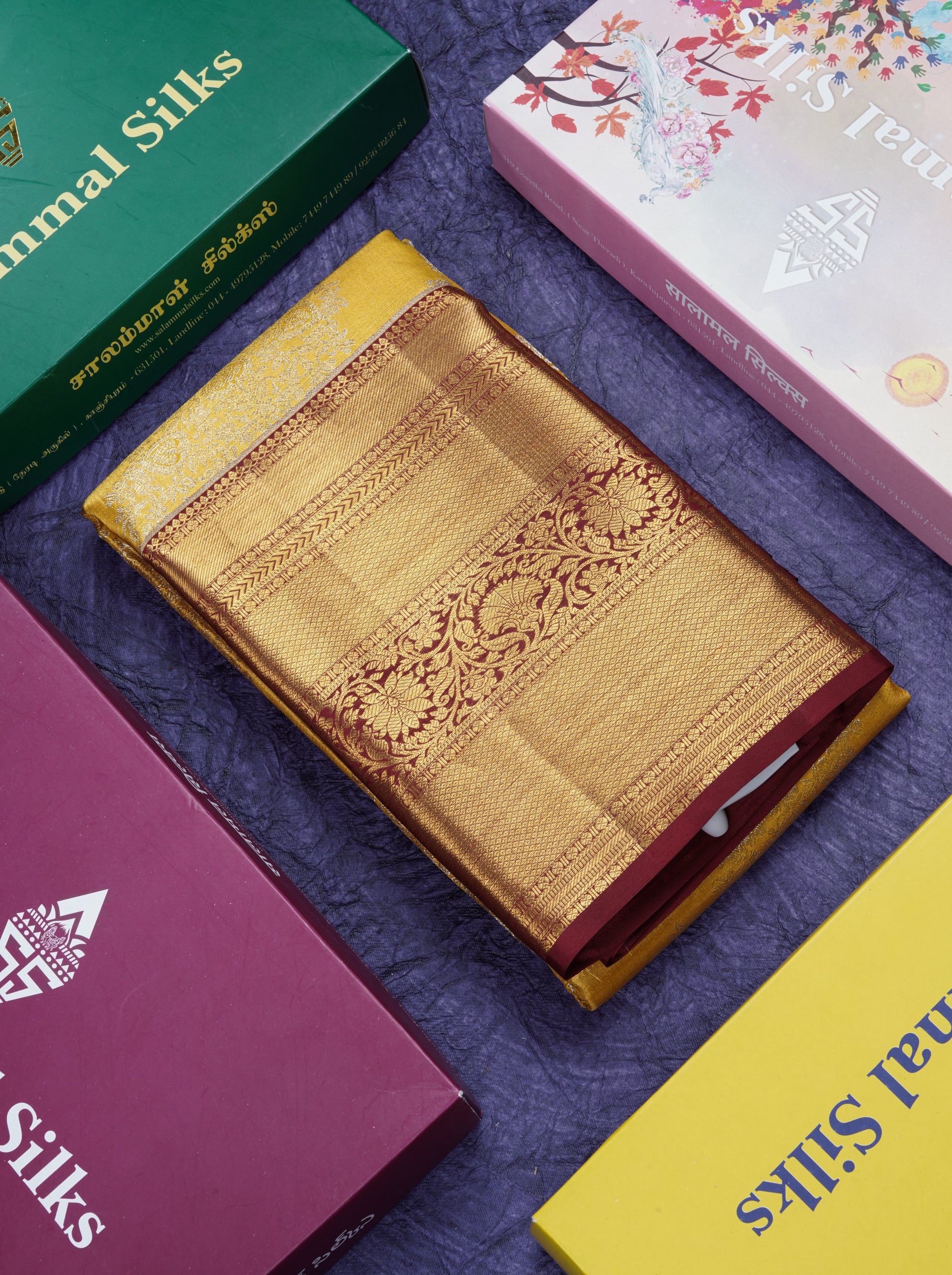 Golden Yellow Beautiful Bridal Pure Kanjivaram Silk Saree With Maroon Traditional Evening Morning Border