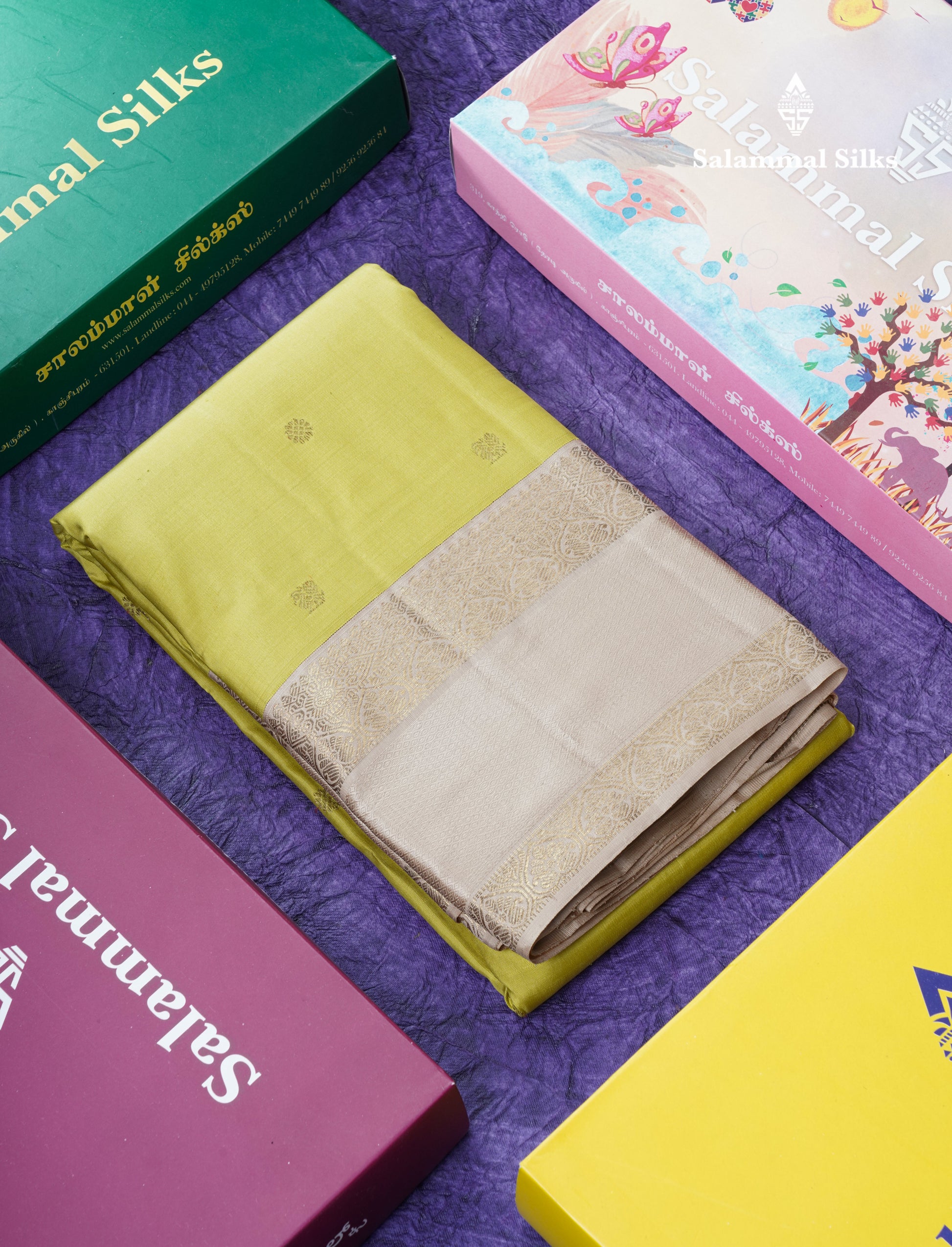 Golden Yellow Beautiful Small Buttas Pure Kanjivaram Silk Saree Pure Zari with Traditional Cream Double Border