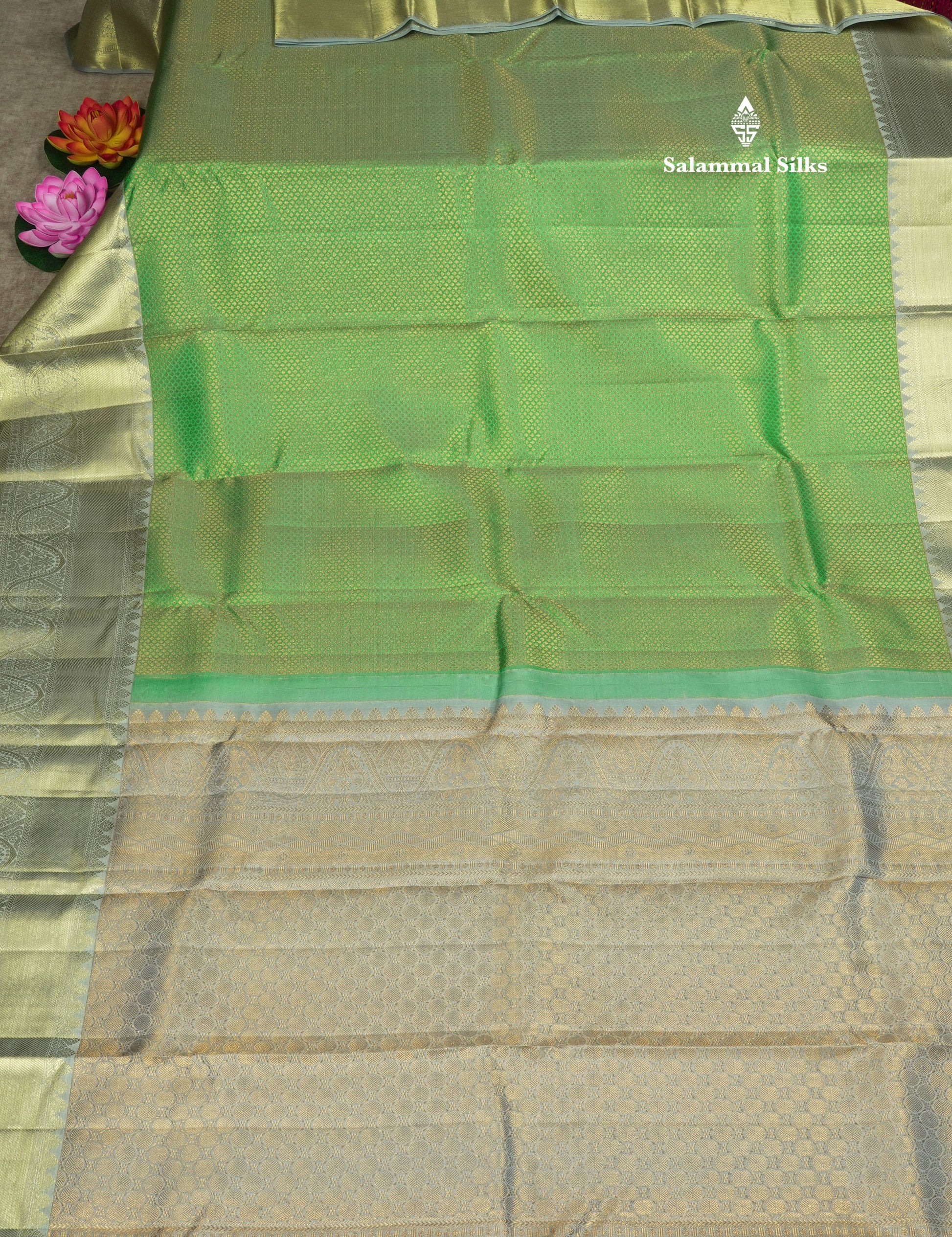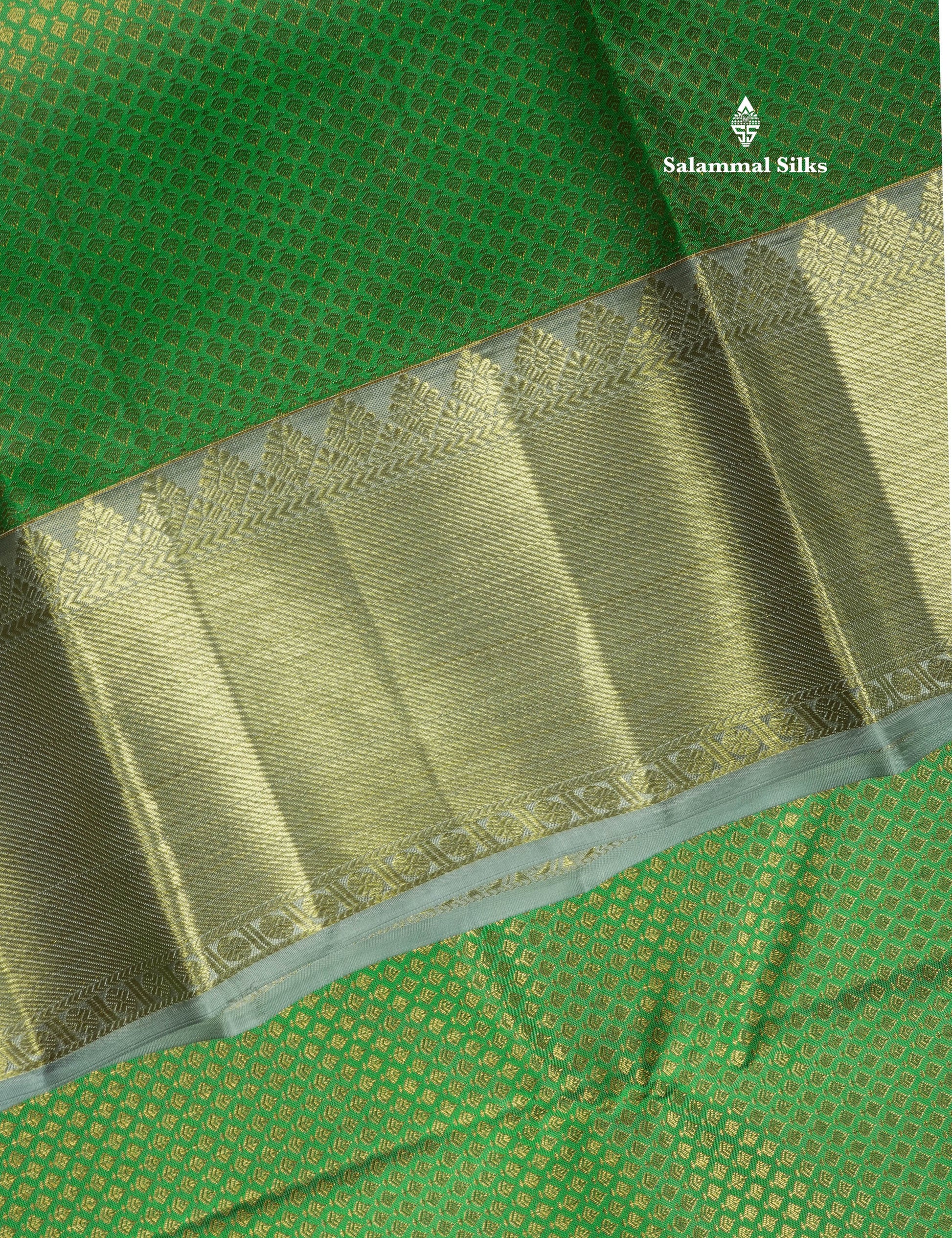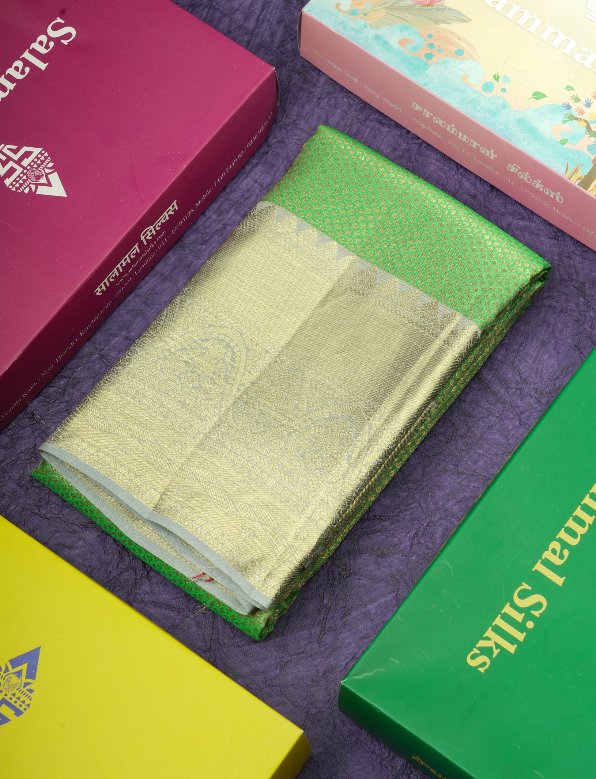 Salammal is known for its handloom sarees. In some sarees, there is cross-weaving between the body and the pallu, which is a sign of pure handloom sarees. This can be seen in Kanchipuram embossed sarees.