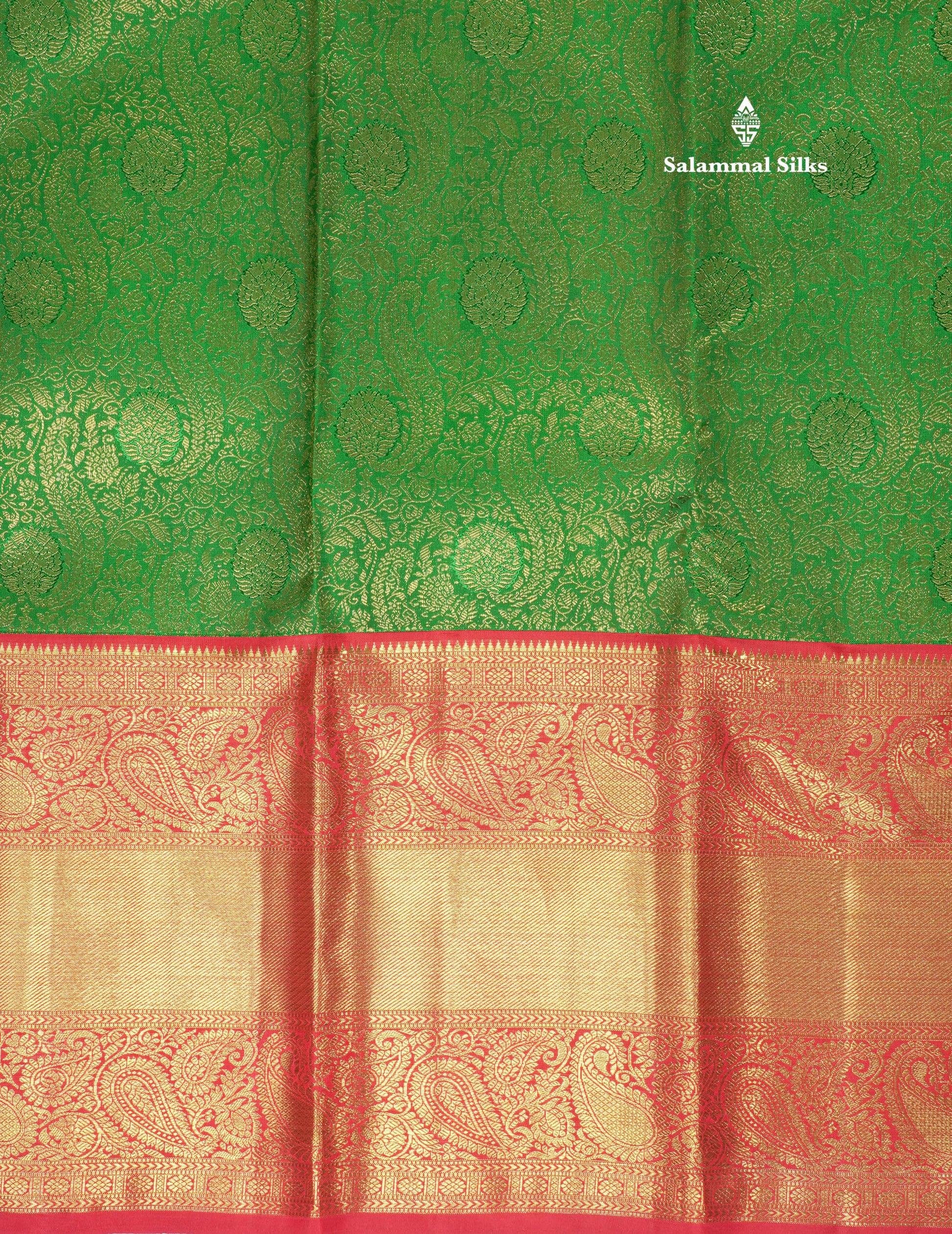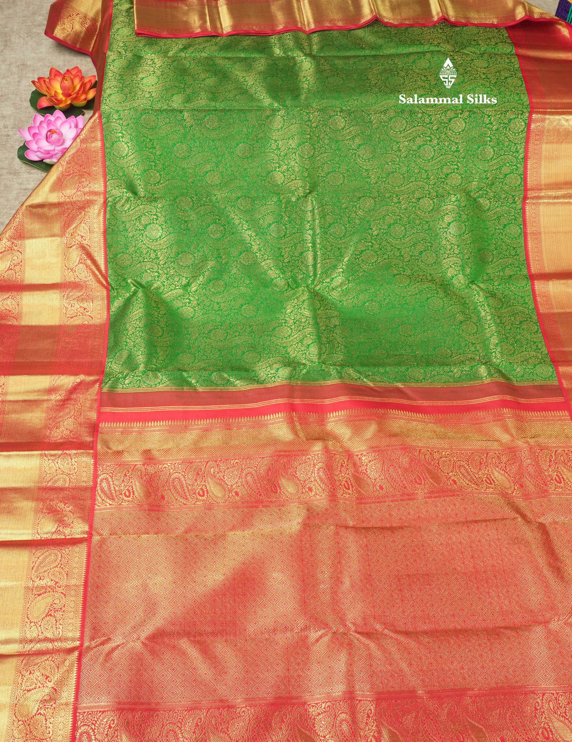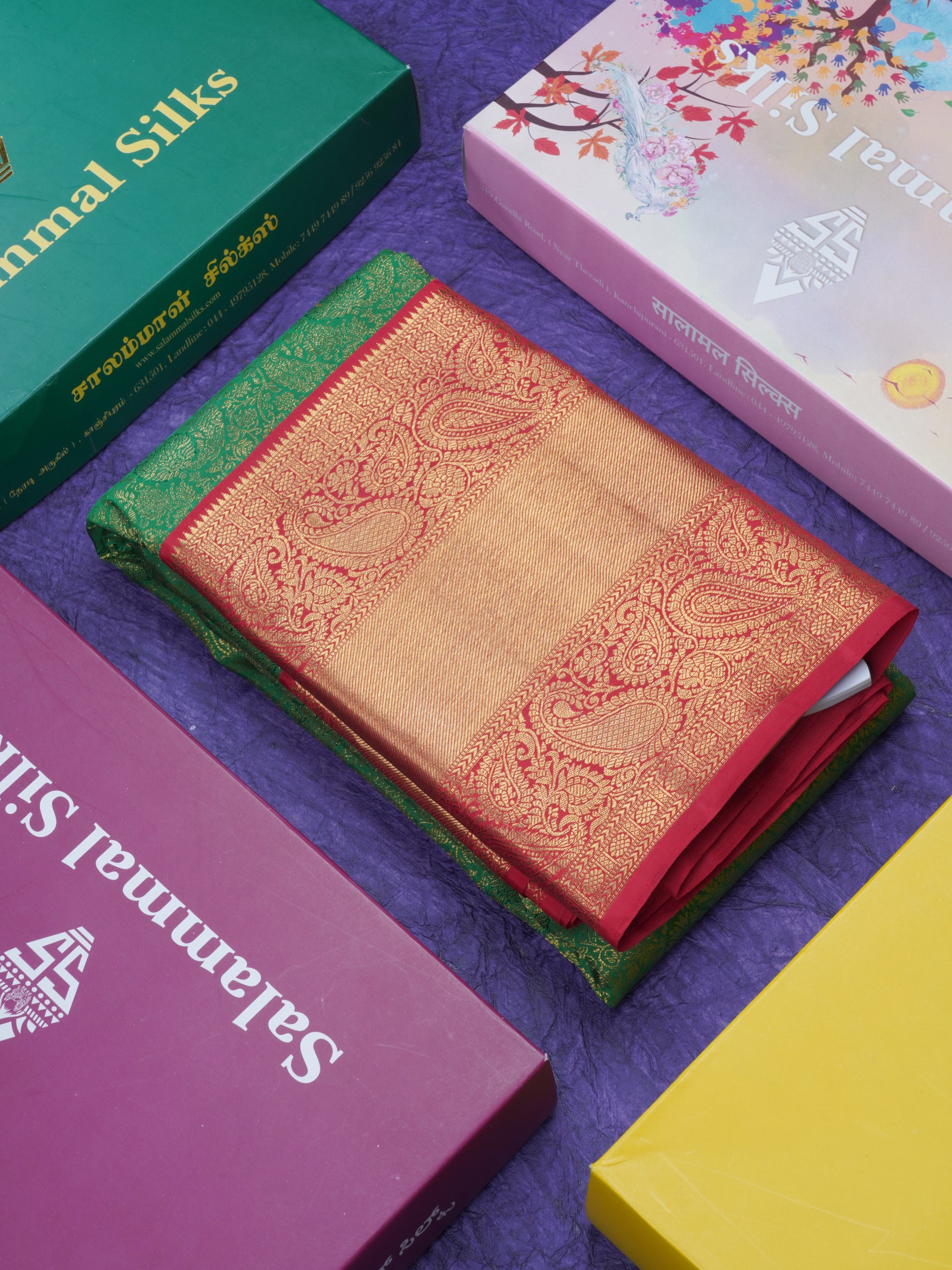 Green Pure Kanjivaram Silk Saree (2G) Zari With Contrast Chilly Red Long Border