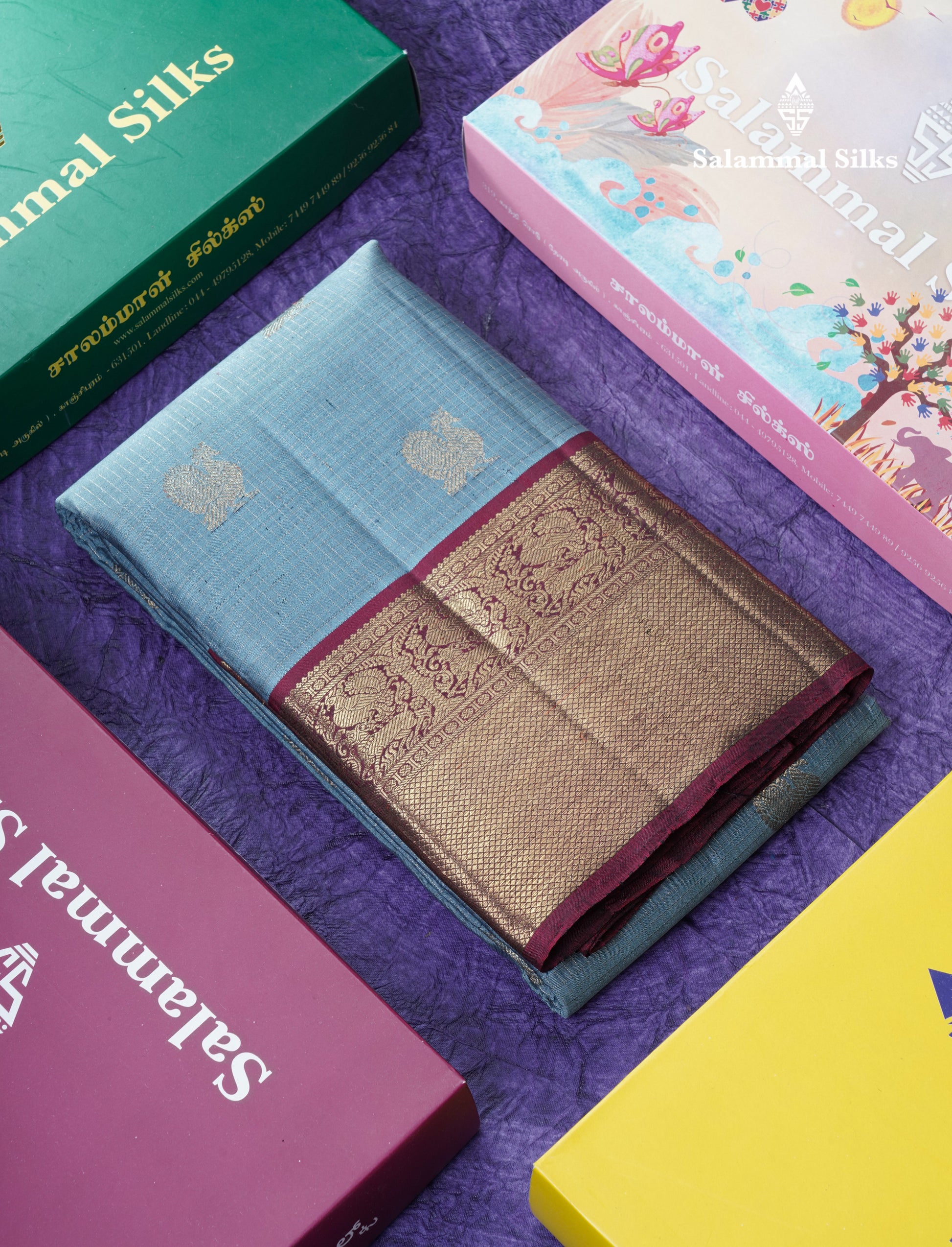 Salammal is known for its handloom sarees. In some sarees, there is cross-weaving between the body and the pallu, which is a sign of pure handloom sarees. This can be seen in Kanchipuram embossed sarees.