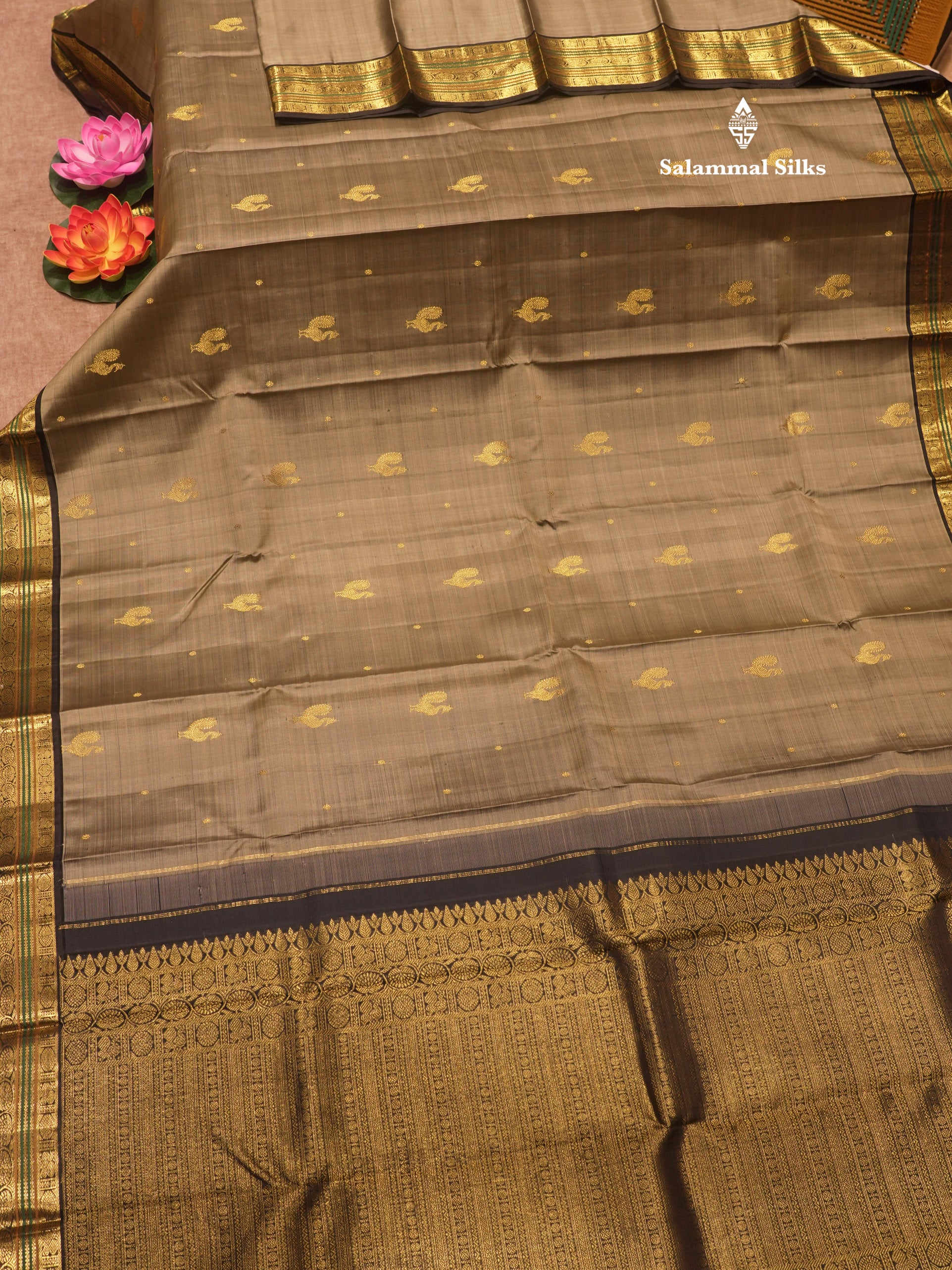 Salammal is known for its handloom sarees. In some sarees, there is cross-weaving between the body and the pallu, which is a sign of pure handloom sarees. This can be seen in Kanchipuram embossed sarees.