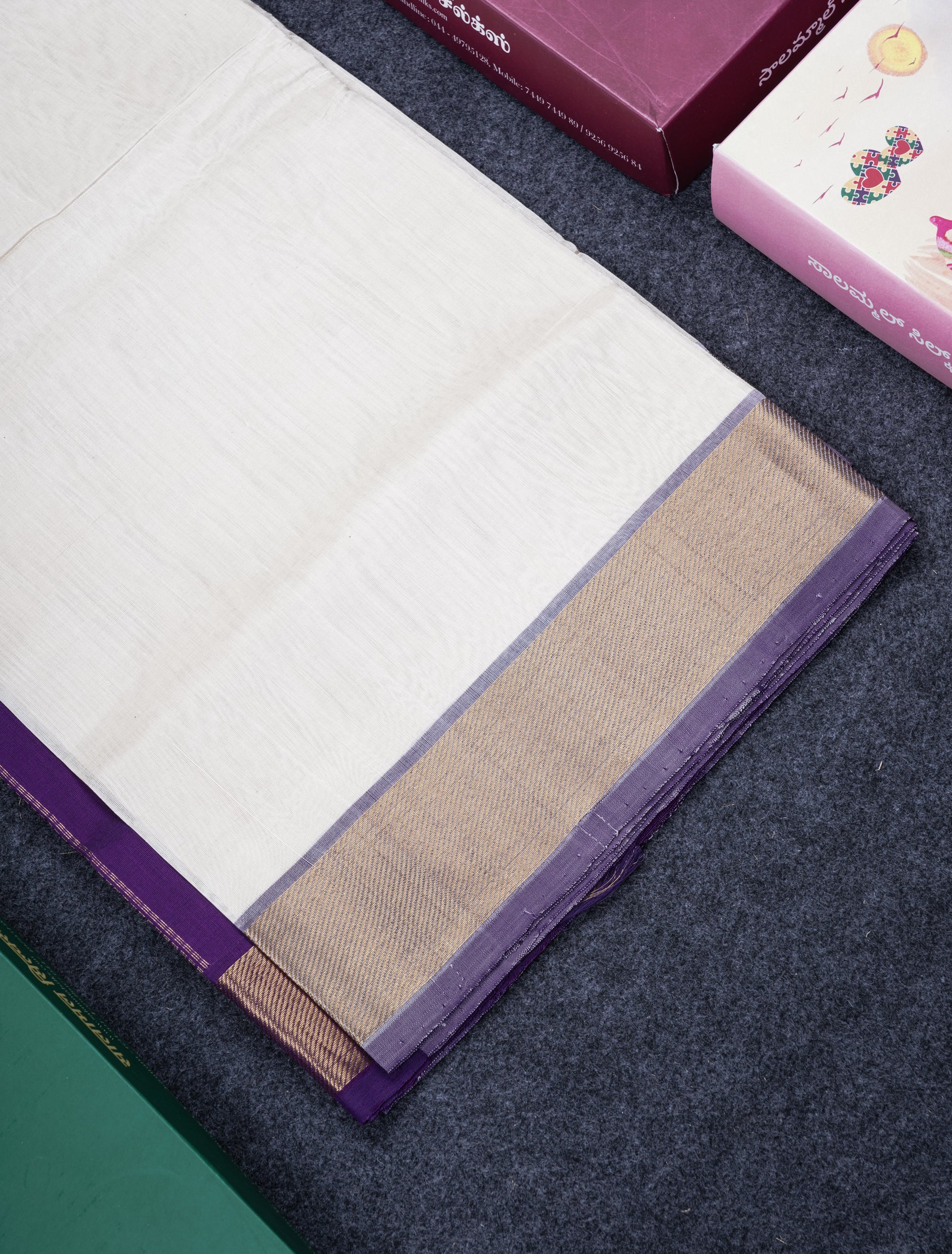 Half White Plain Pure Silk Cotton Saree With Contrast Purple Blouse
