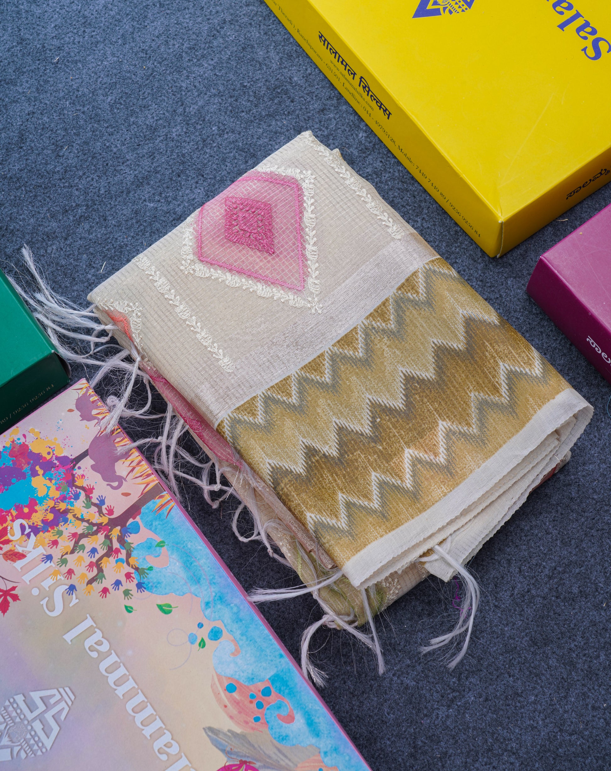 Salammal is known for its handloom sarees. In some sarees, there is cross-weaving between the body and the pallu, which is a sign of pure handloom sarees. This can be seen in Kanchipuram embossed sarees.