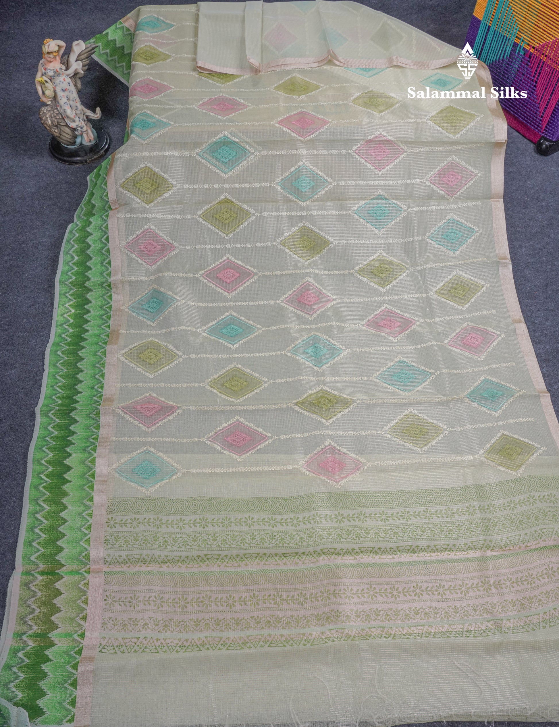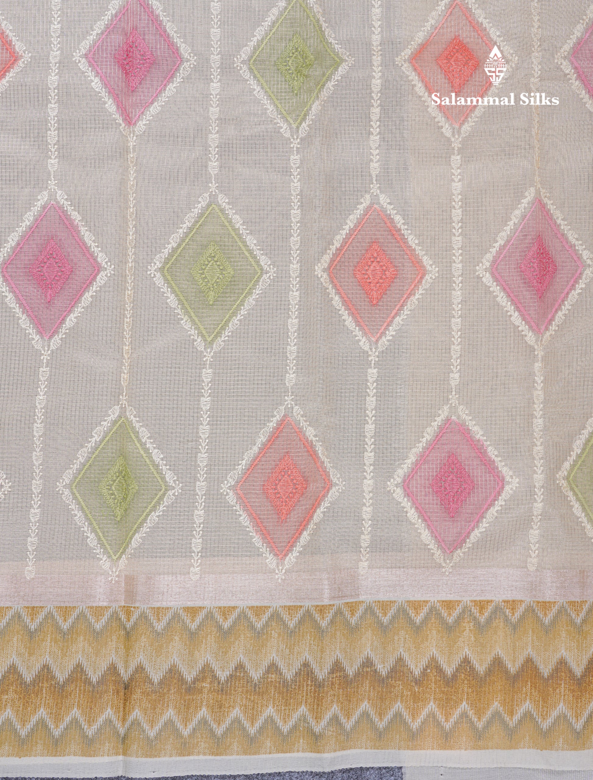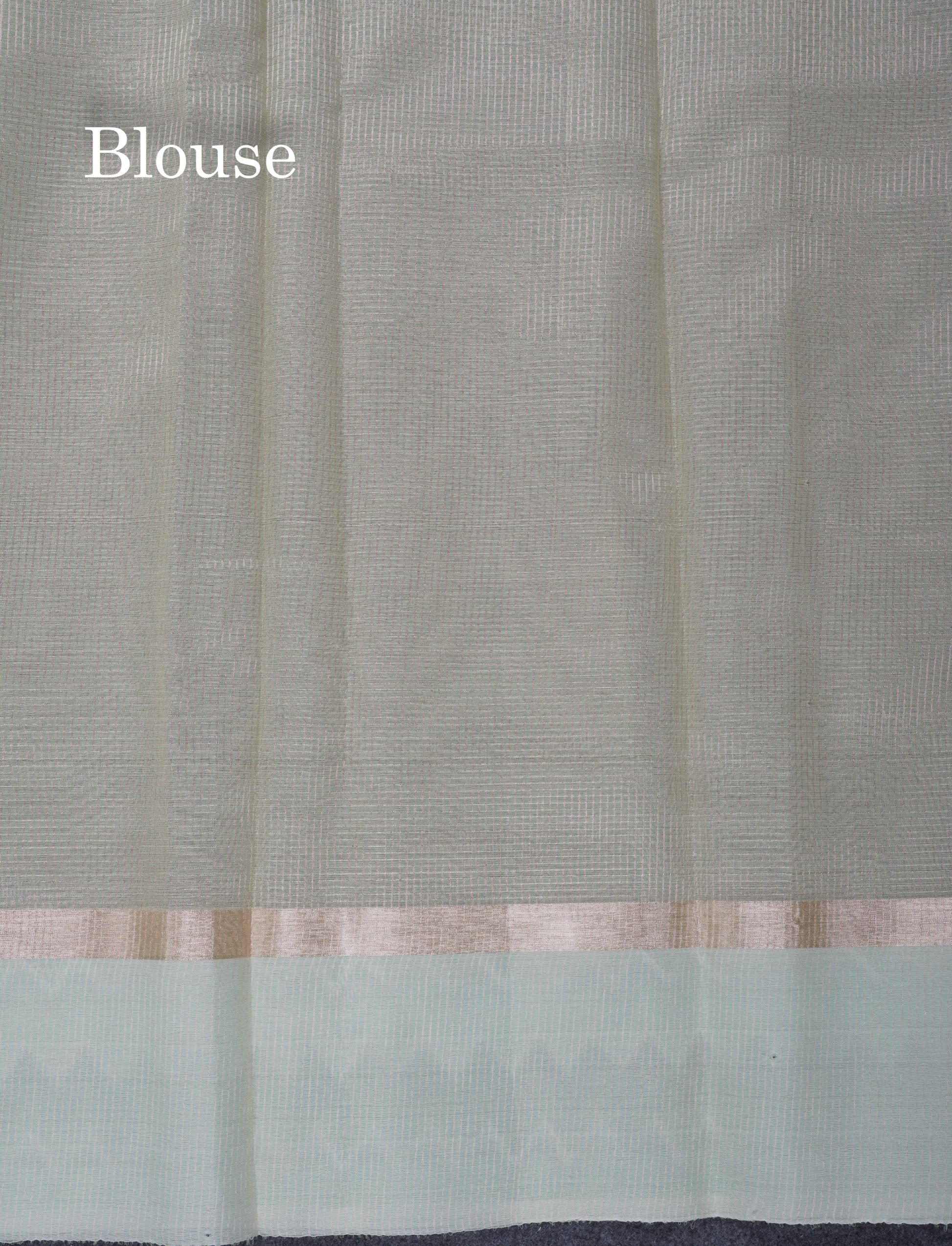 Half White Tiny Zari Checks Embroidery Work Fancy Tissue Kota Saree With Contrast Brown Border