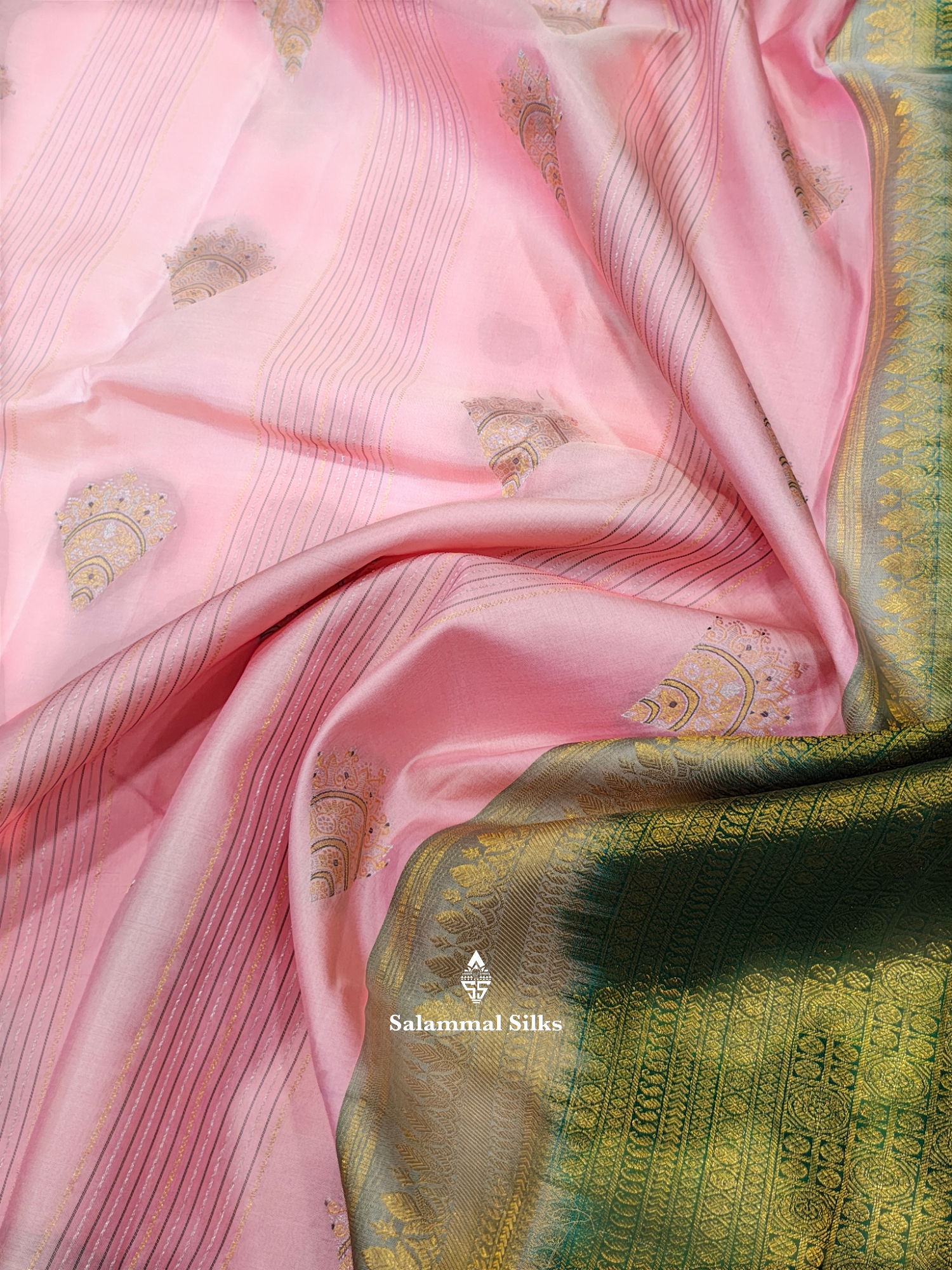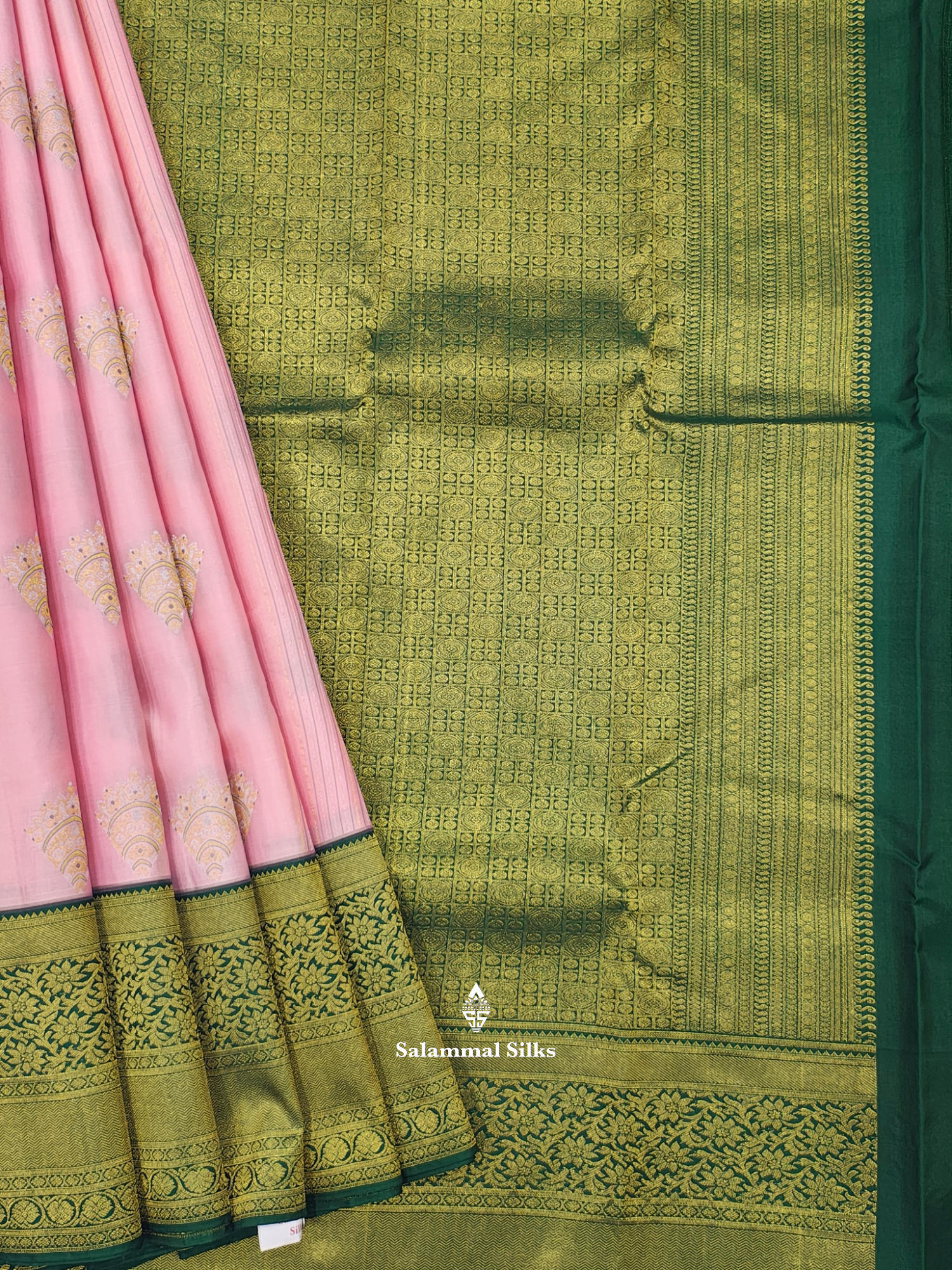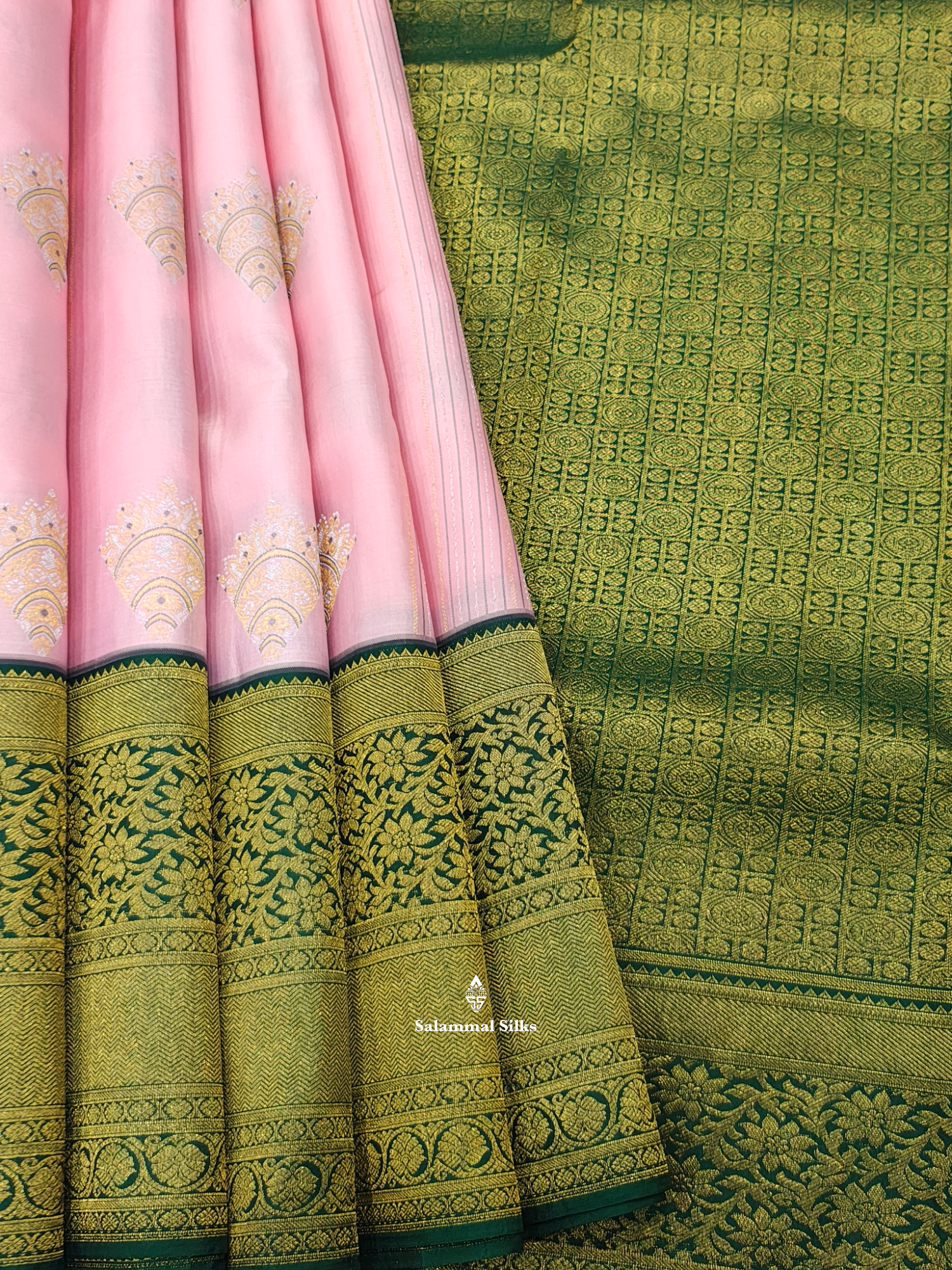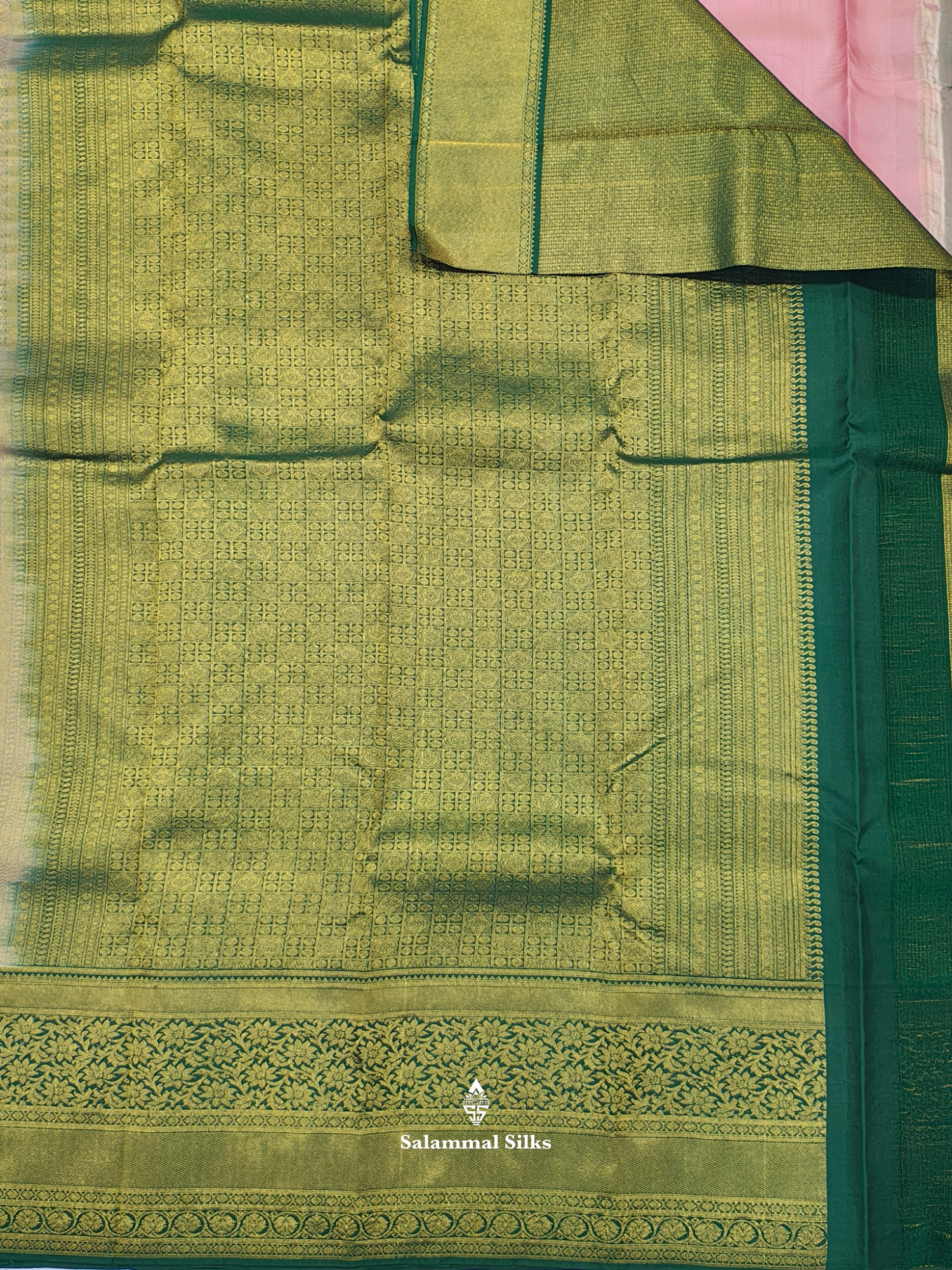 Kanjivaram Baby Pink Fancy Pure Silk Saree With Bottle Green Border
