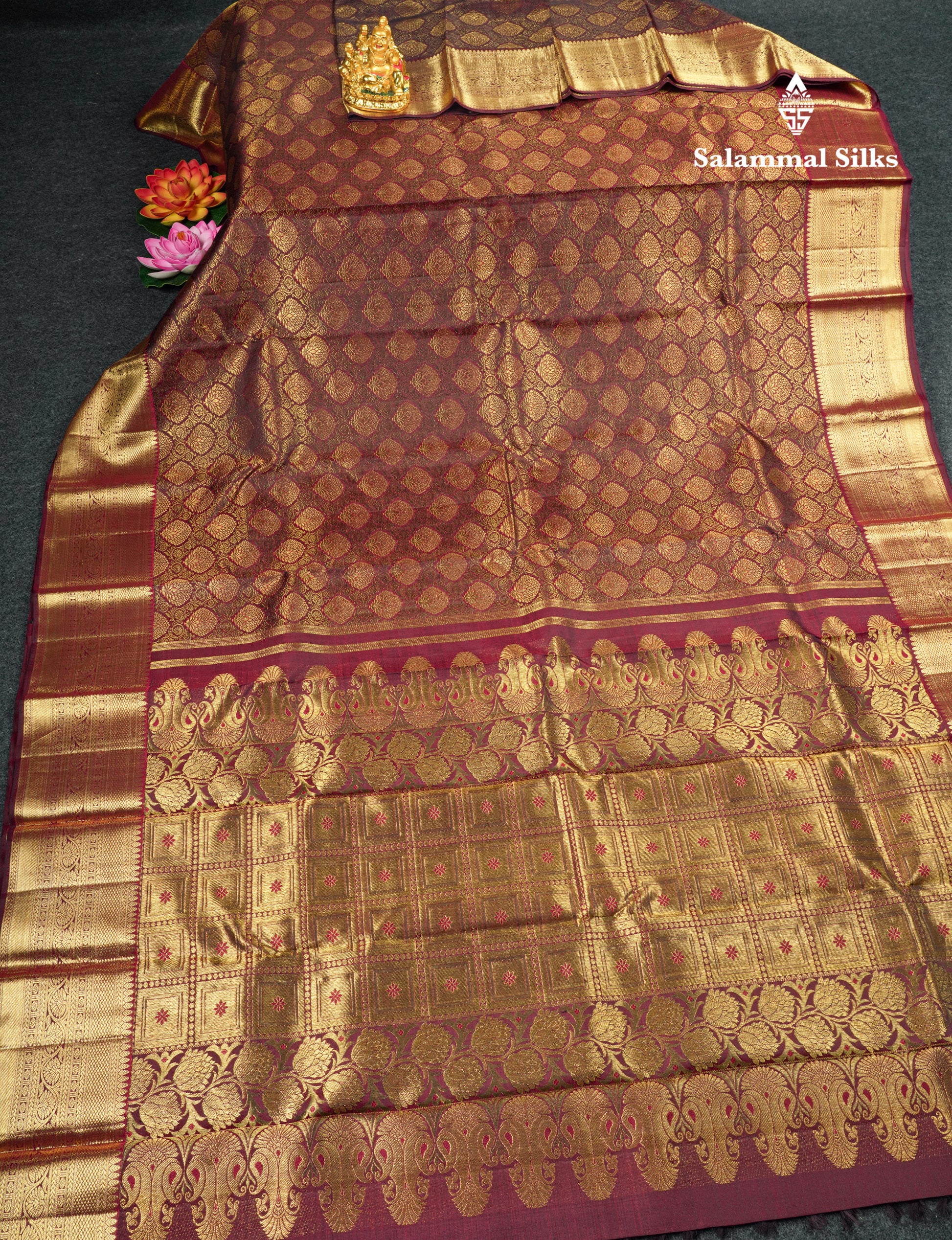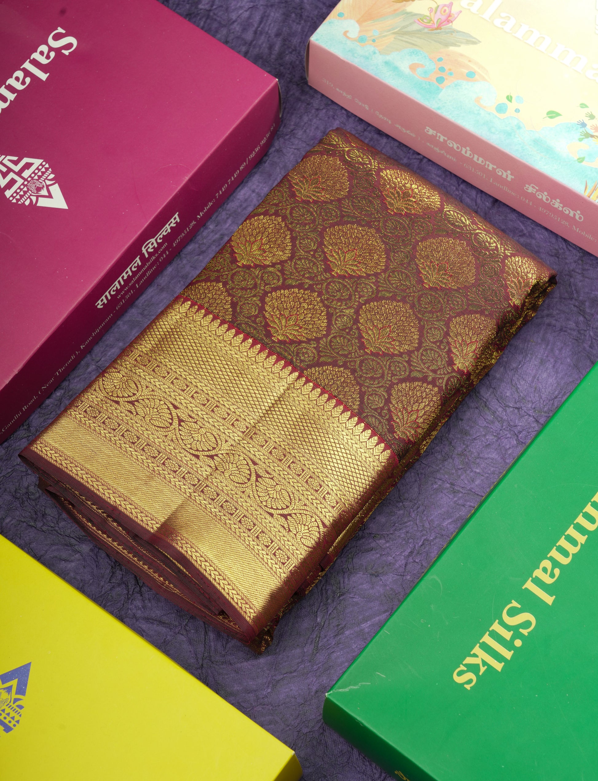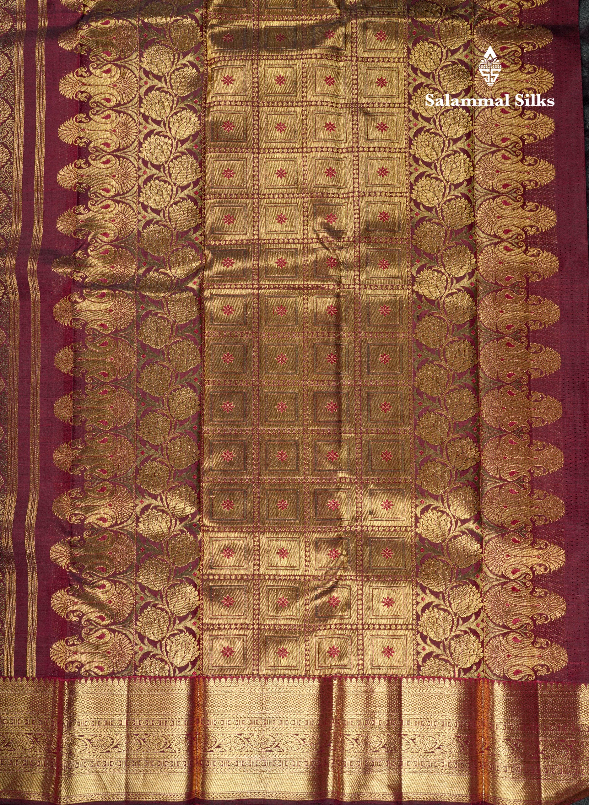 Salammal is known for its handloom sarees. In some sarees, there is cross-weaving between the body and the pallu, which is a sign of pure handloom sarees. This can be seen in Kanchipuram embossed sarees.