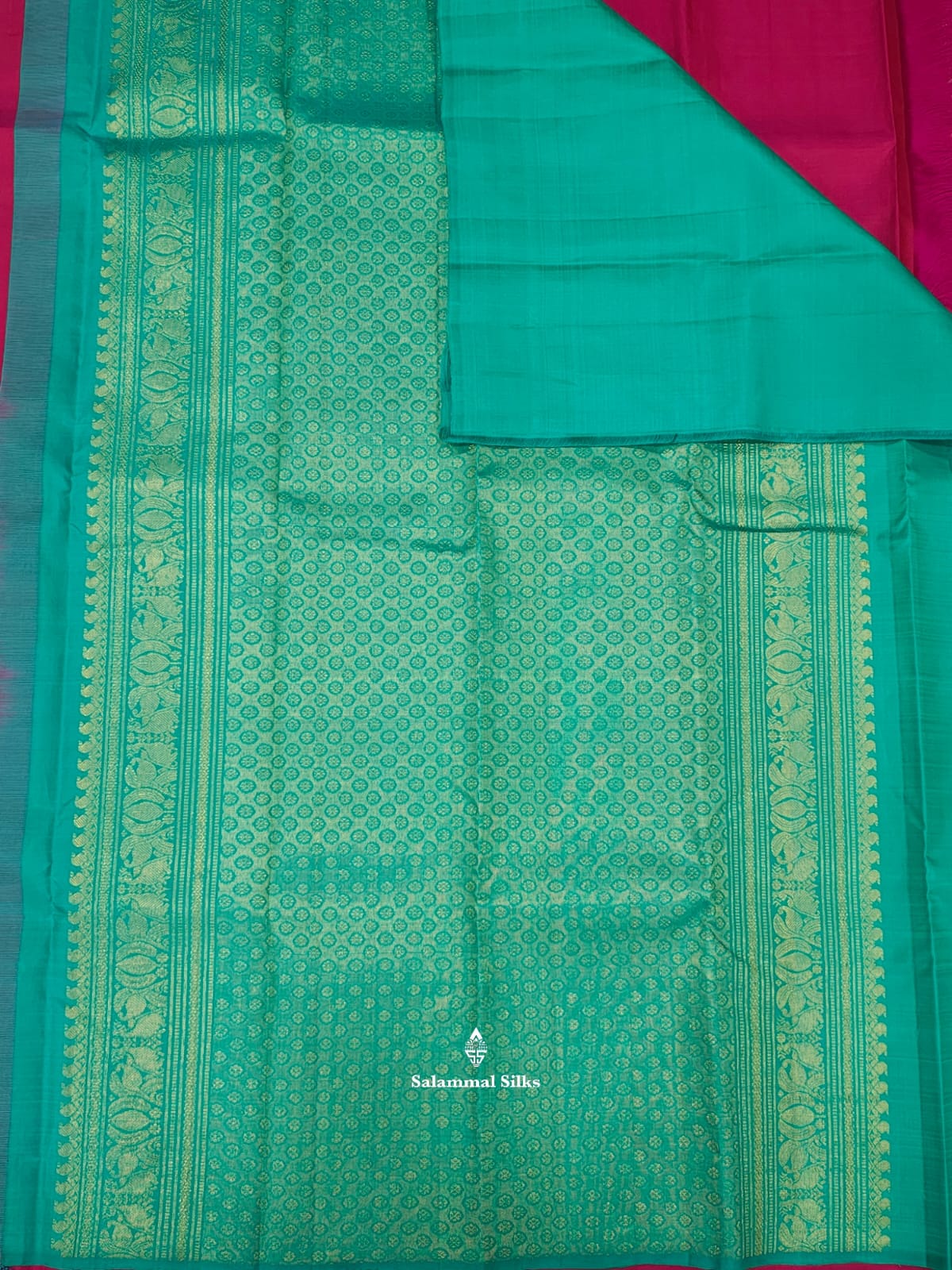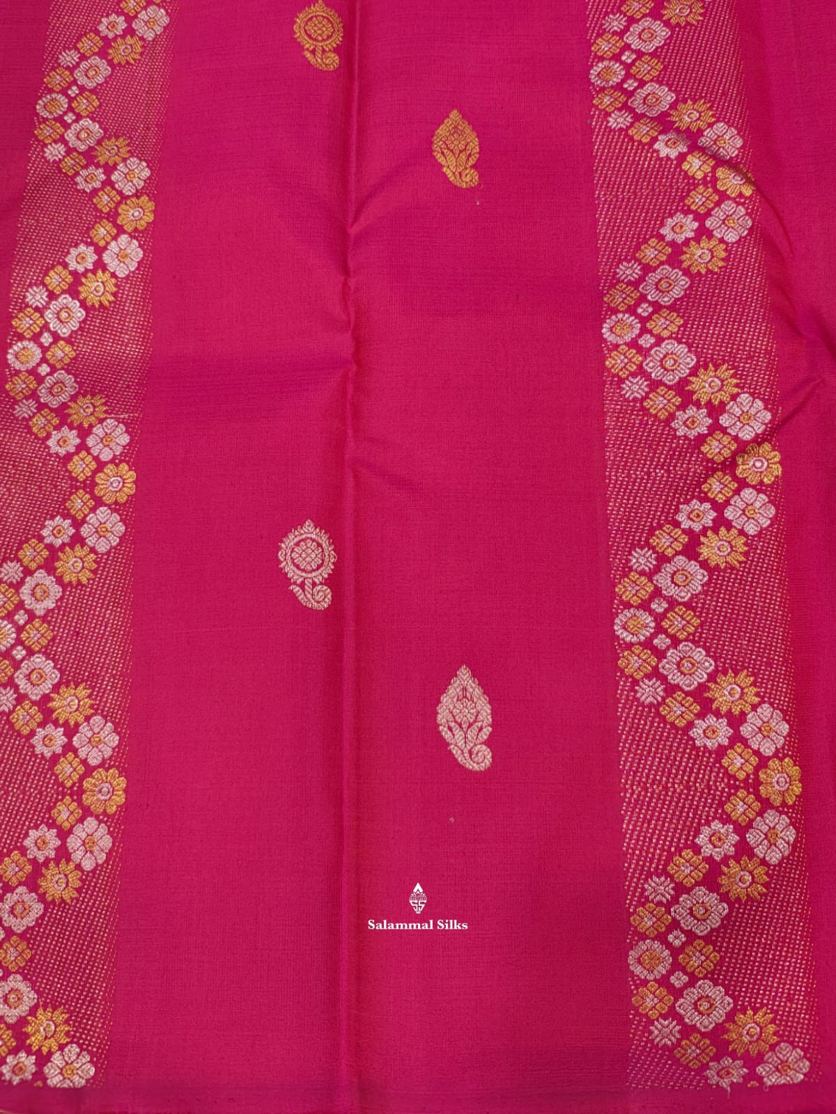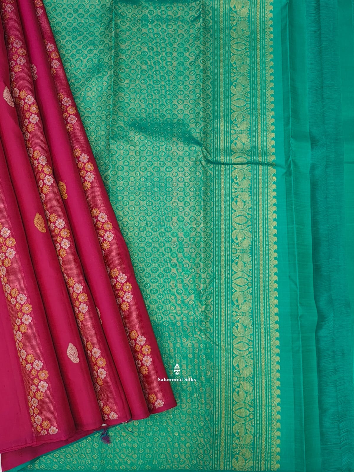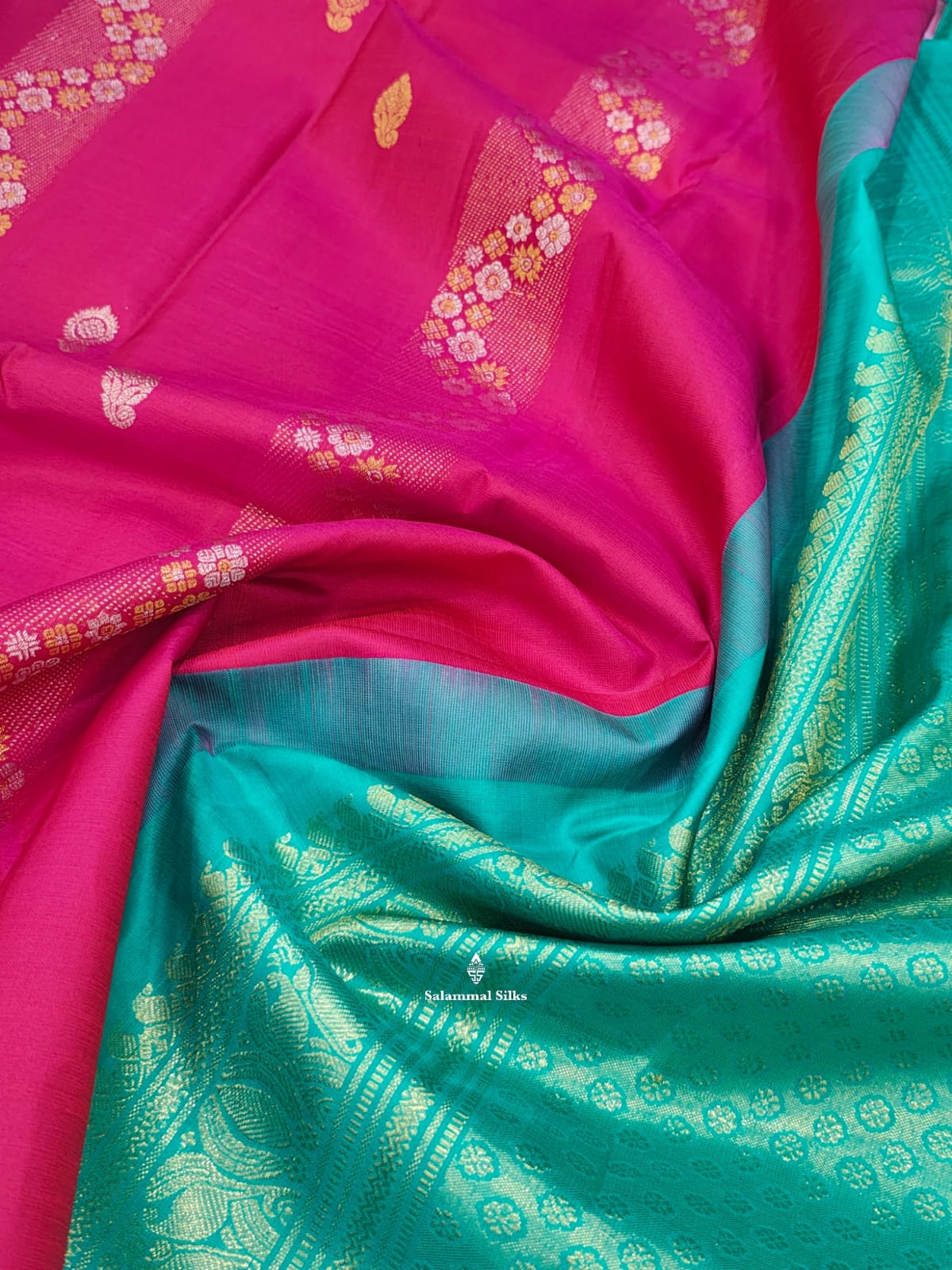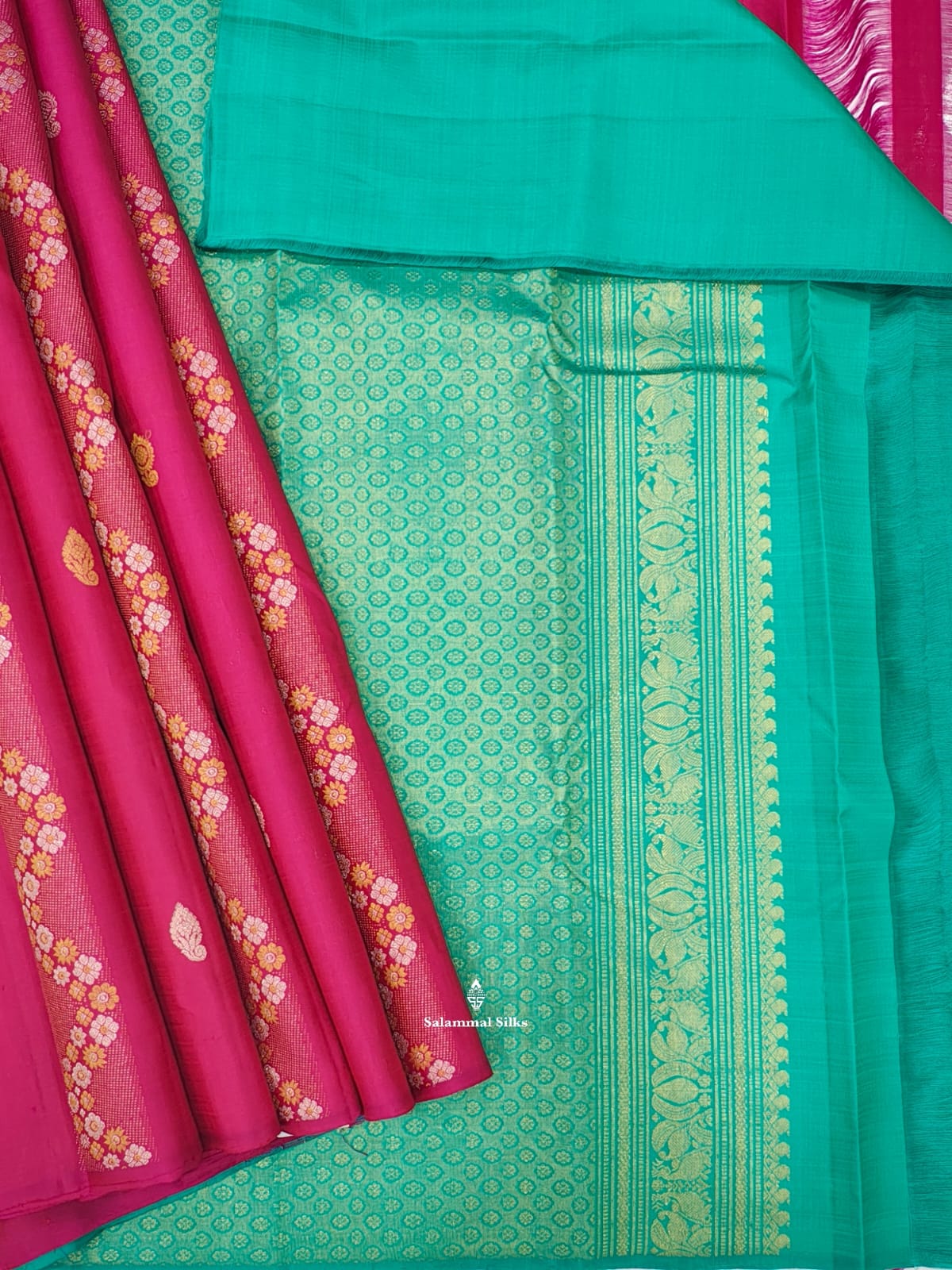 Salammal is known for its handloom sarees. In some sarees, there is cross-weaving between the body and the pallu, which is a sign of pure handloom sarees. This can be seen in Kanchipuram embossed sarees.