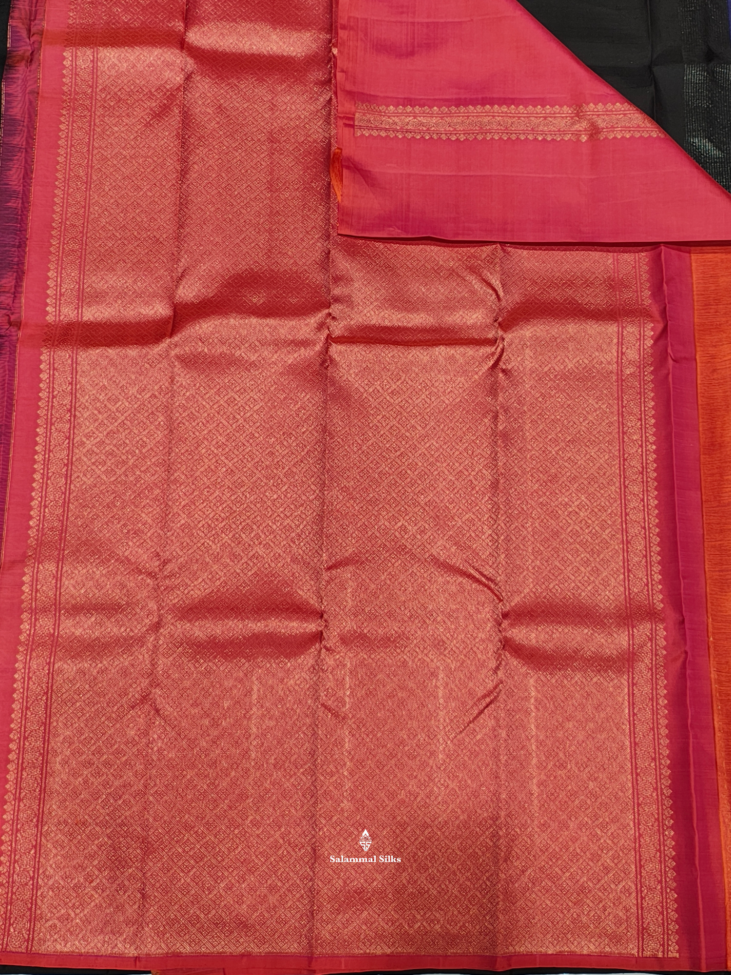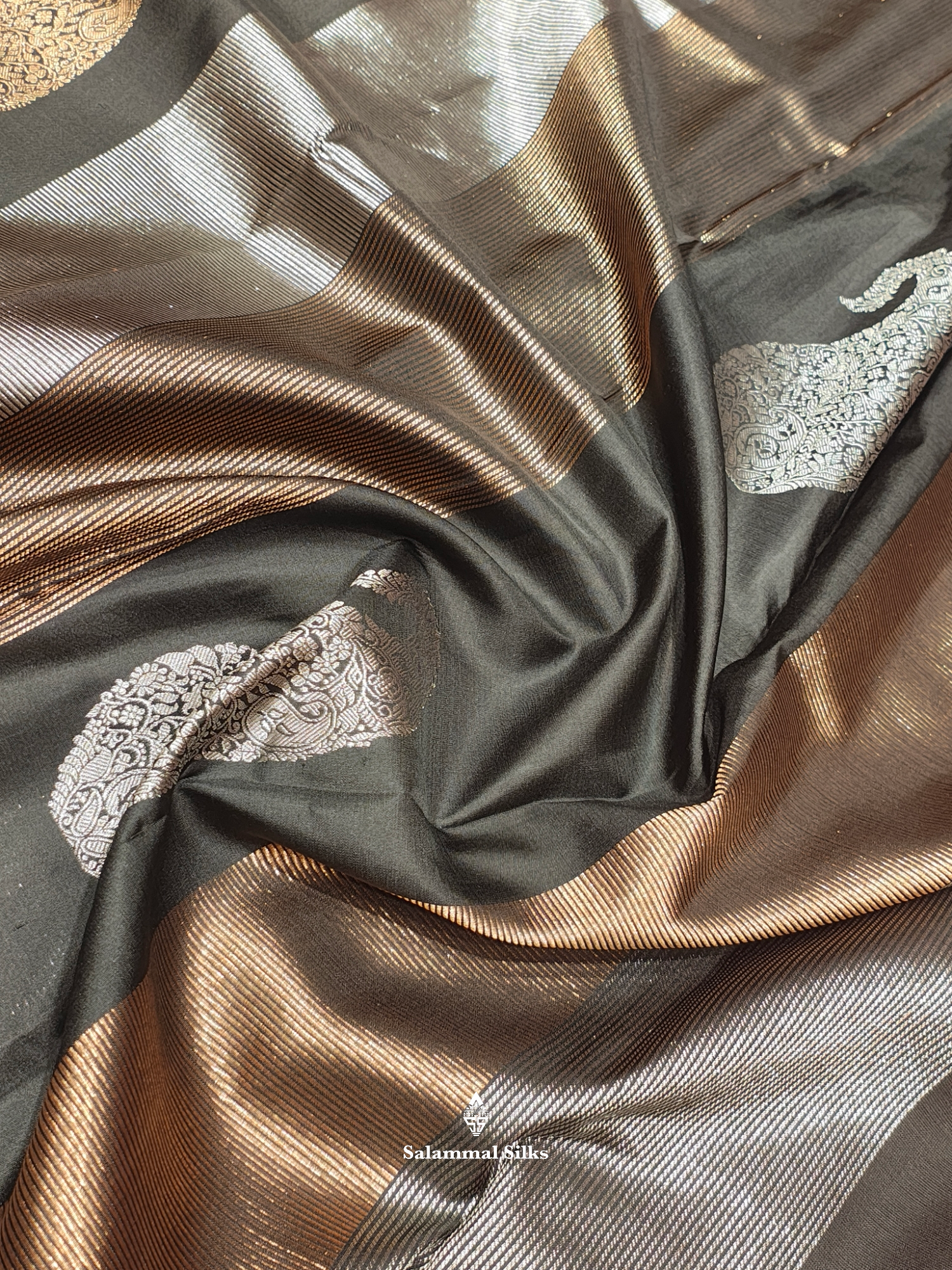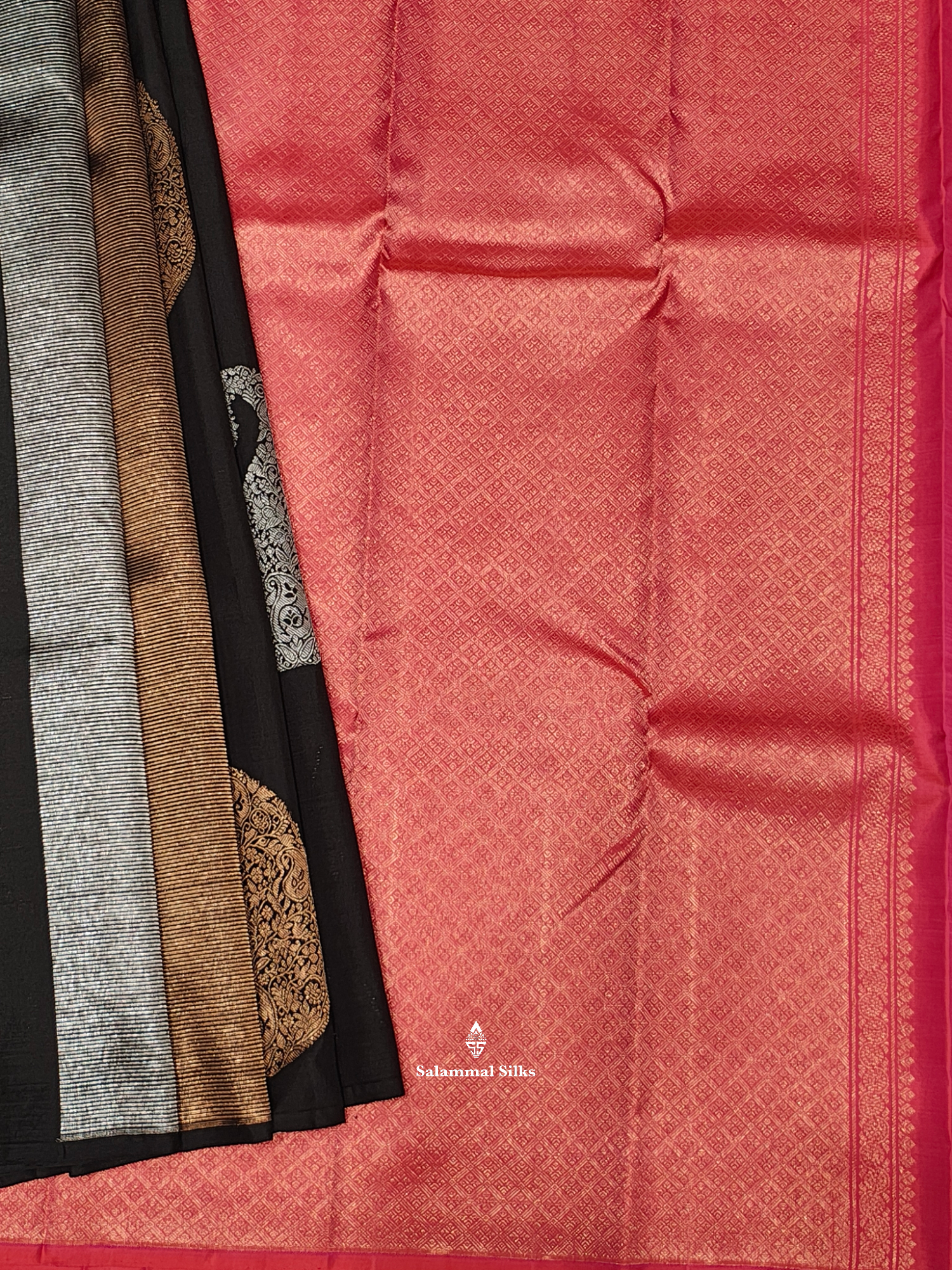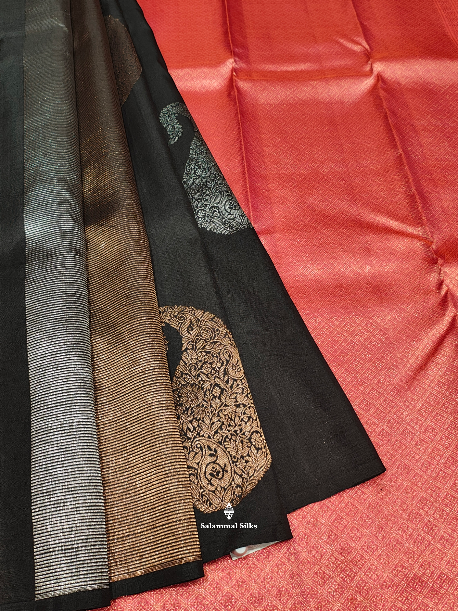 Kanjivaram Black Beautiful Silver And Copper big Mongo Buttas Fancy Pure Silk Saree With Pinkish Orange Blouse