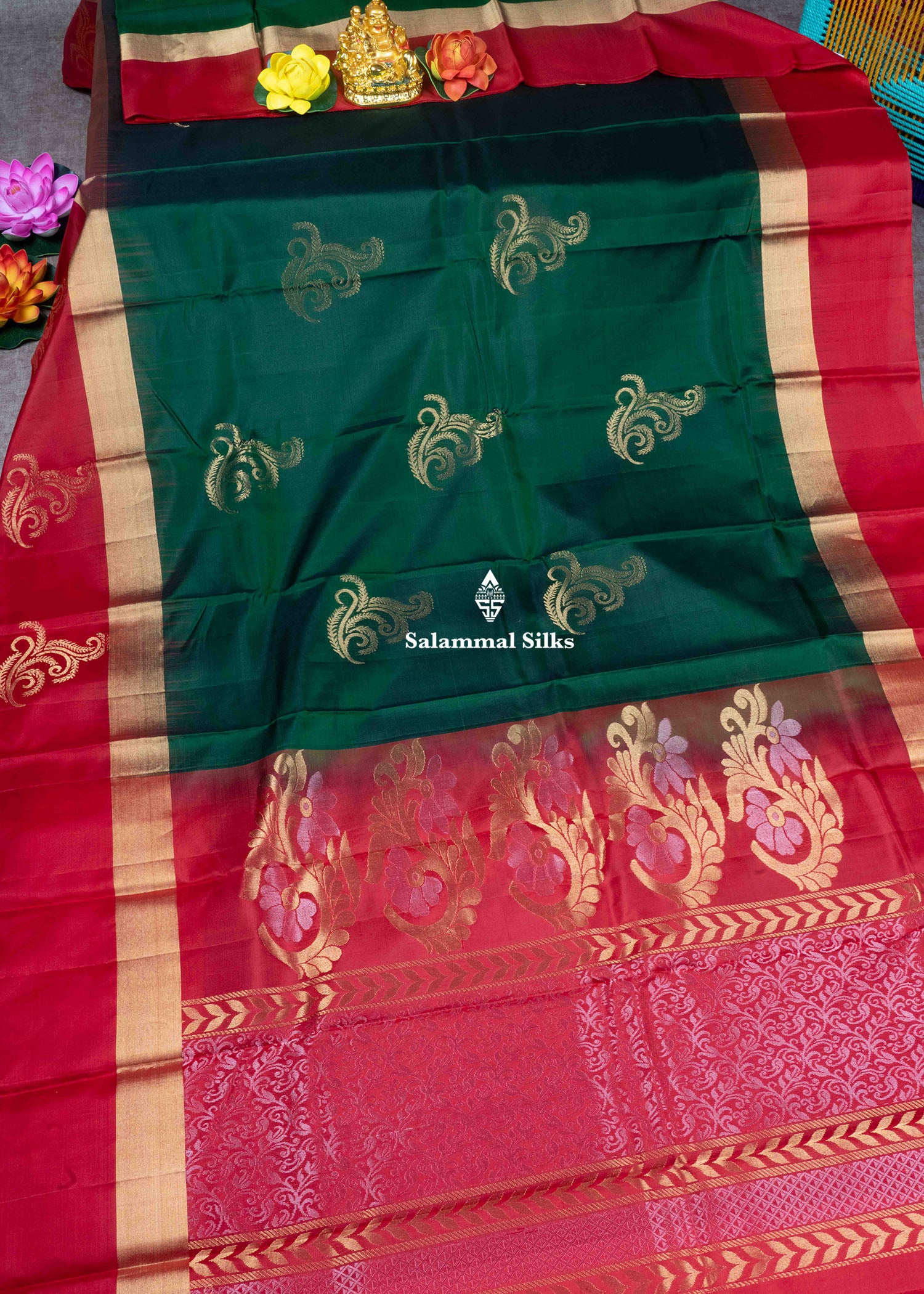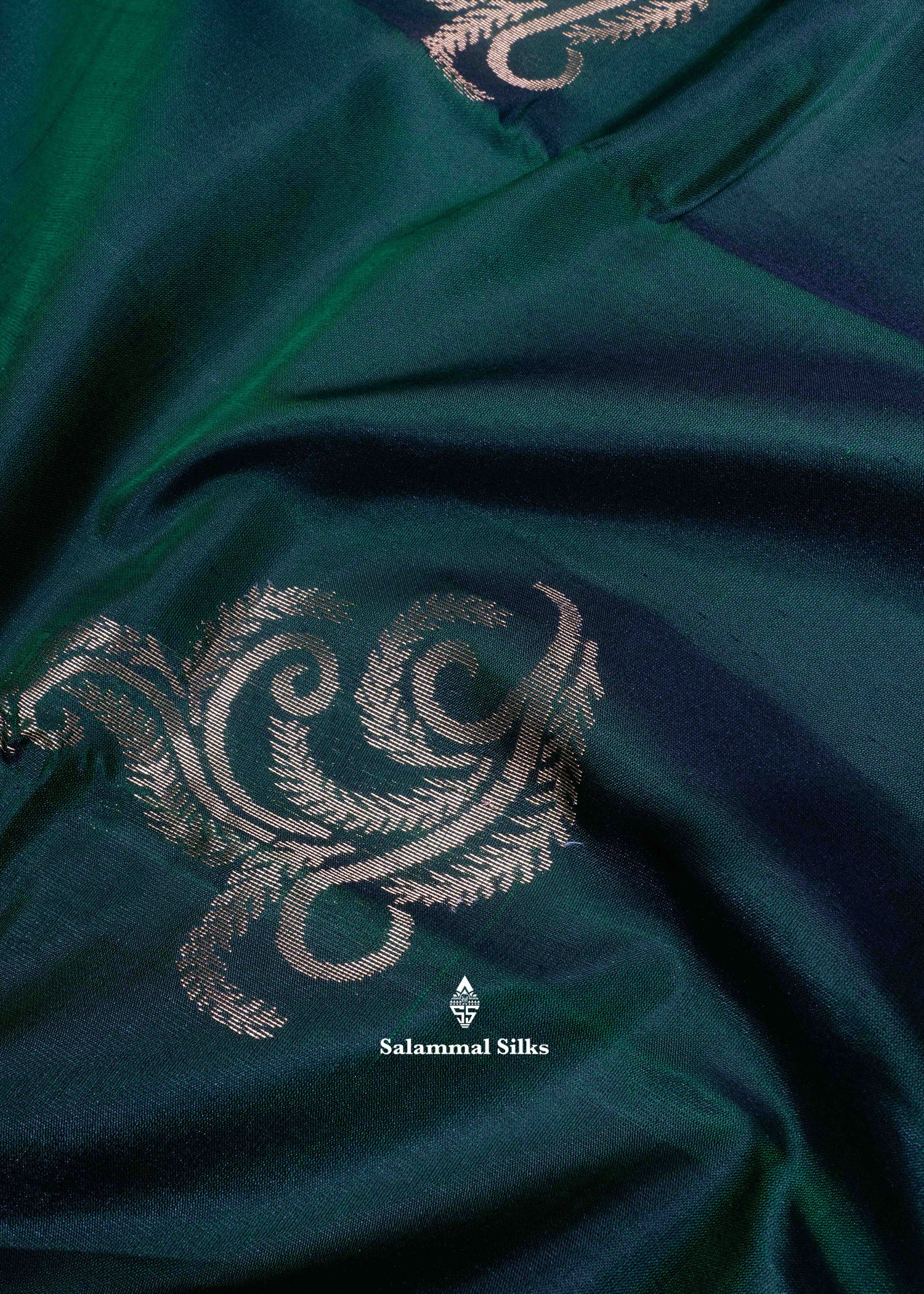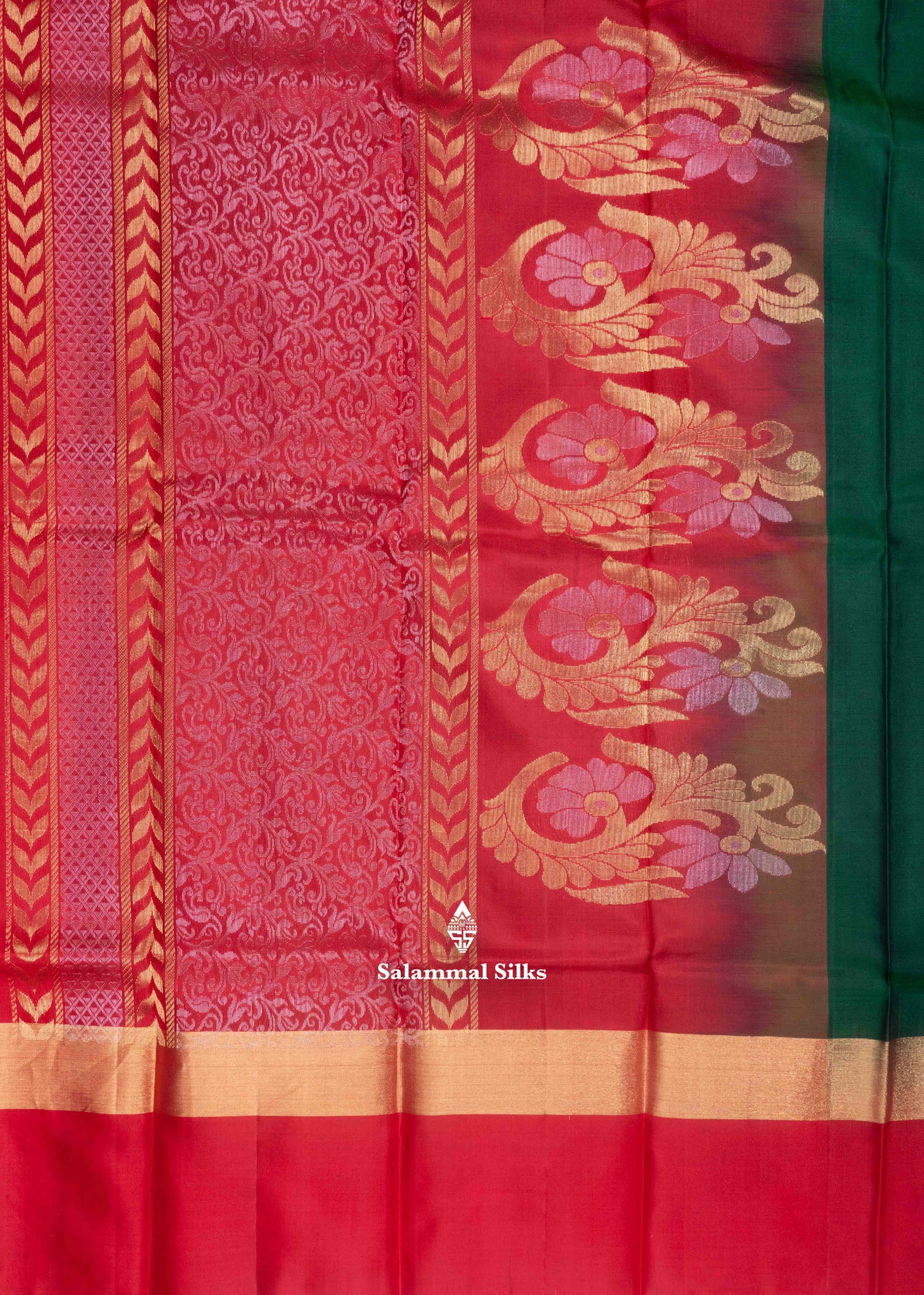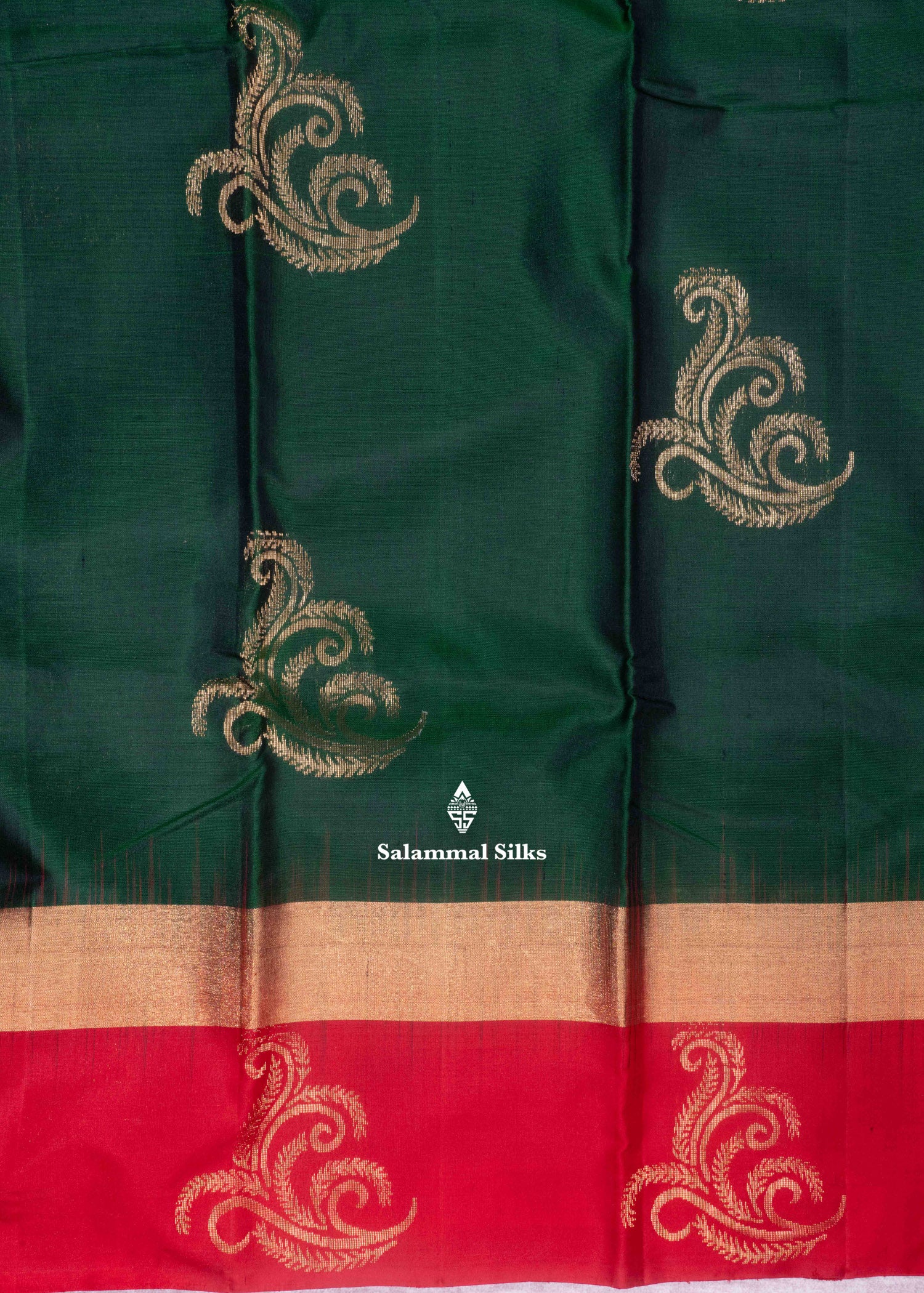 Salammal is known for its handloom sarees. In some sarees, there is cross-weaving between the body and the pallu, which is a sign of pure handloom sarees. This can be seen in Kanchipuram embossed sarees.