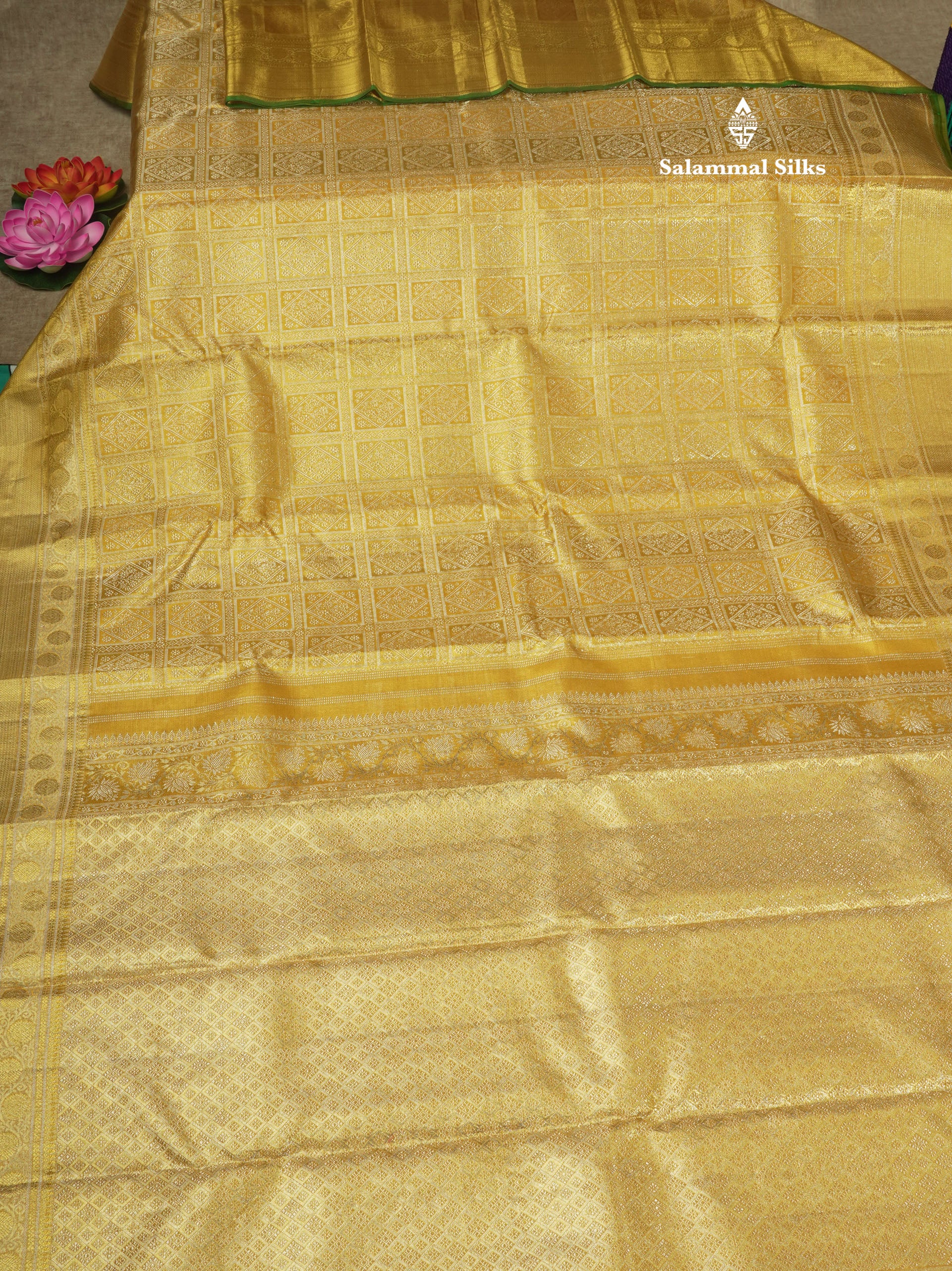 Salammal is known for its handloom sarees. In some sarees, there is cross-weaving between the body and the pallu, which is a sign of pure handloom sarees. This can be seen in Kanchipuram embossed sarees.