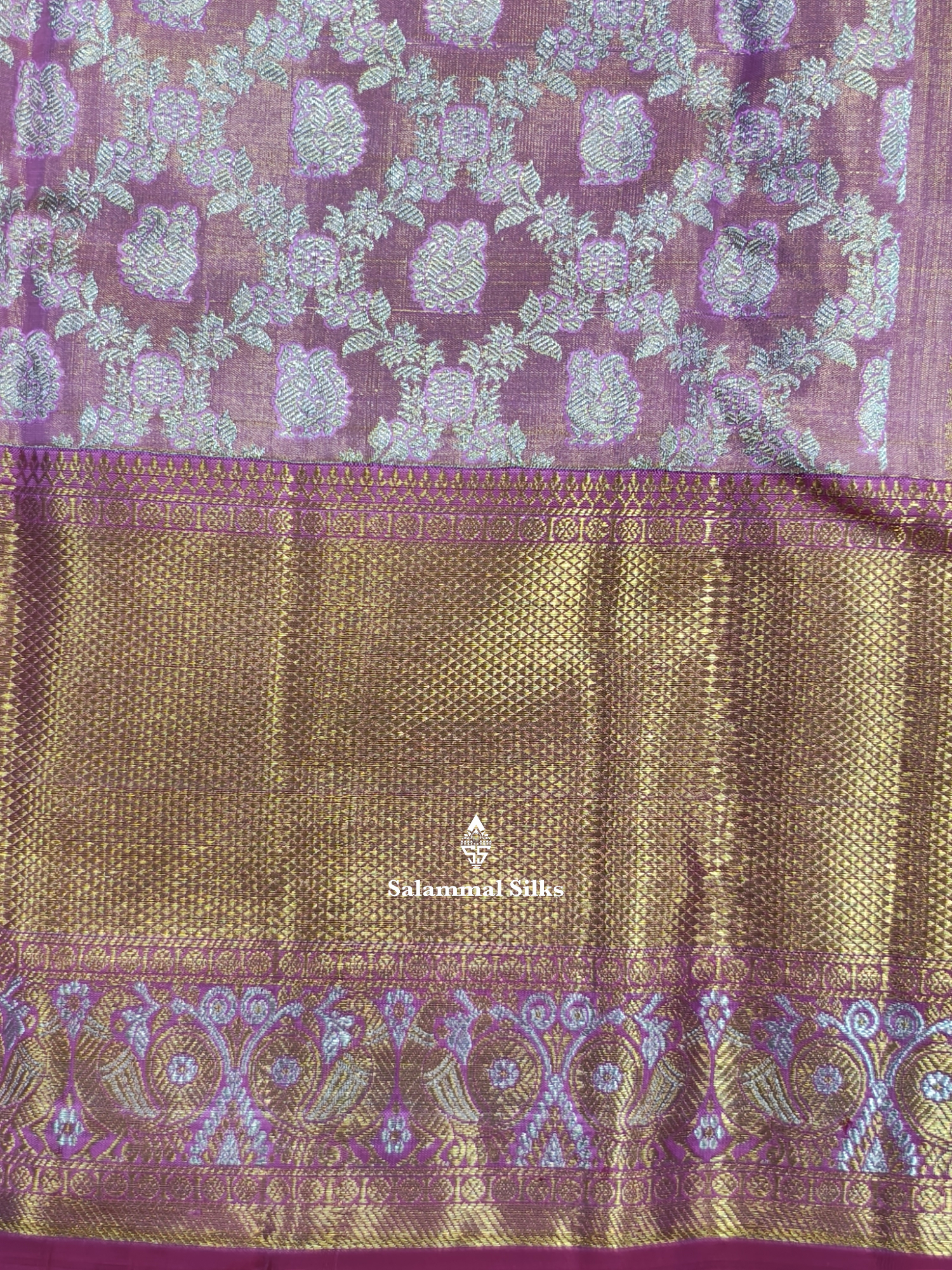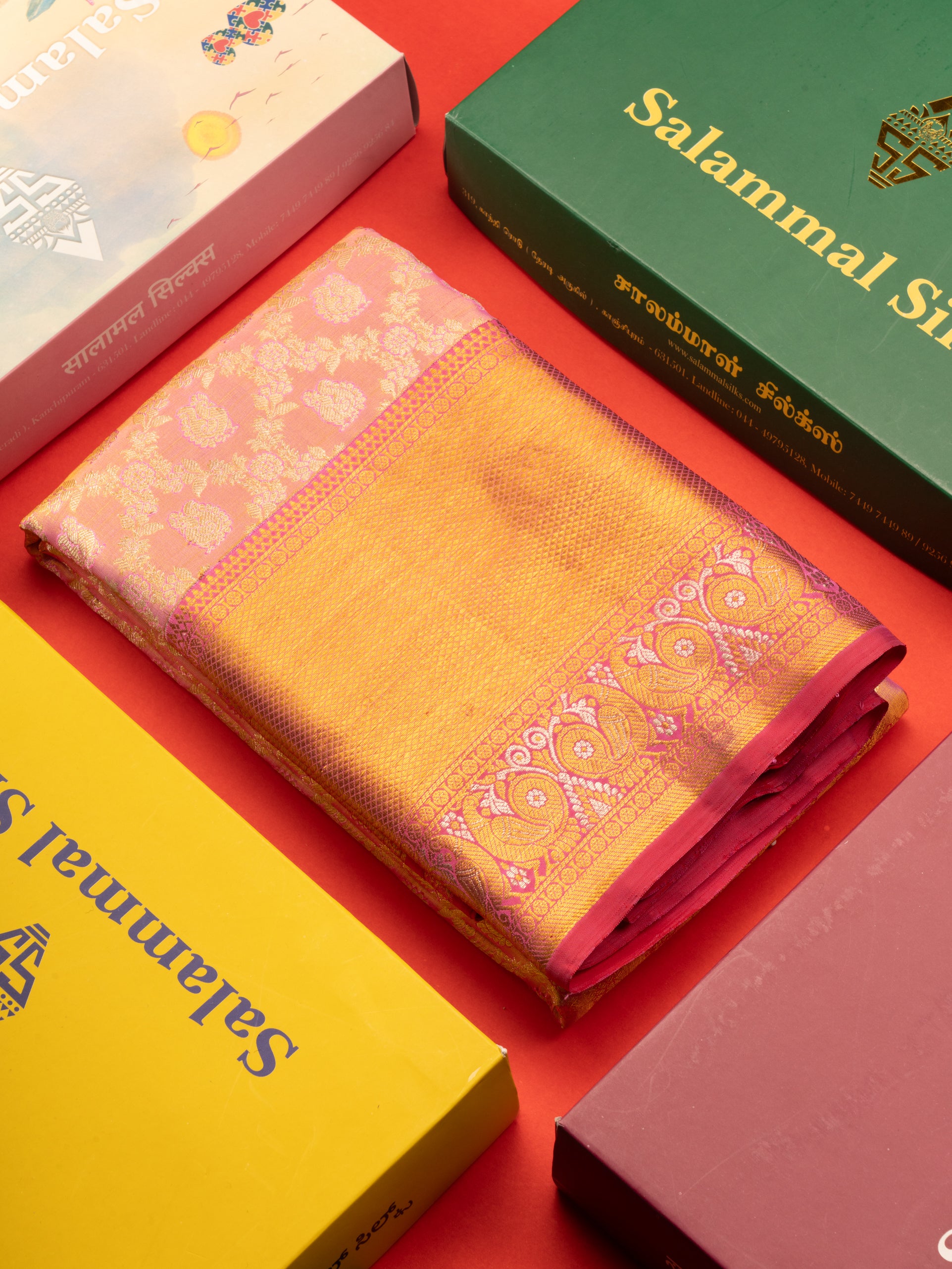 Salammal is known for its handloom sarees. In some sarees, there is cross-weaving between the body and the pallu, which is a sign of pure handloom sarees. This can be seen in Kanchipuram embossed sarees.