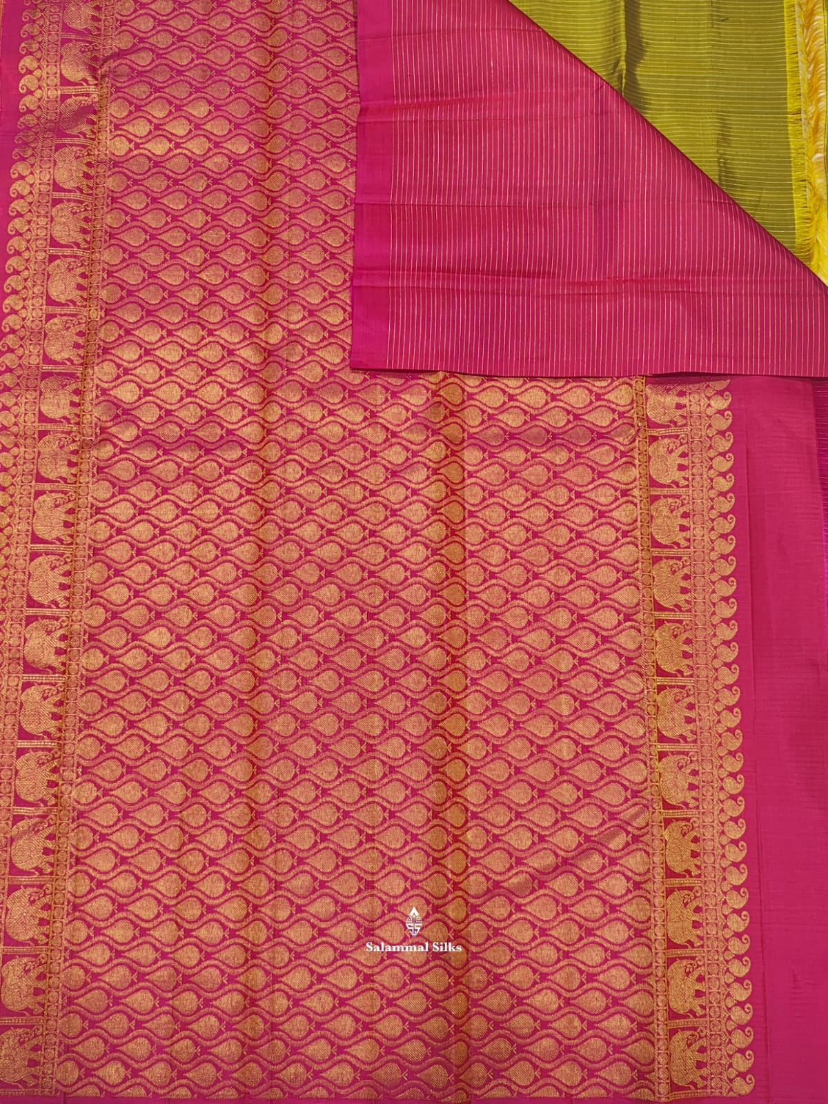 Salammal is known for its handloom sarees. In some sarees, there is cross-weaving between the body and the pallu, which is a sign of pure handloom sarees. This can be seen in Kanchipuram embossed sarees.