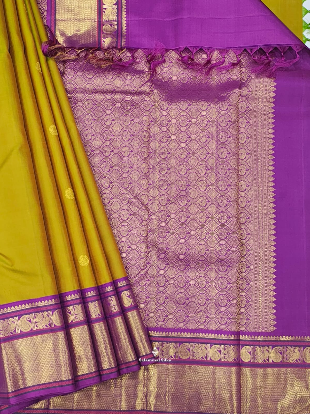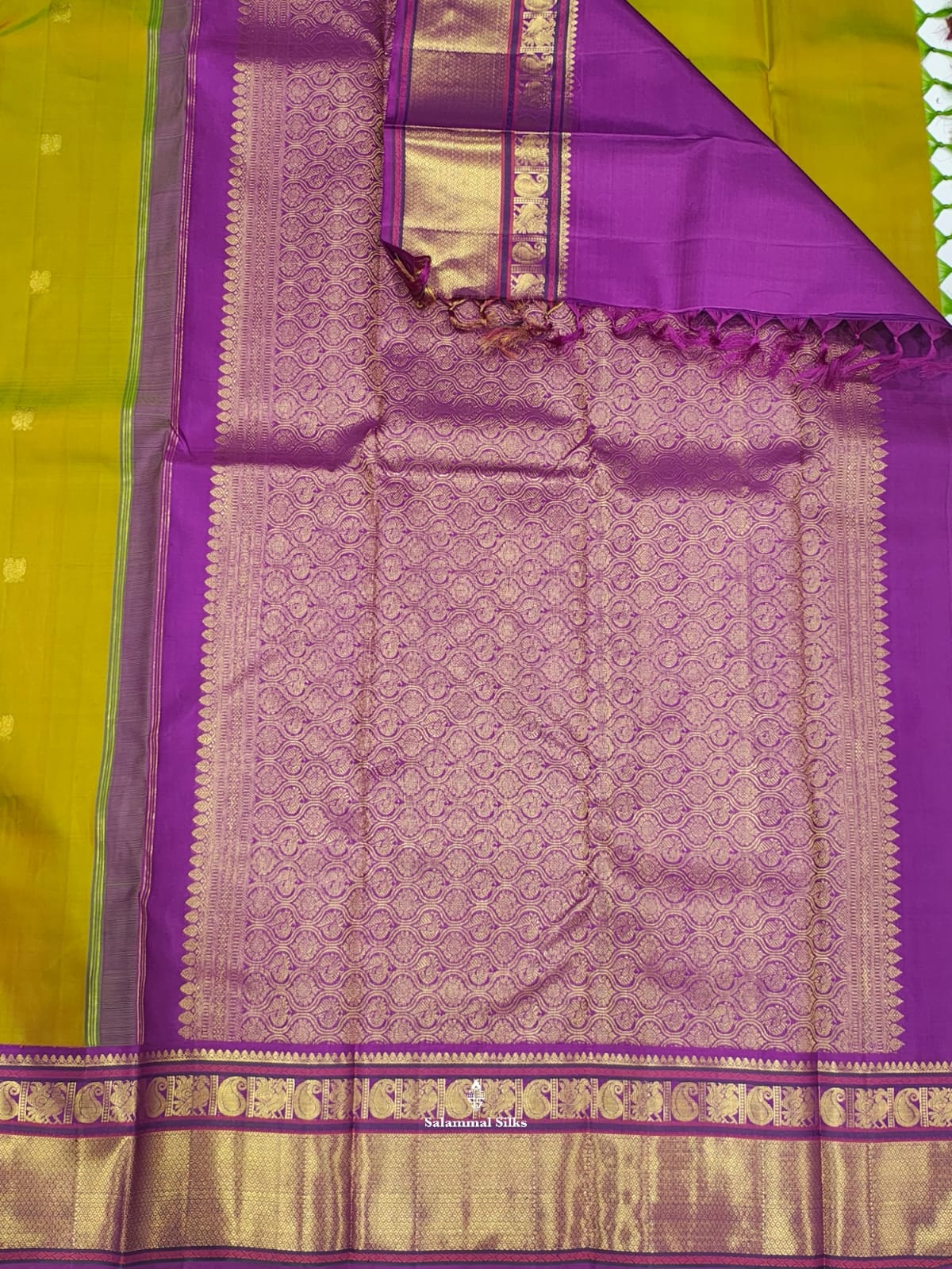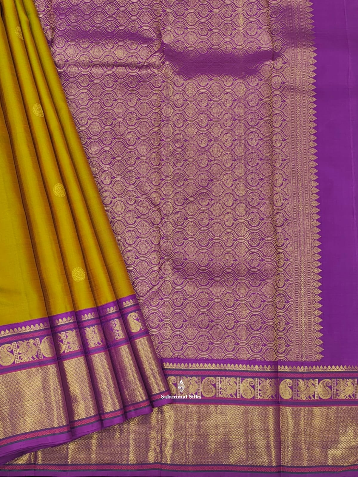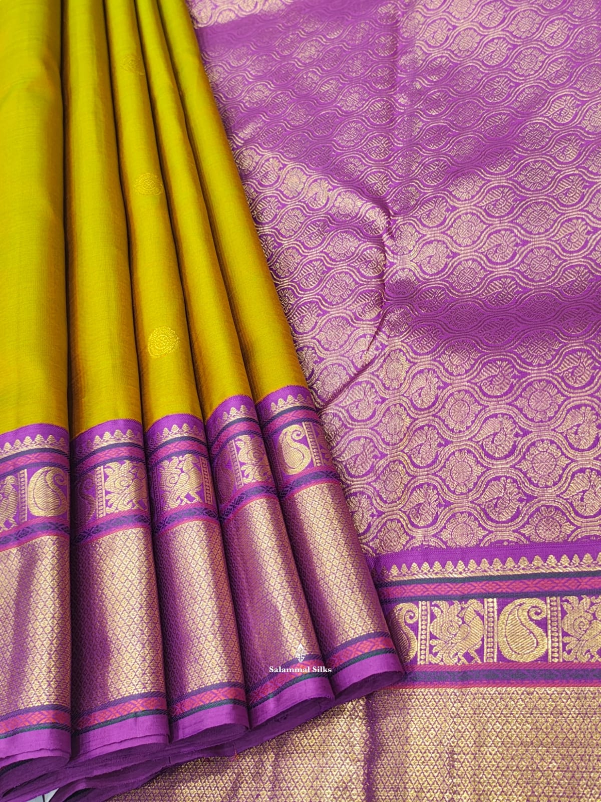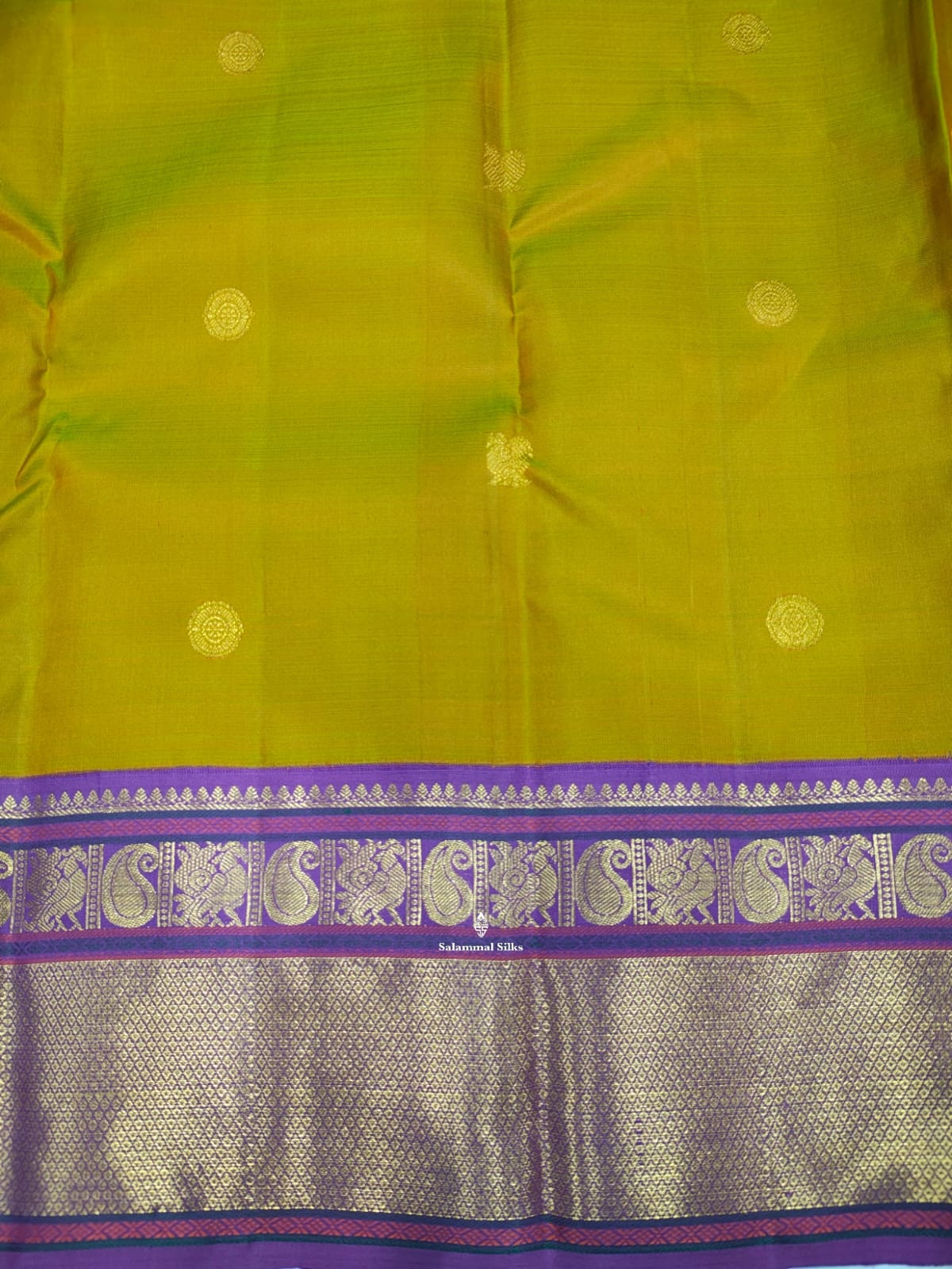 Salammal is known for its handloom sarees. In some sarees, there is cross-weaving between the body and the pallu, which is a sign of pure handloom sarees. This can be seen in Kanchipuram embossed sarees.