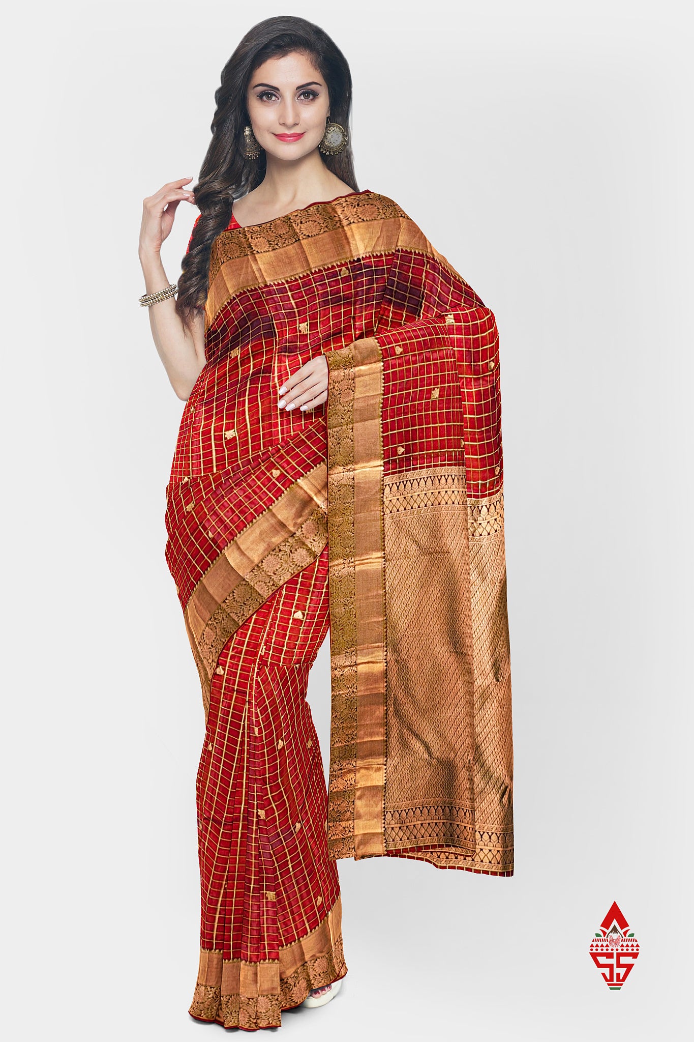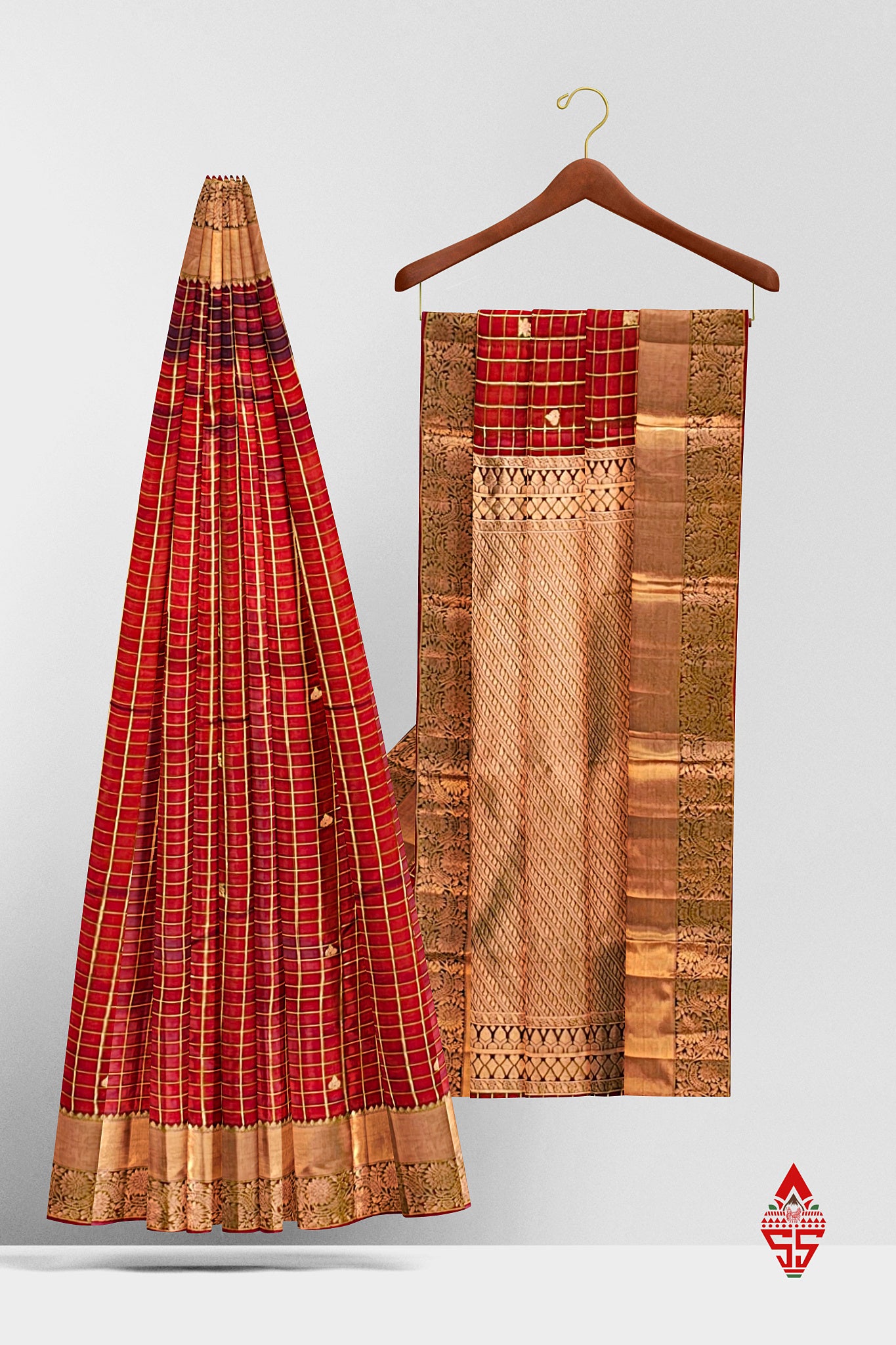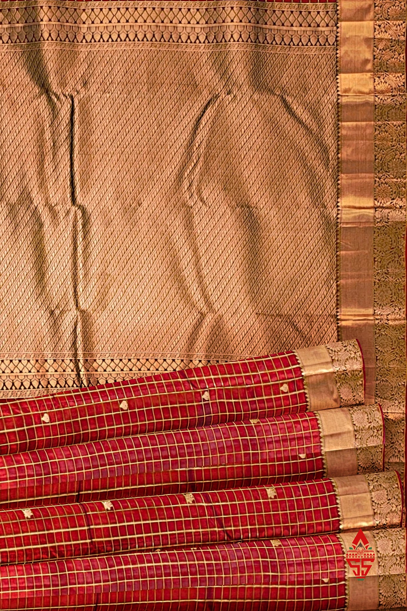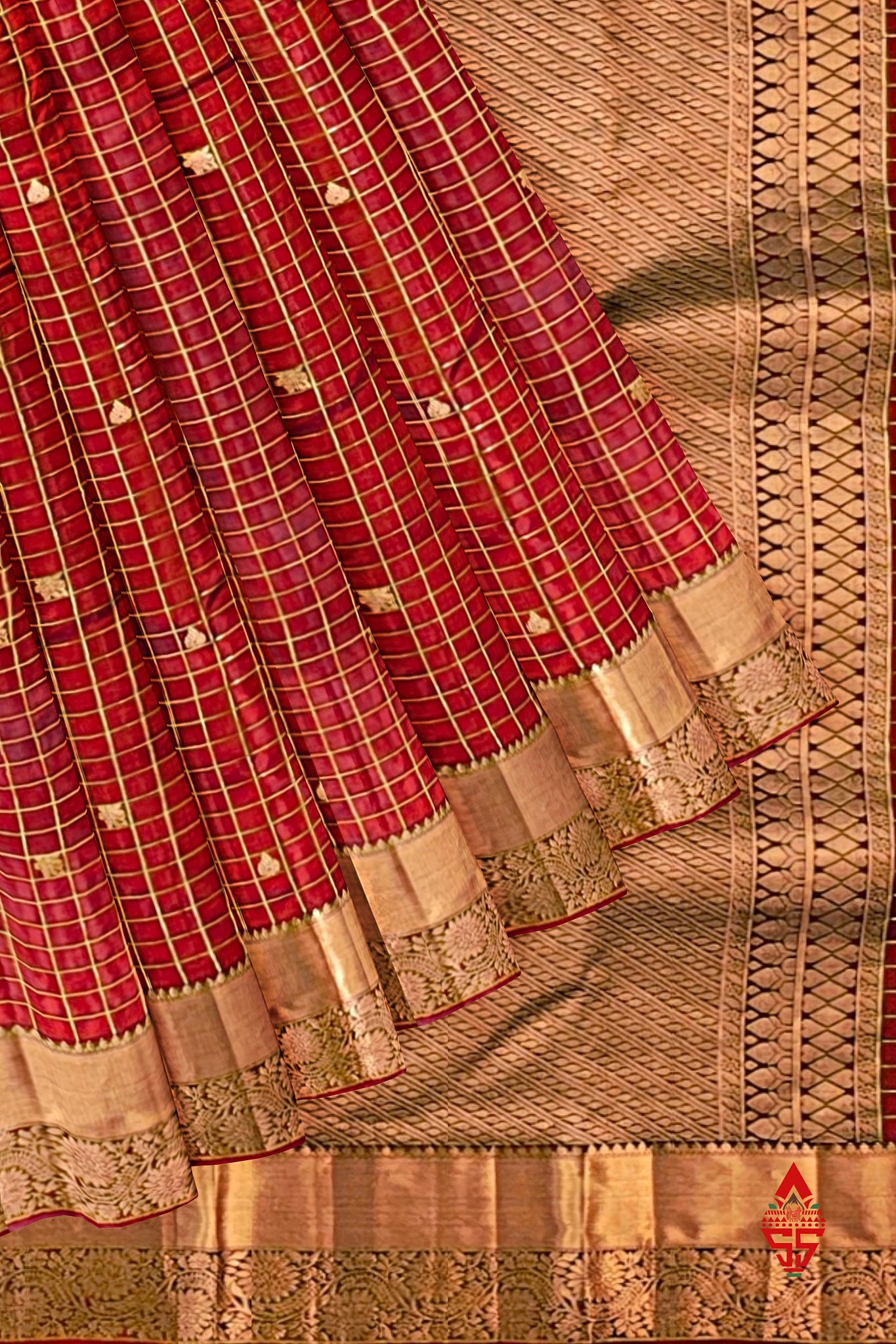 Kanjivaram Maroon Checks Silk Saree With Blouse
