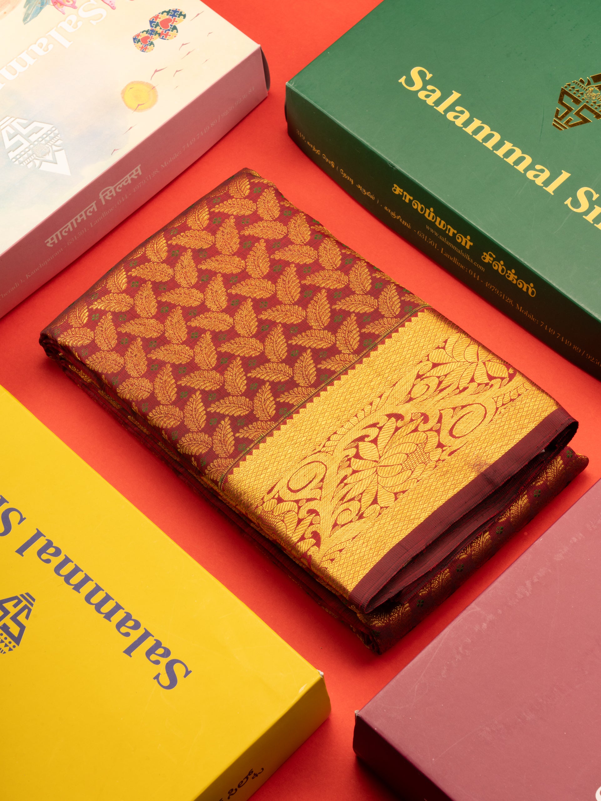 Salammal is known for its handloom sarees. In some sarees, there is cross-weaving between the body and the pallu, which is a sign of pure handloom sarees. This can be seen in Kanchipuram embossed sarees.