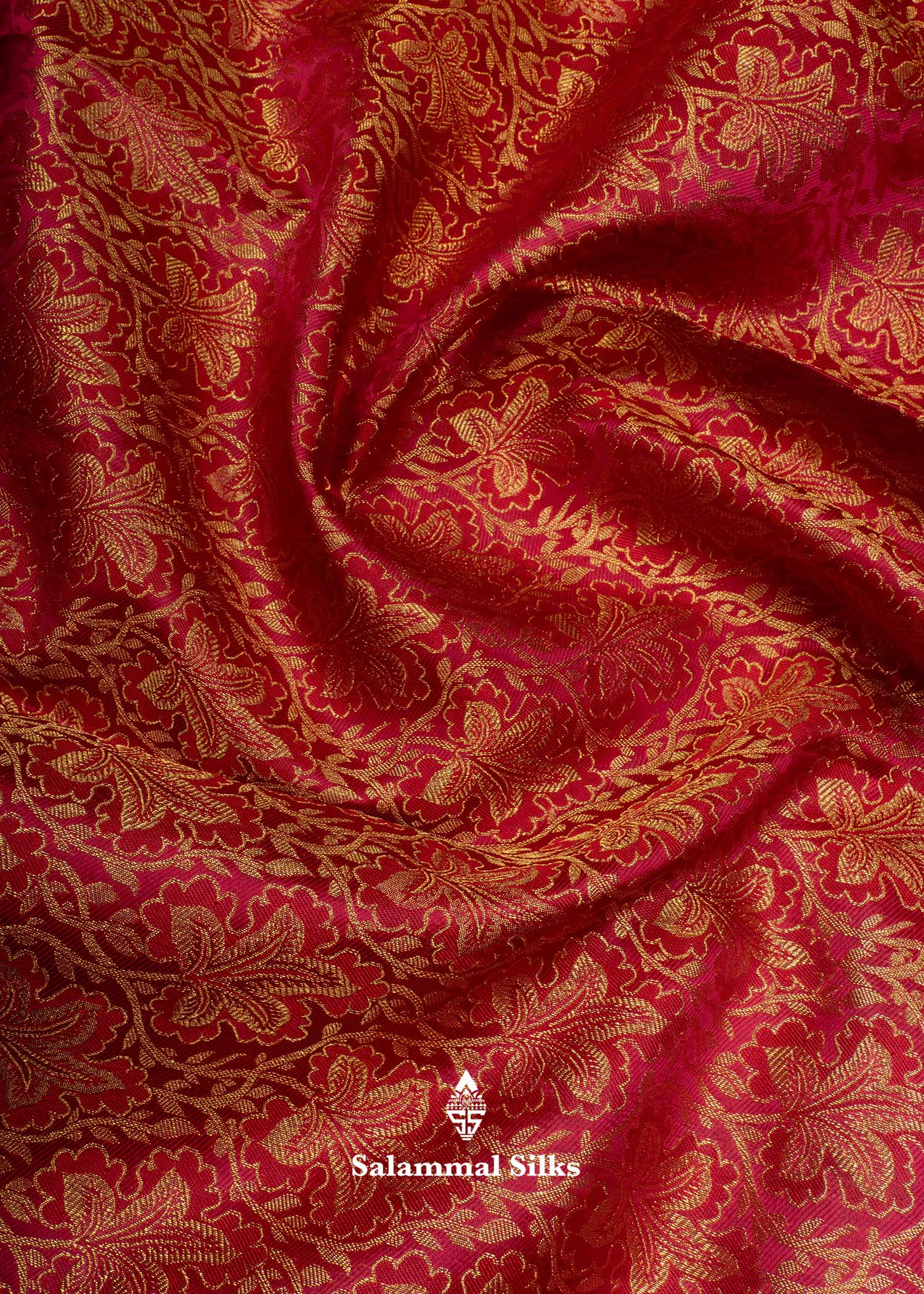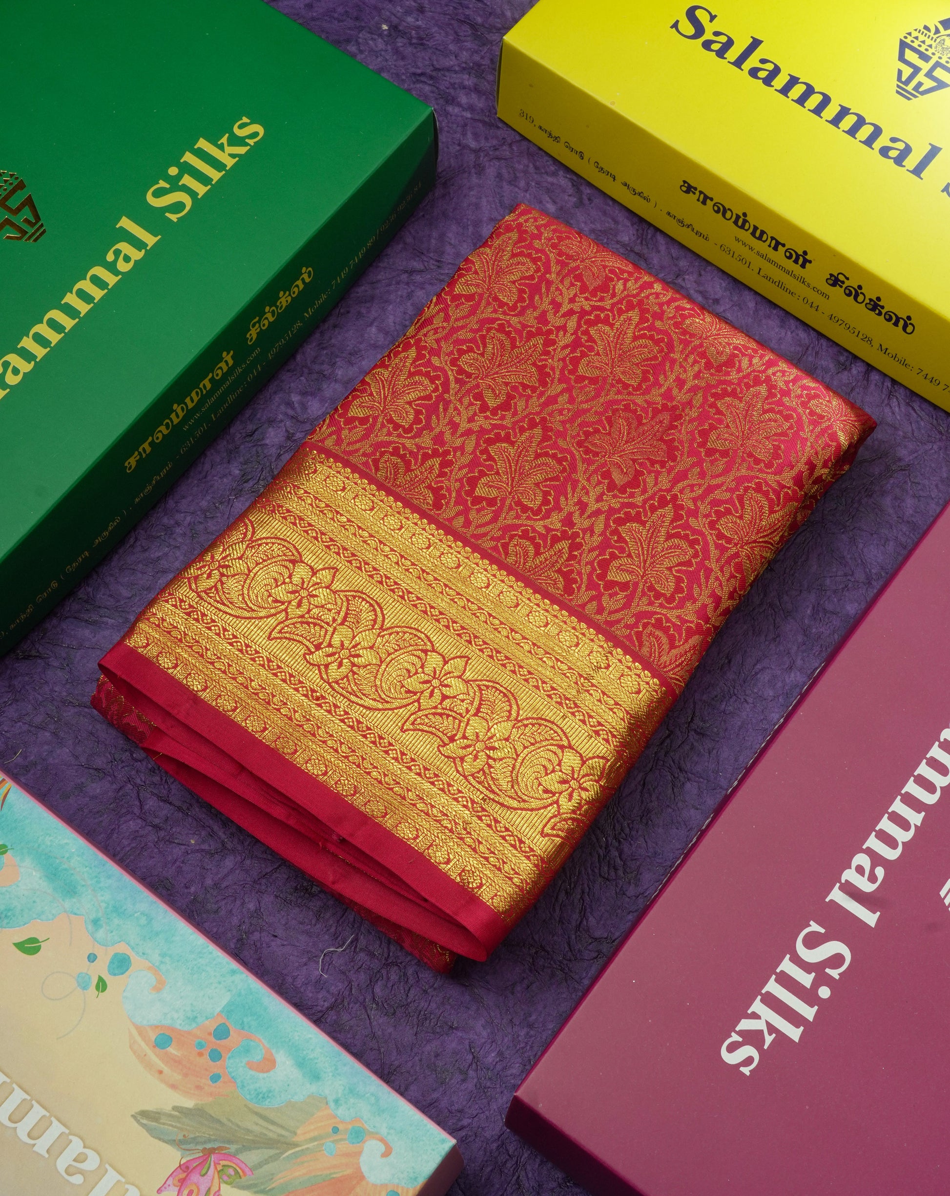 Salammal is known for its handloom sarees. In some sarees, there is cross-weaving between the body and the pallu, which is a sign of pure handloom sarees. This can be seen in Kanchipuram embossed sarees.