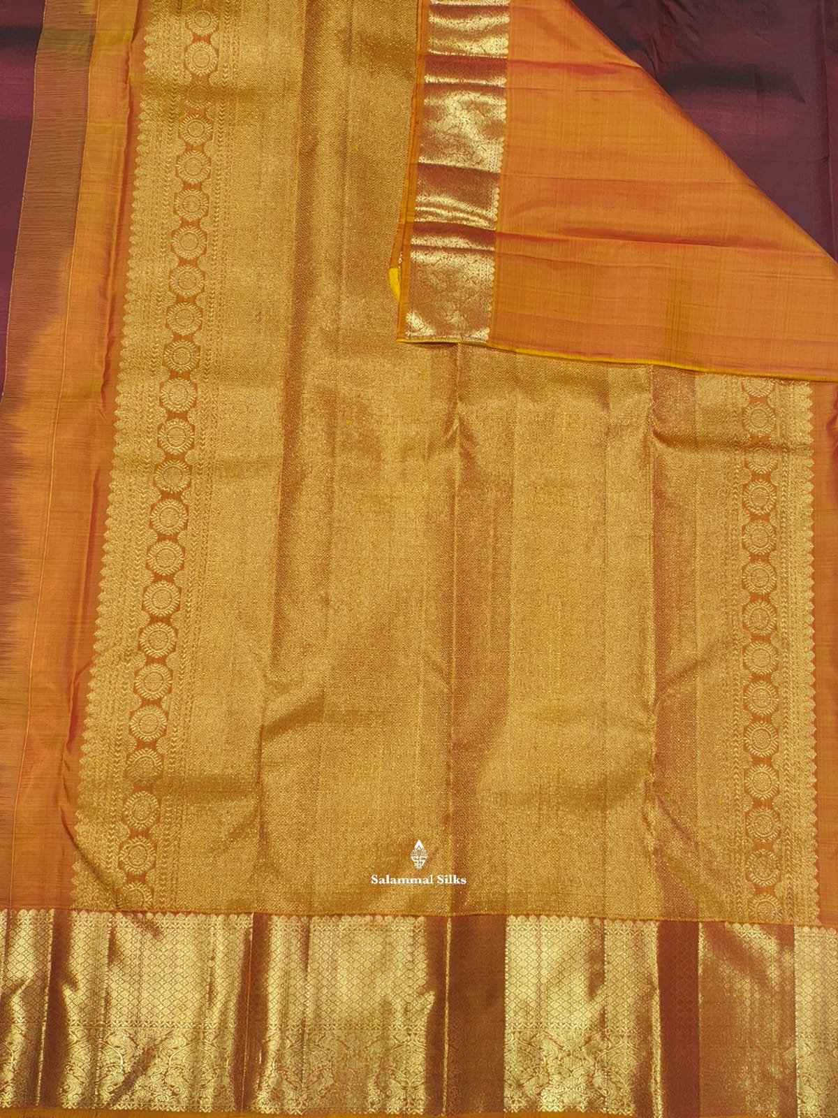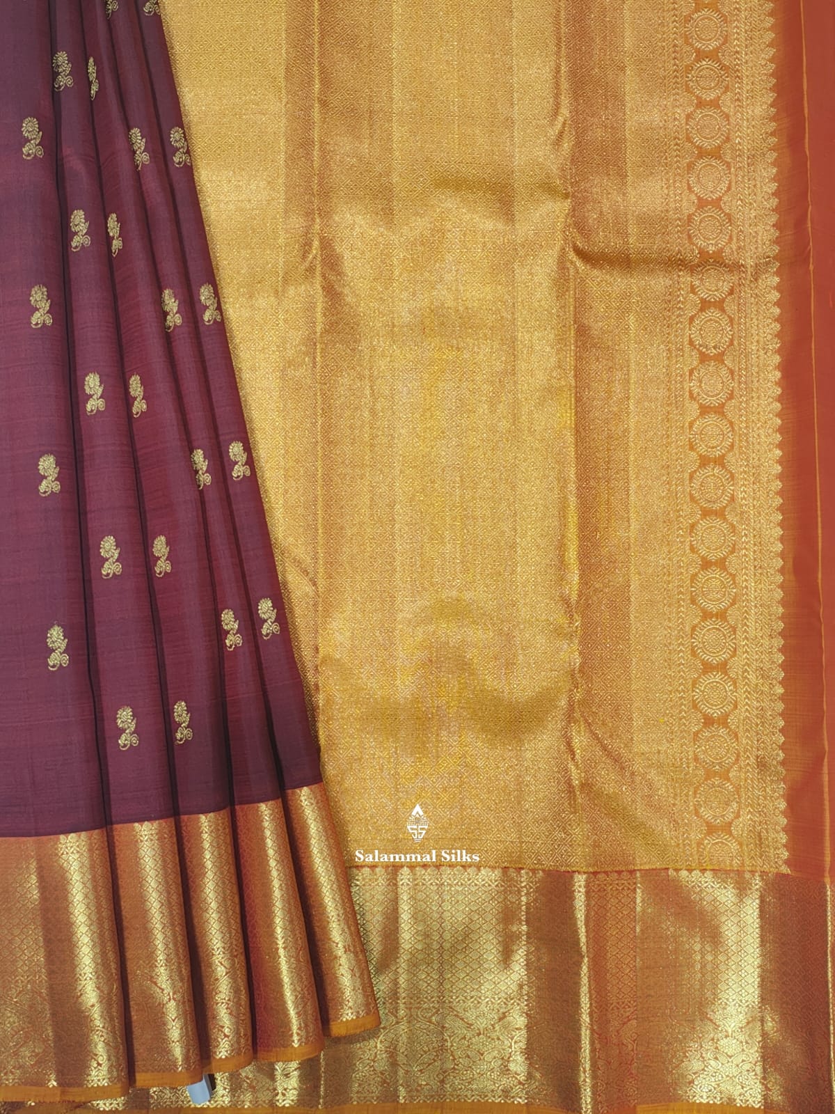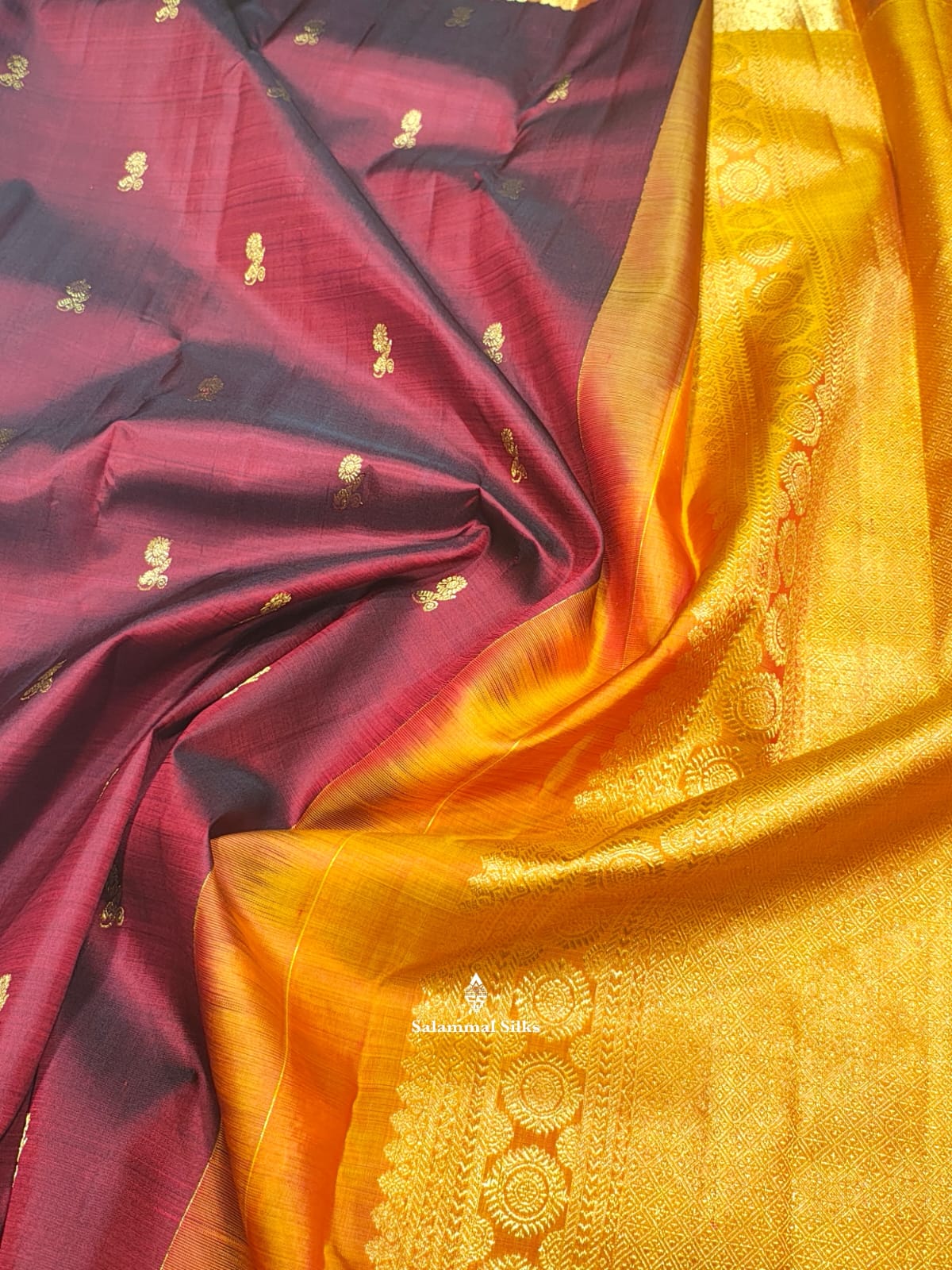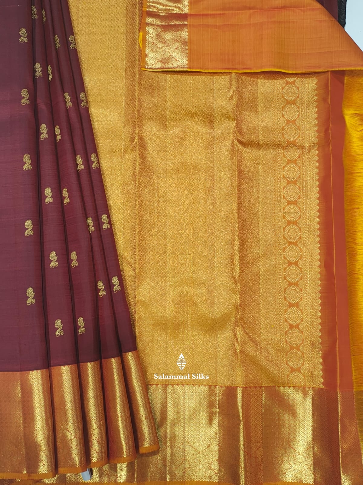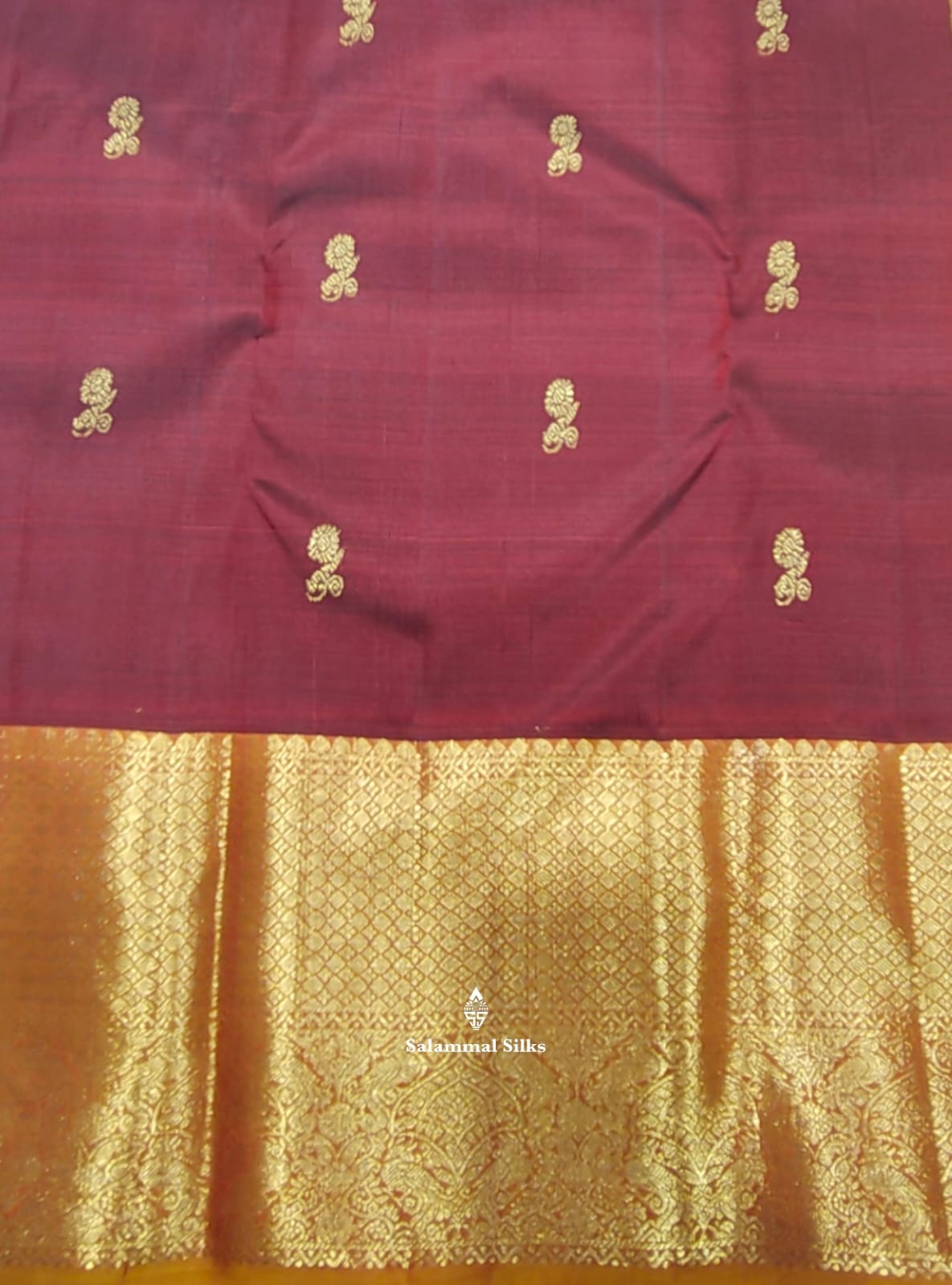 Salammal is known for its handloom sarees. In some sarees, there is cross-weaving between the body and the pallu, which is a sign of pure handloom sarees. This can be seen in Kanchipuram embossed sarees.