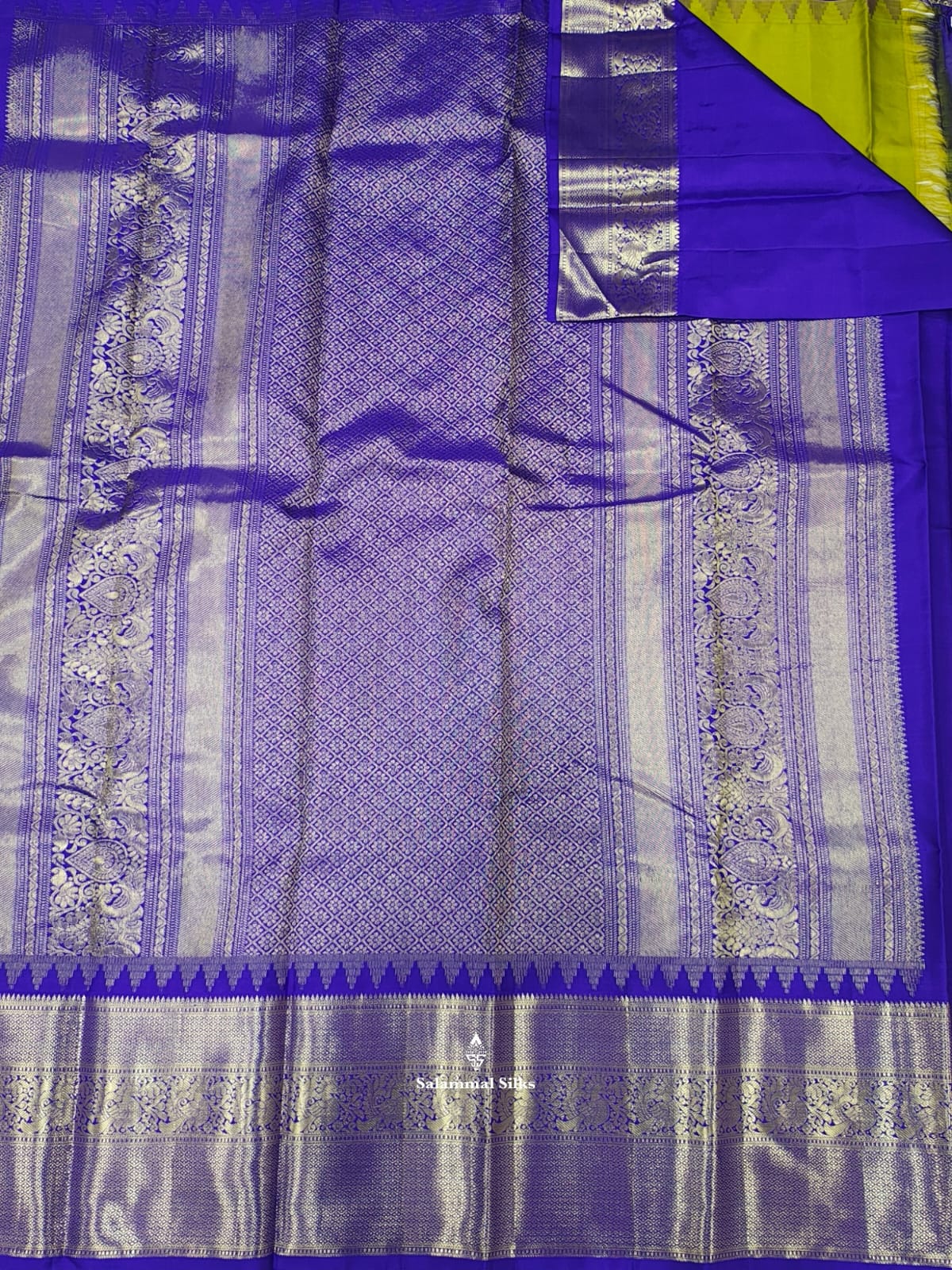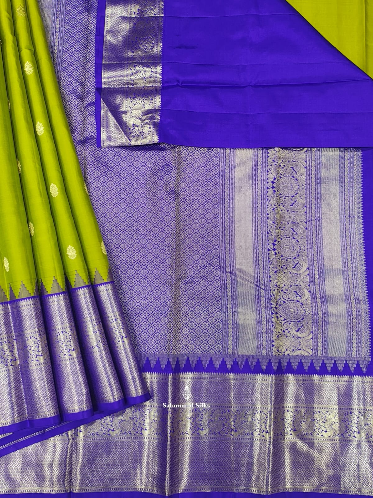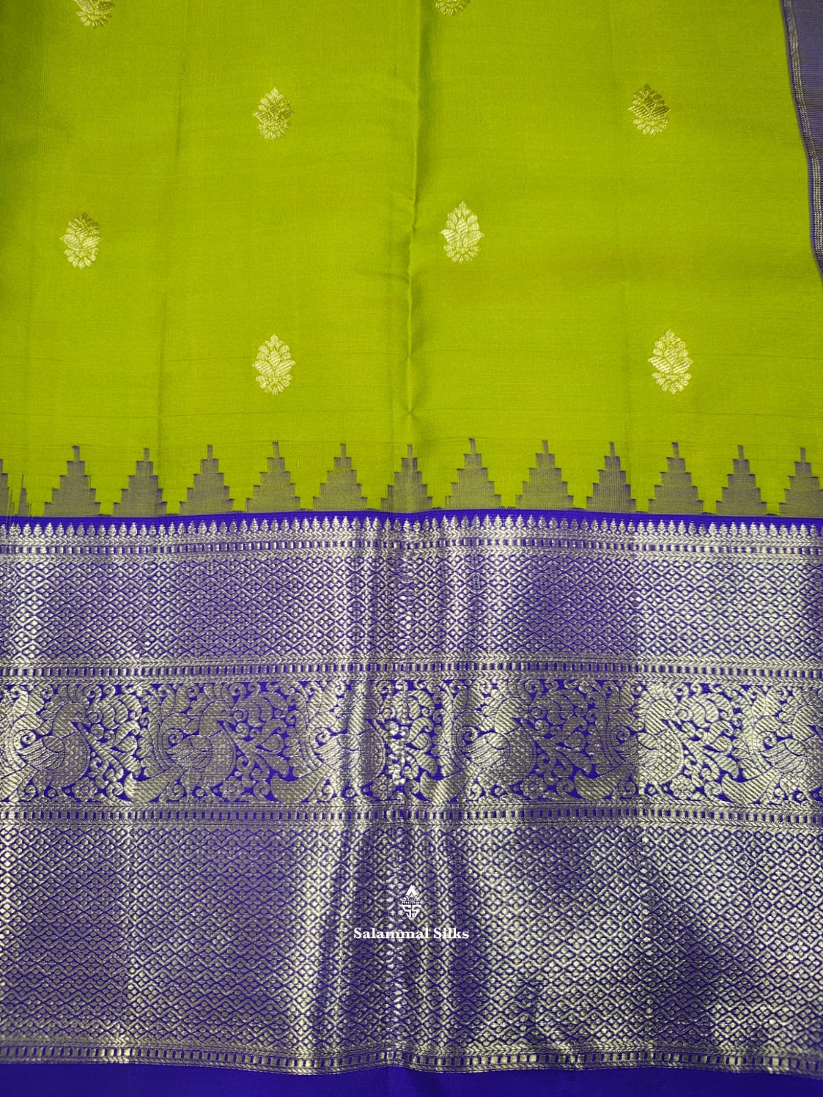 Salammal is known for its handloom sarees. In some sarees, there is cross-weaving between the body and the pallu, which is a sign of pure handloom sarees. This can be seen in Kanchipuram embossed sarees.