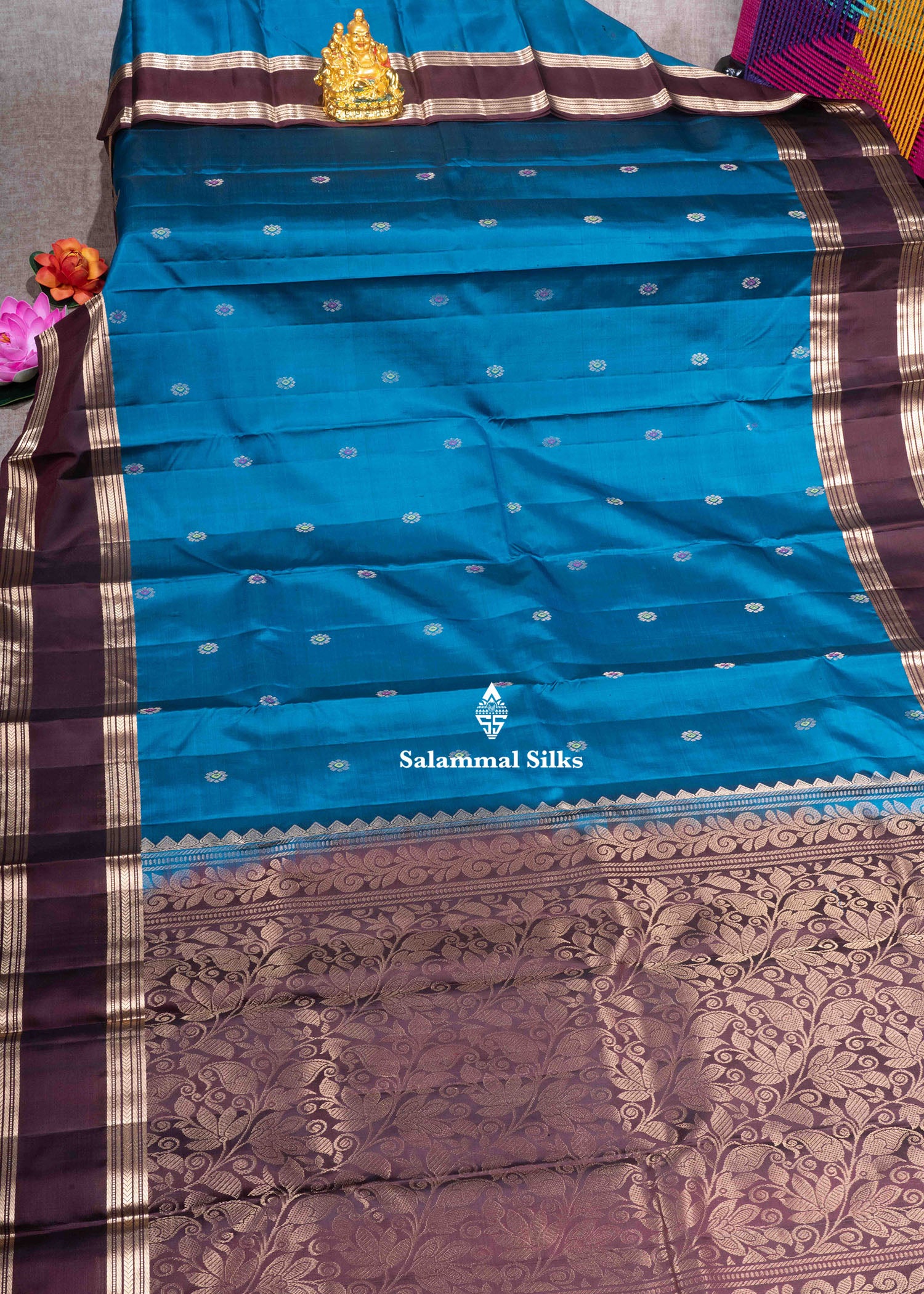 Kanjivaram Peacock Blue Pure Silk Saree With Brown Blouse