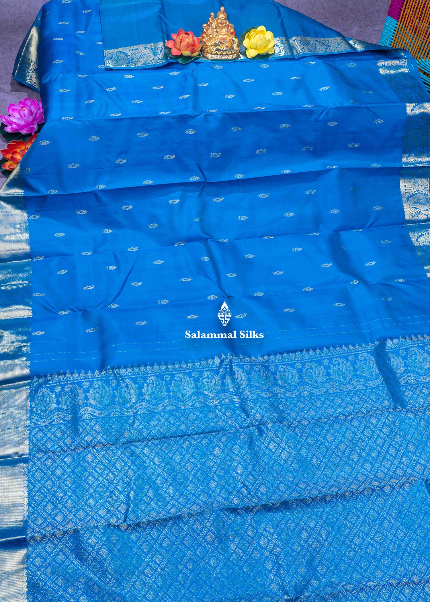 Salammal is known for its handloom sarees. In some sarees, there is cross-weaving between the body and the pallu, which is a sign of pure handloom sarees. This can be seen in Kanchipuram embossed sarees.