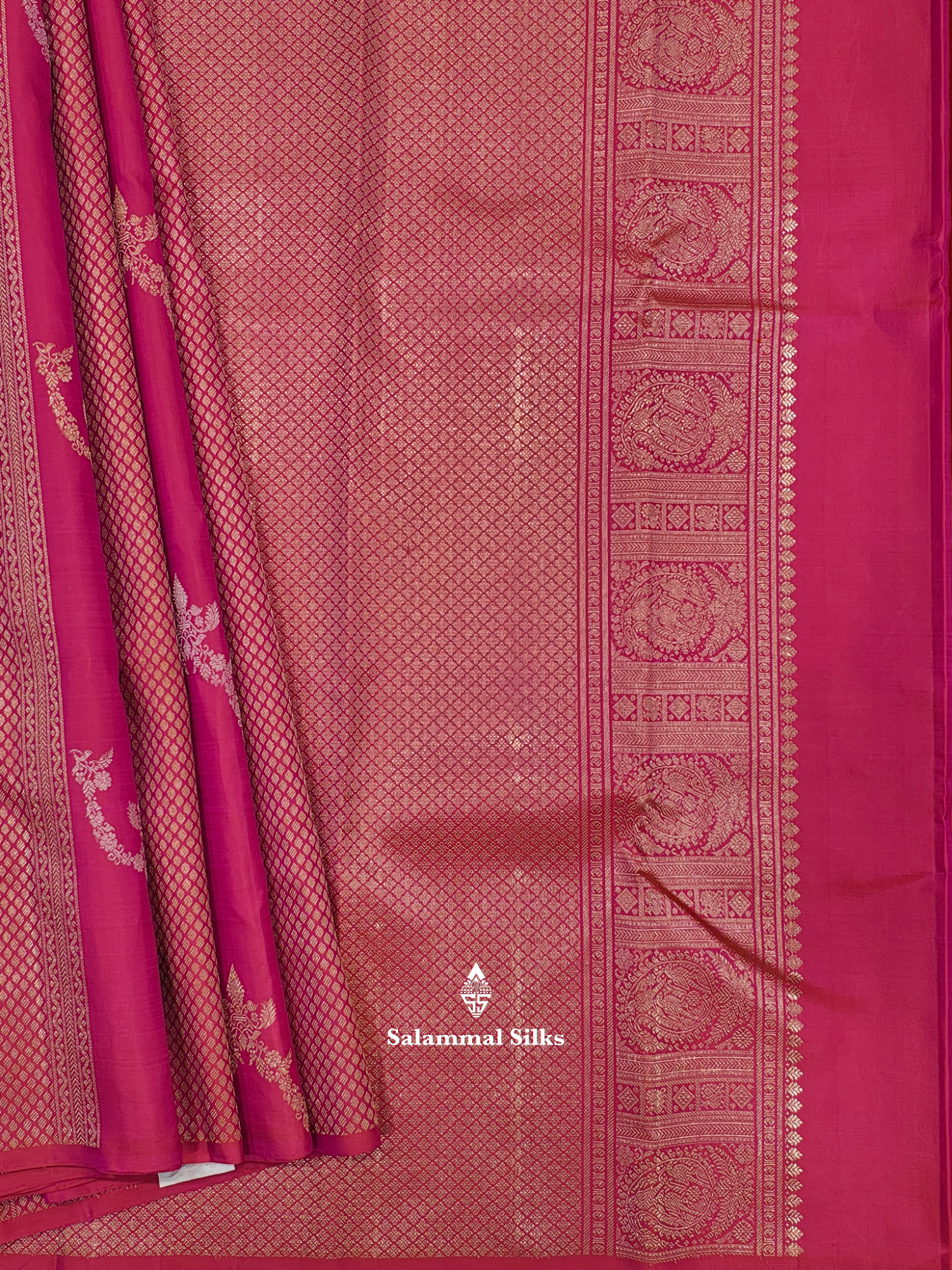 Salammal is known for its handloom sarees. In some sarees, there is cross-weaving between the body and the pallu, which is a sign of pure handloom sarees. This can be seen in Kanchipuram embossed sarees.