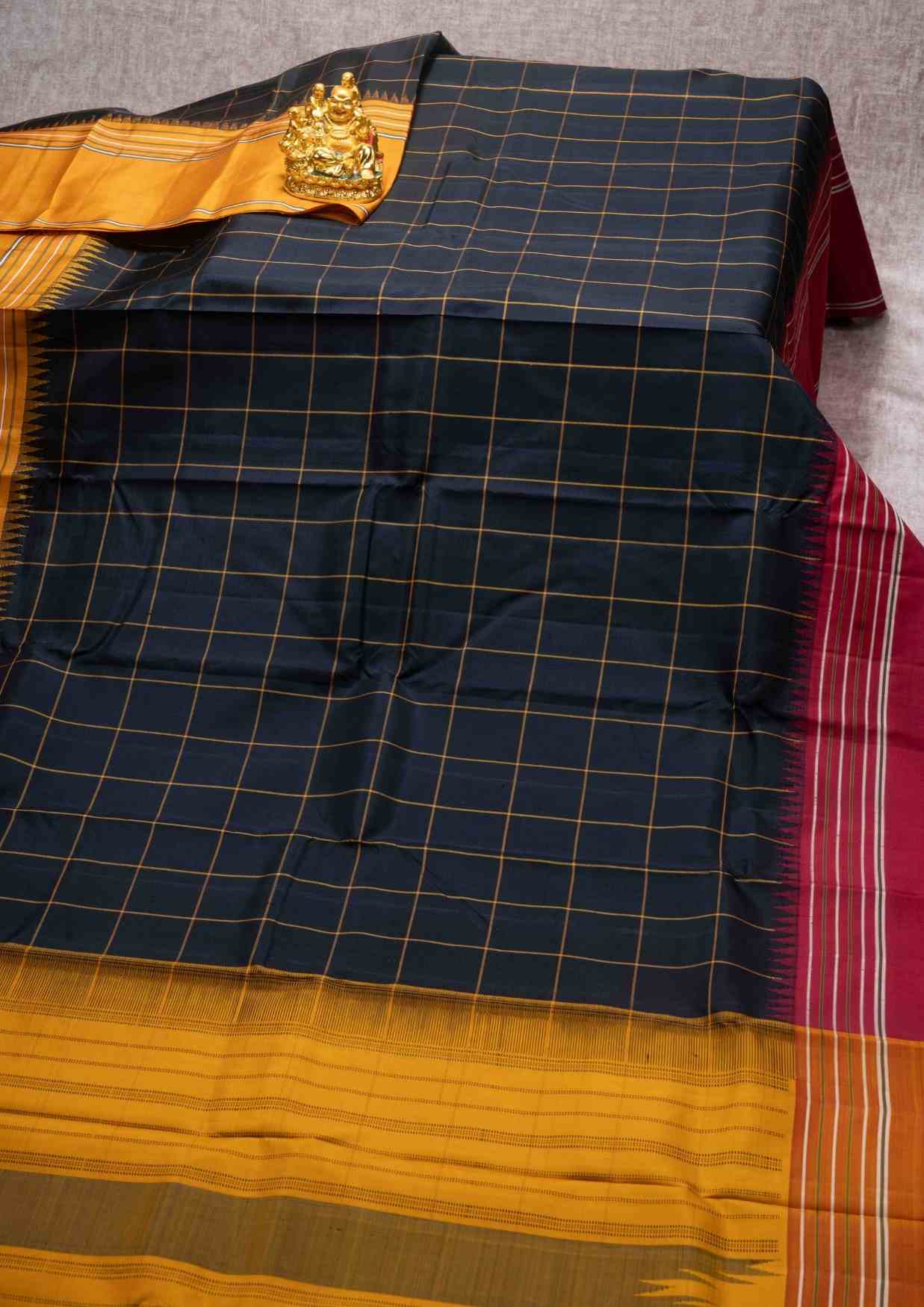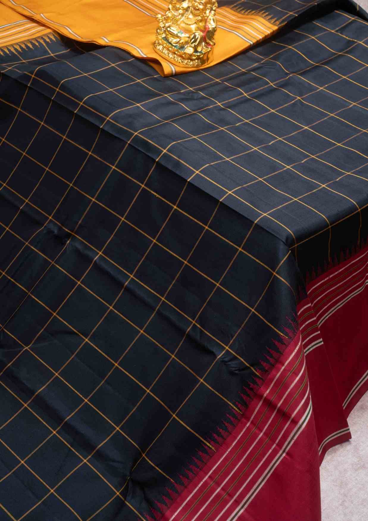 Kanjivaram Pure Silk Saree Black Body & Yellow Checks With Ganga Jamuna Border