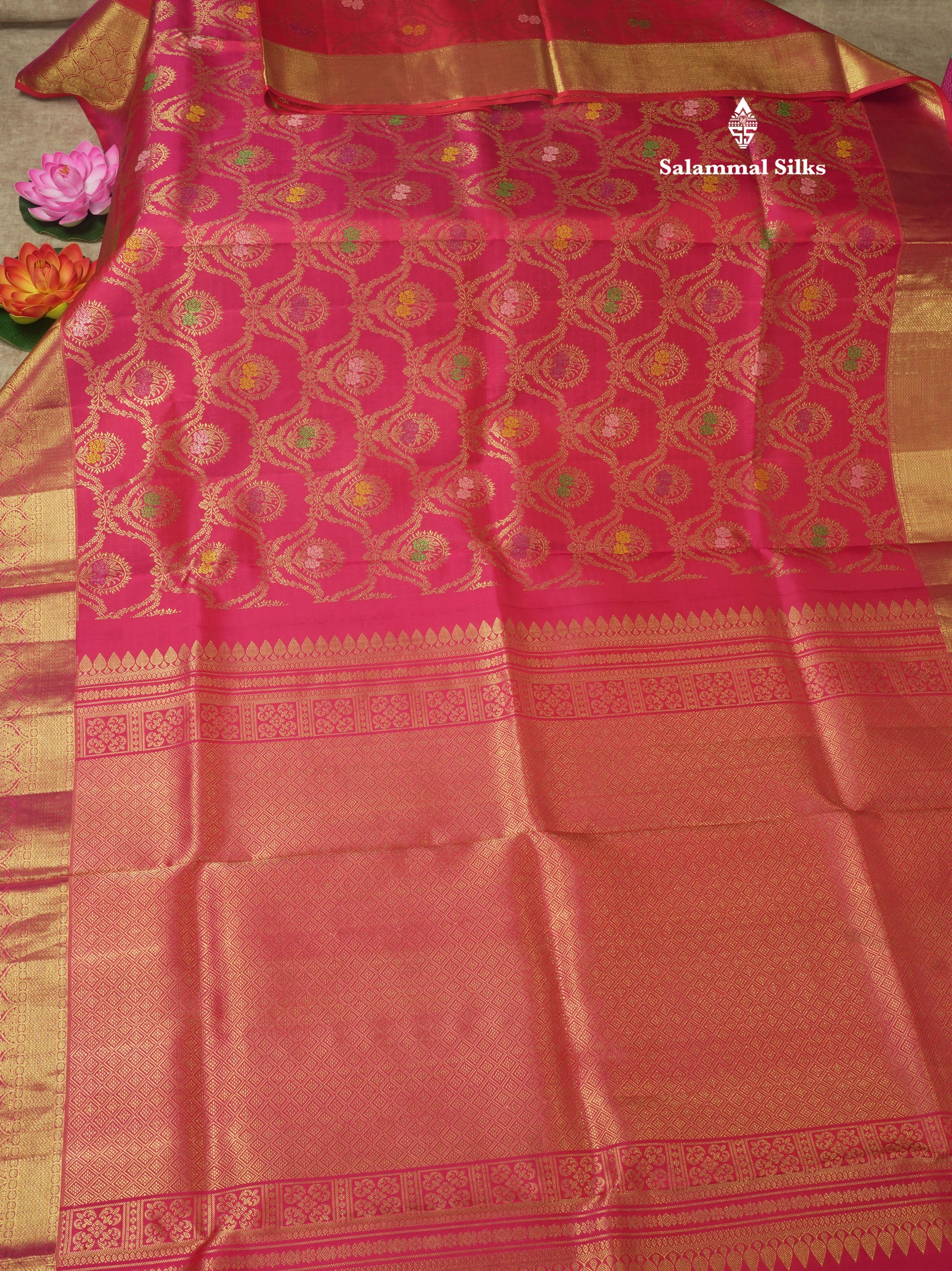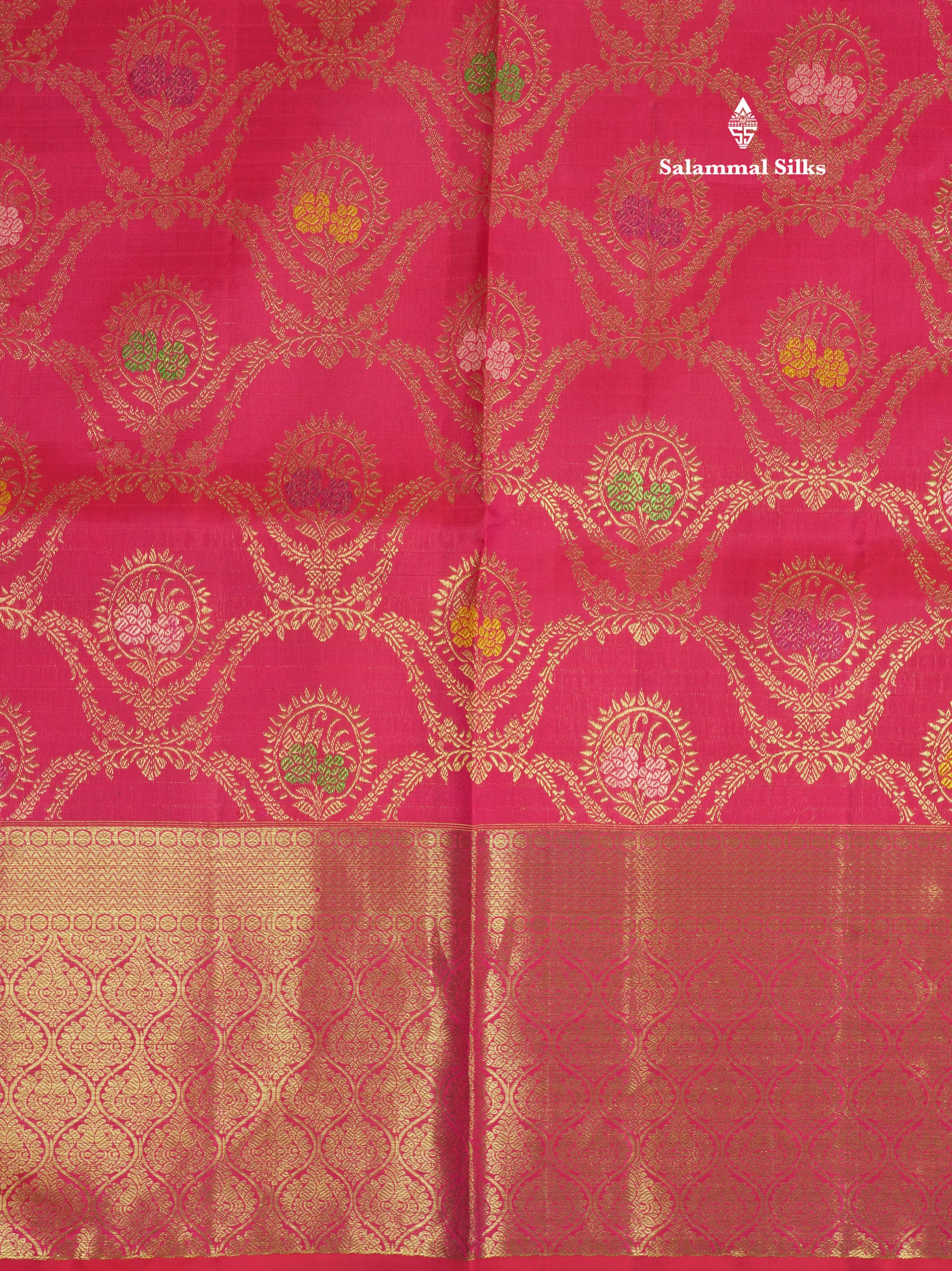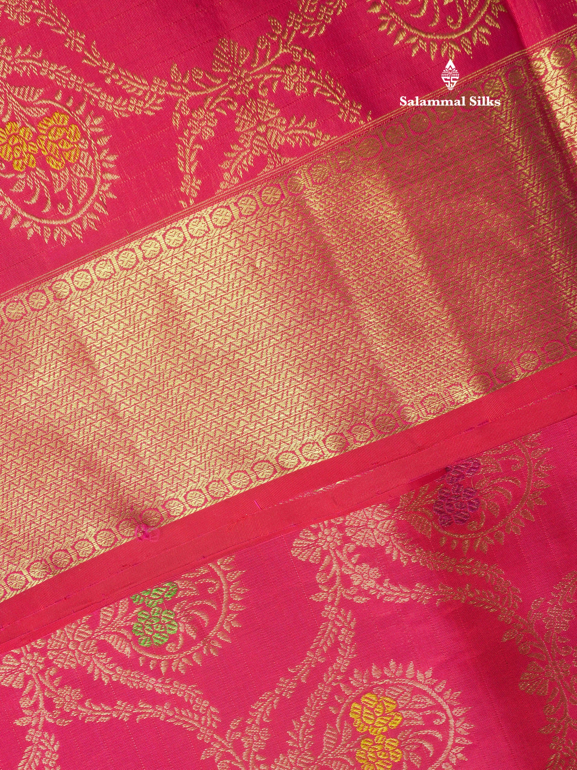 Salammal is known for its handloom sarees. In some sarees, there is cross-weaving between the body and the pallu, which is a sign of pure handloom sarees. This can be seen in Kanchipuram embossed sarees.