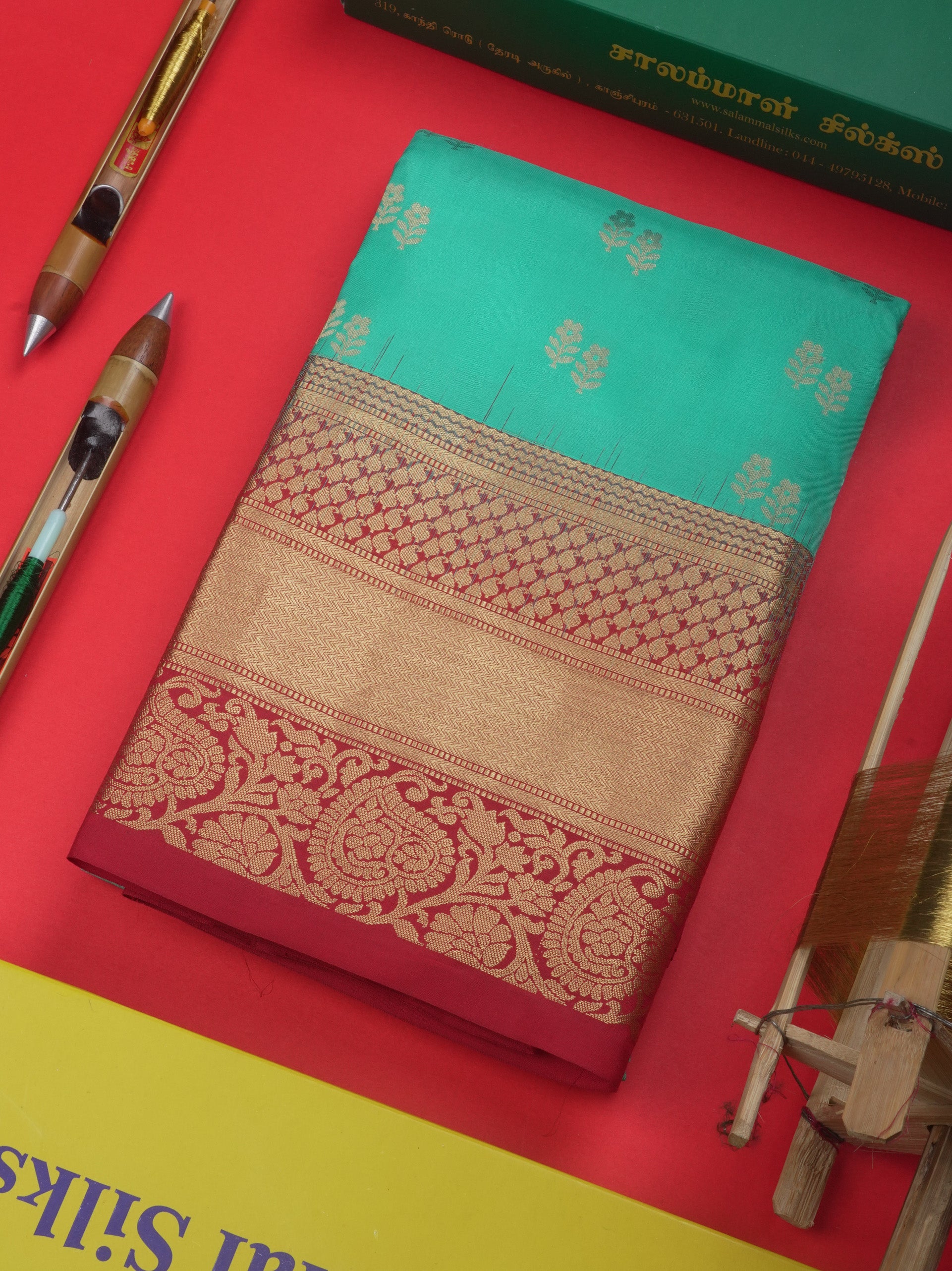 Salammal is known for its handloom sarees. In some sarees, there is cross-weaving between the body and the pallu, which is a sign of pure handloom sarees. This can be seen in Kanchipuram embossed sarees.