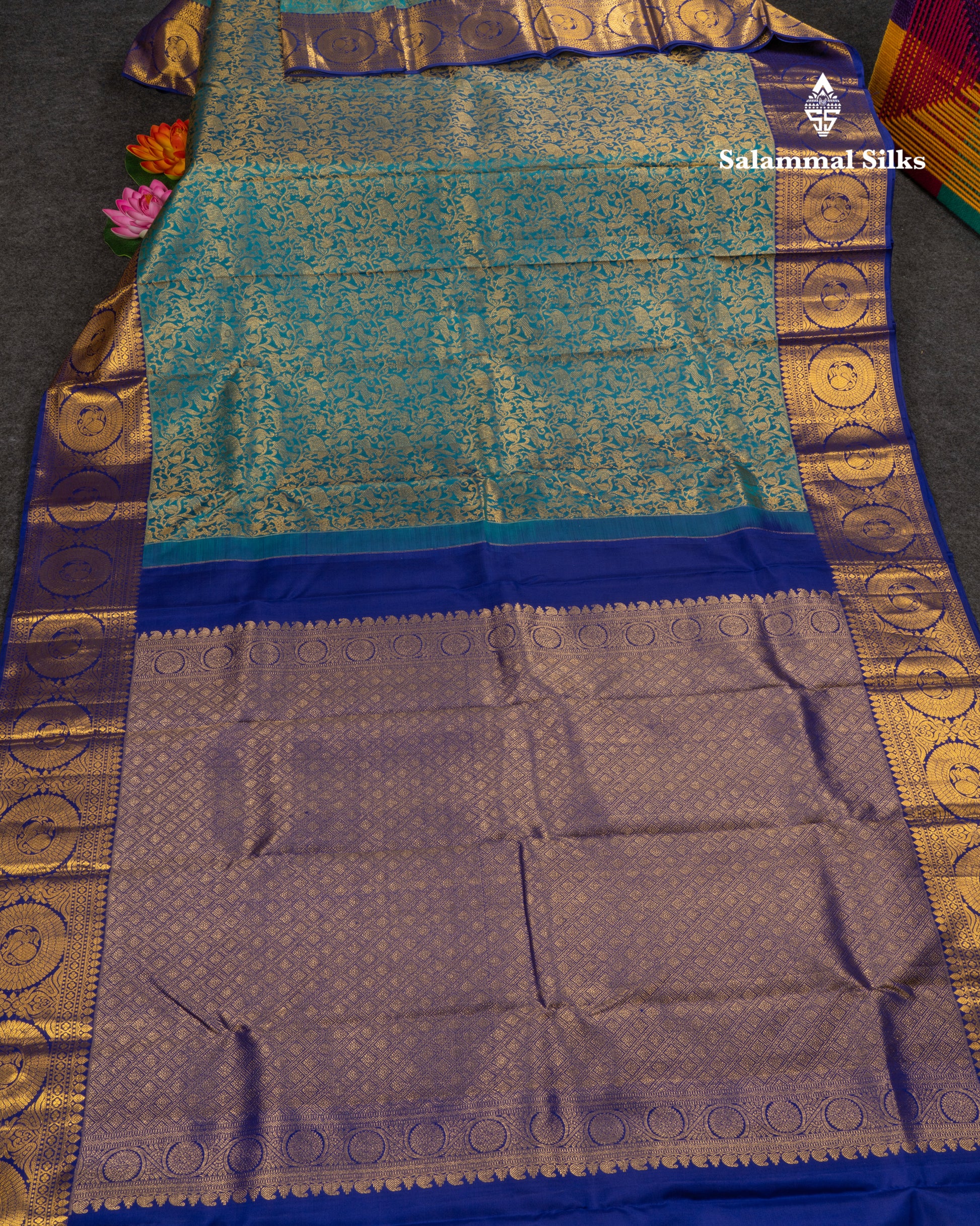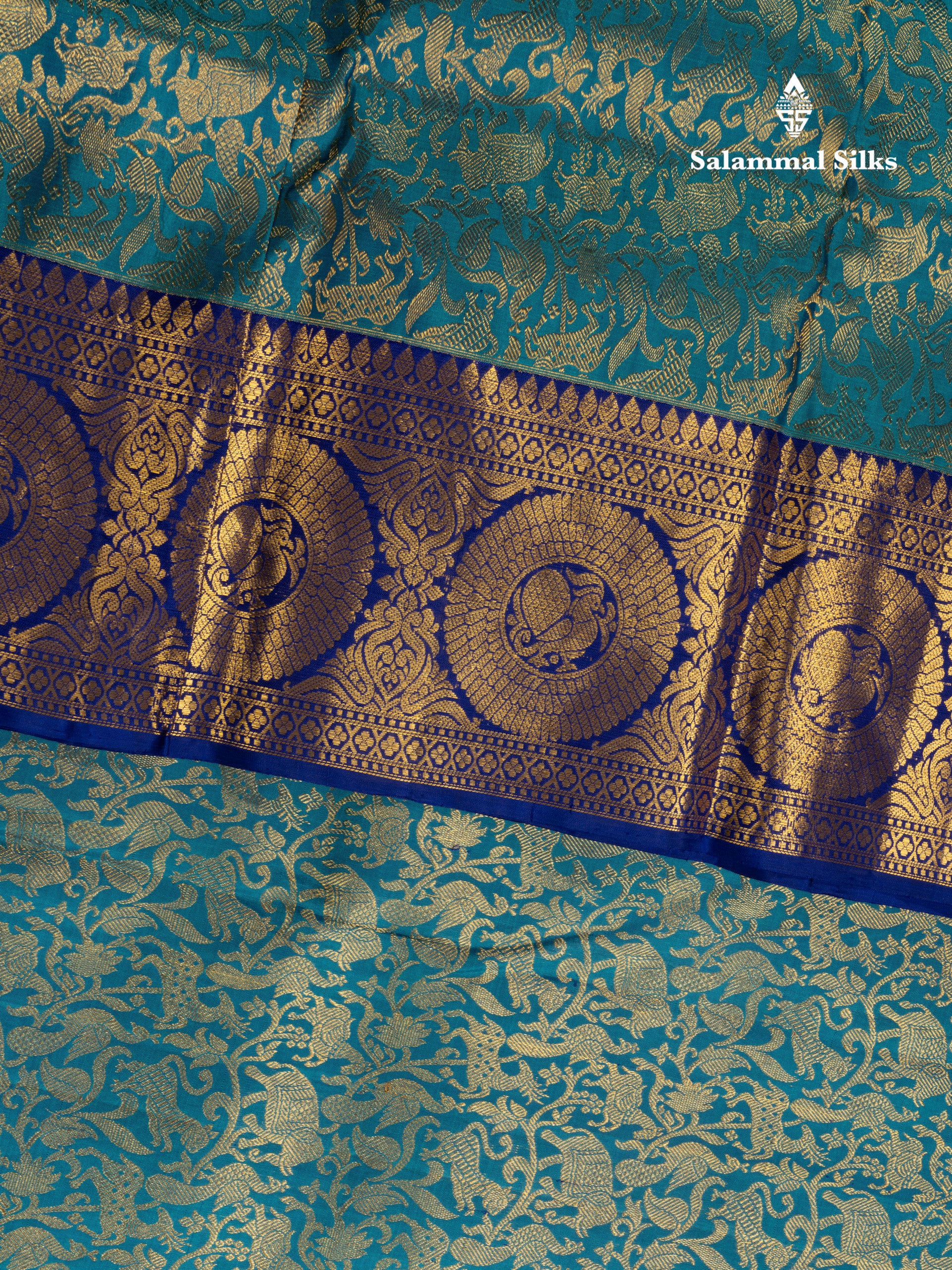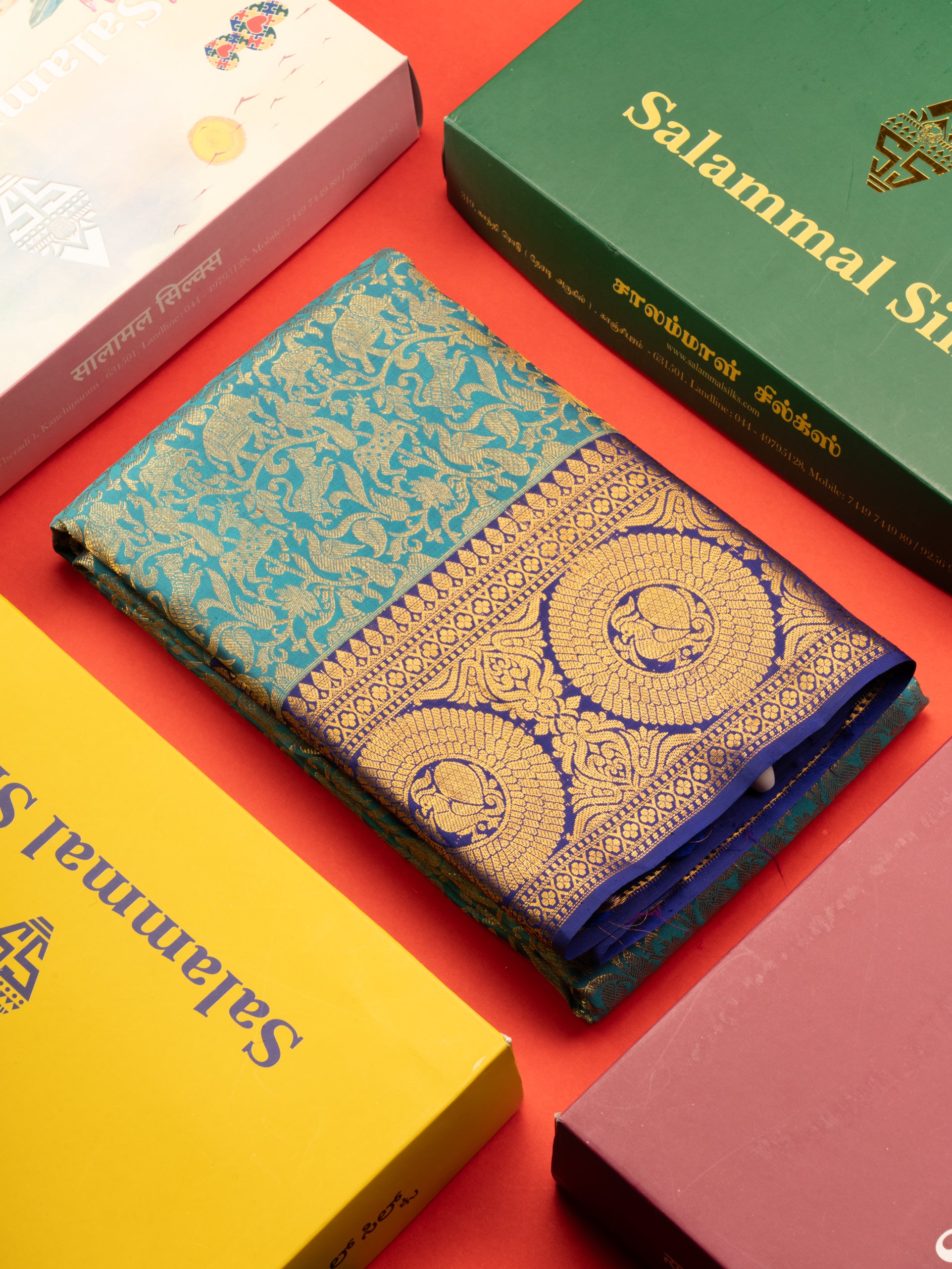 Salammal is known for its handloom sarees. In some sarees, there is cross-weaving between the body and the pallu, which is a sign of pure handloom sarees. This can be seen in Kanchipuram embossed sarees.