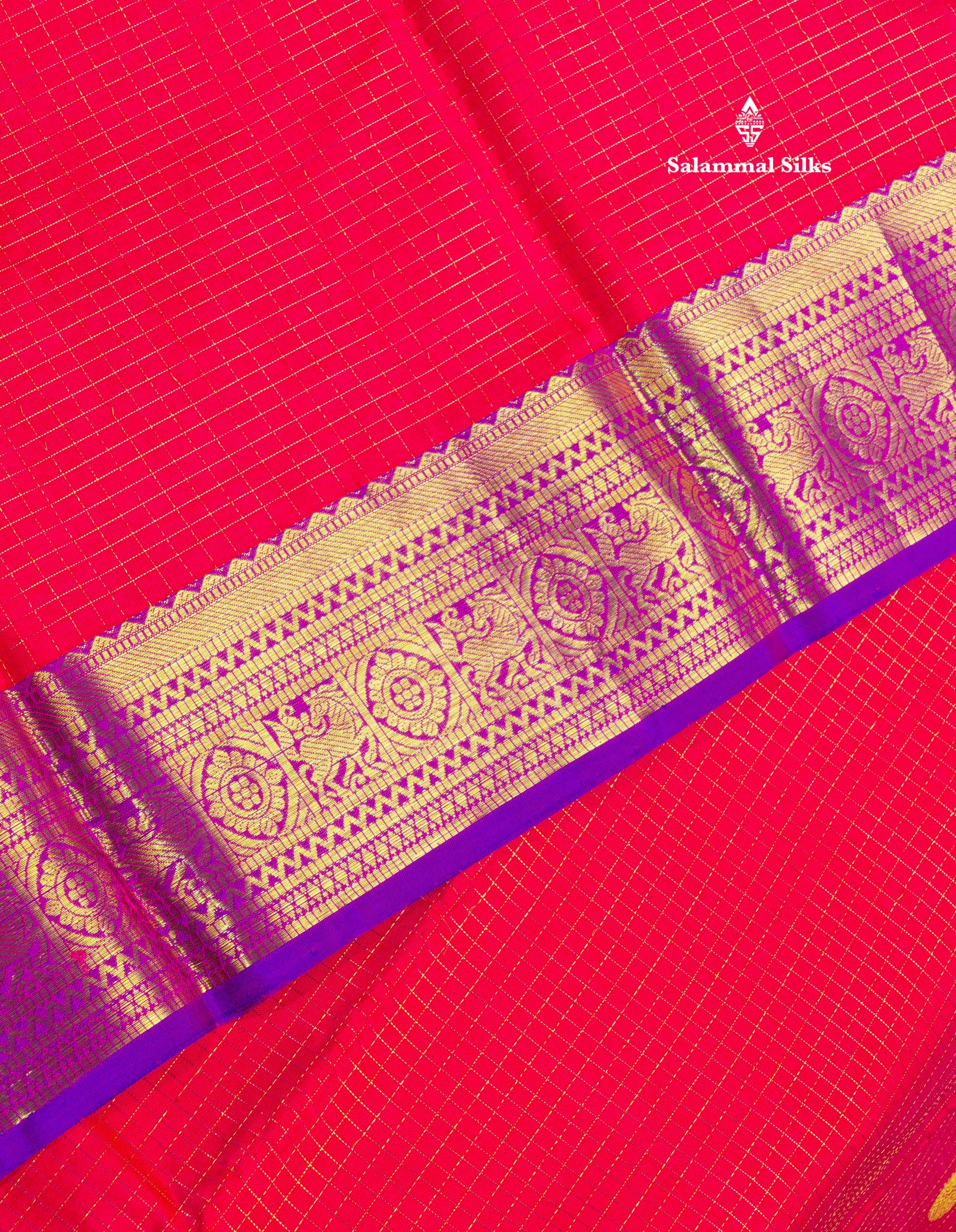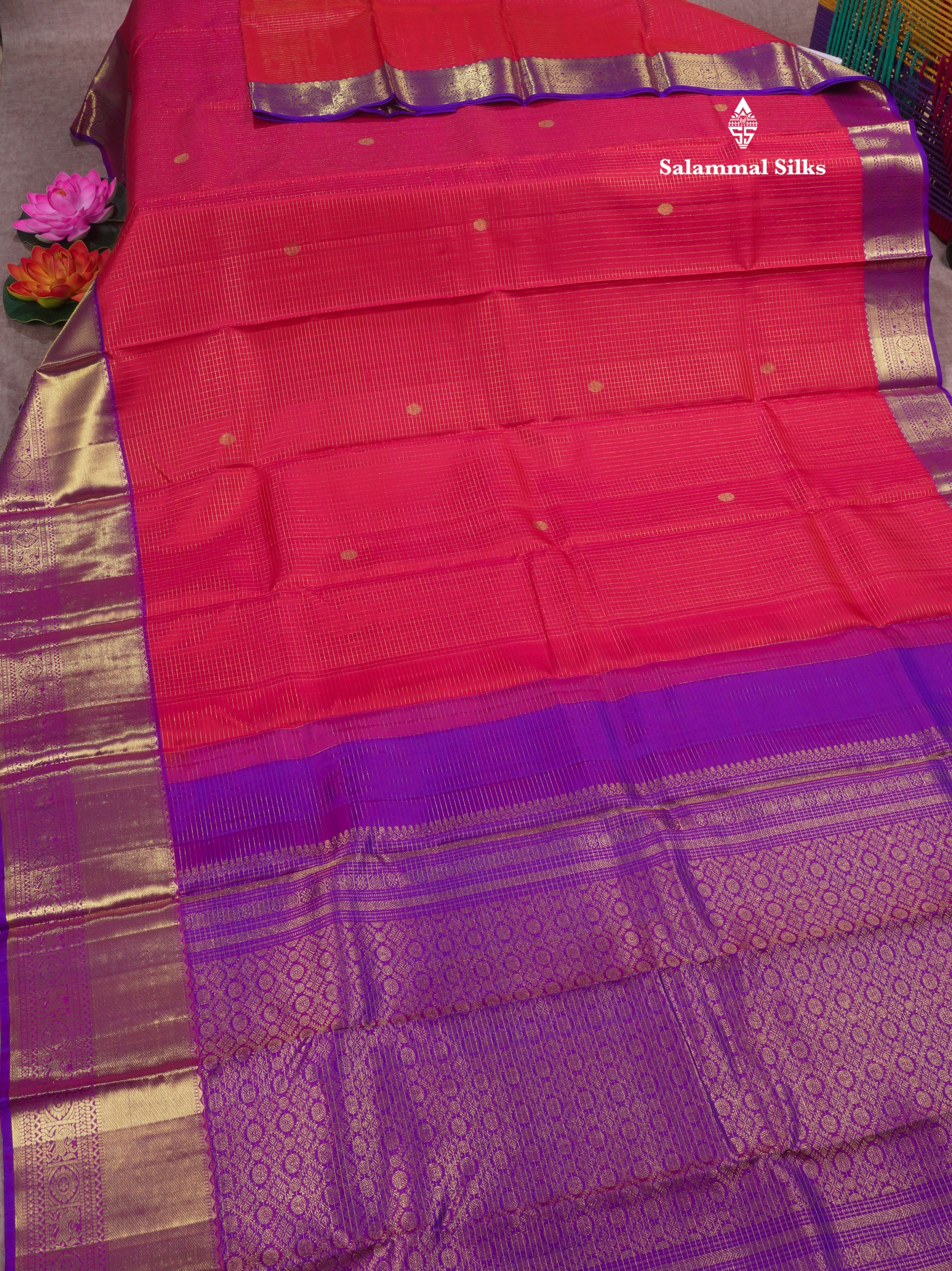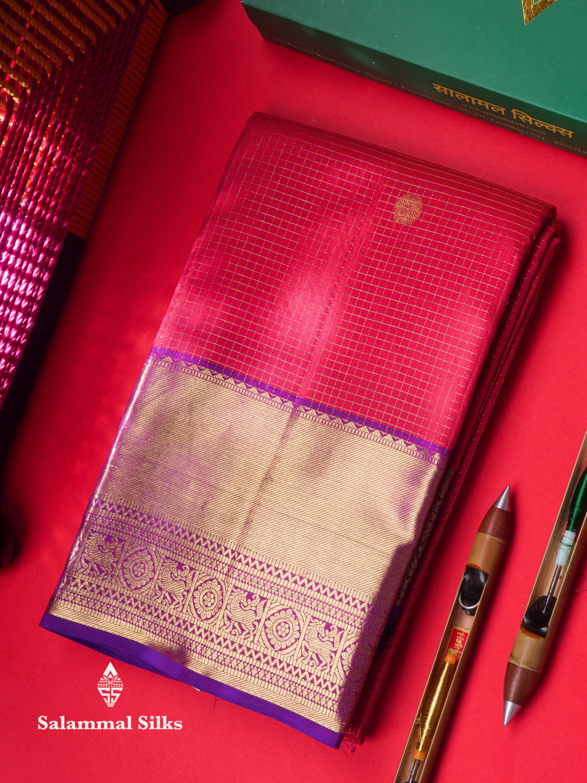 Kanjivaram Reddish Pink Pure Silk Saree With Contrast Violet Traditional Border
