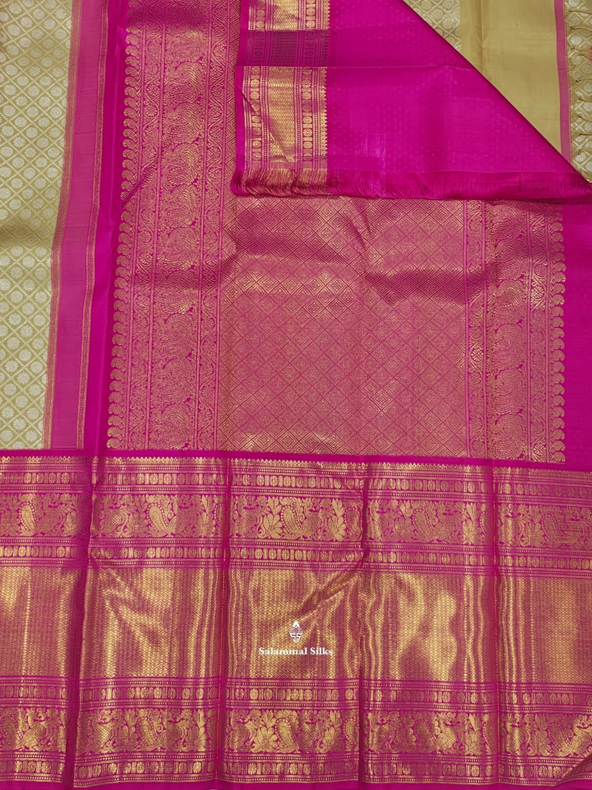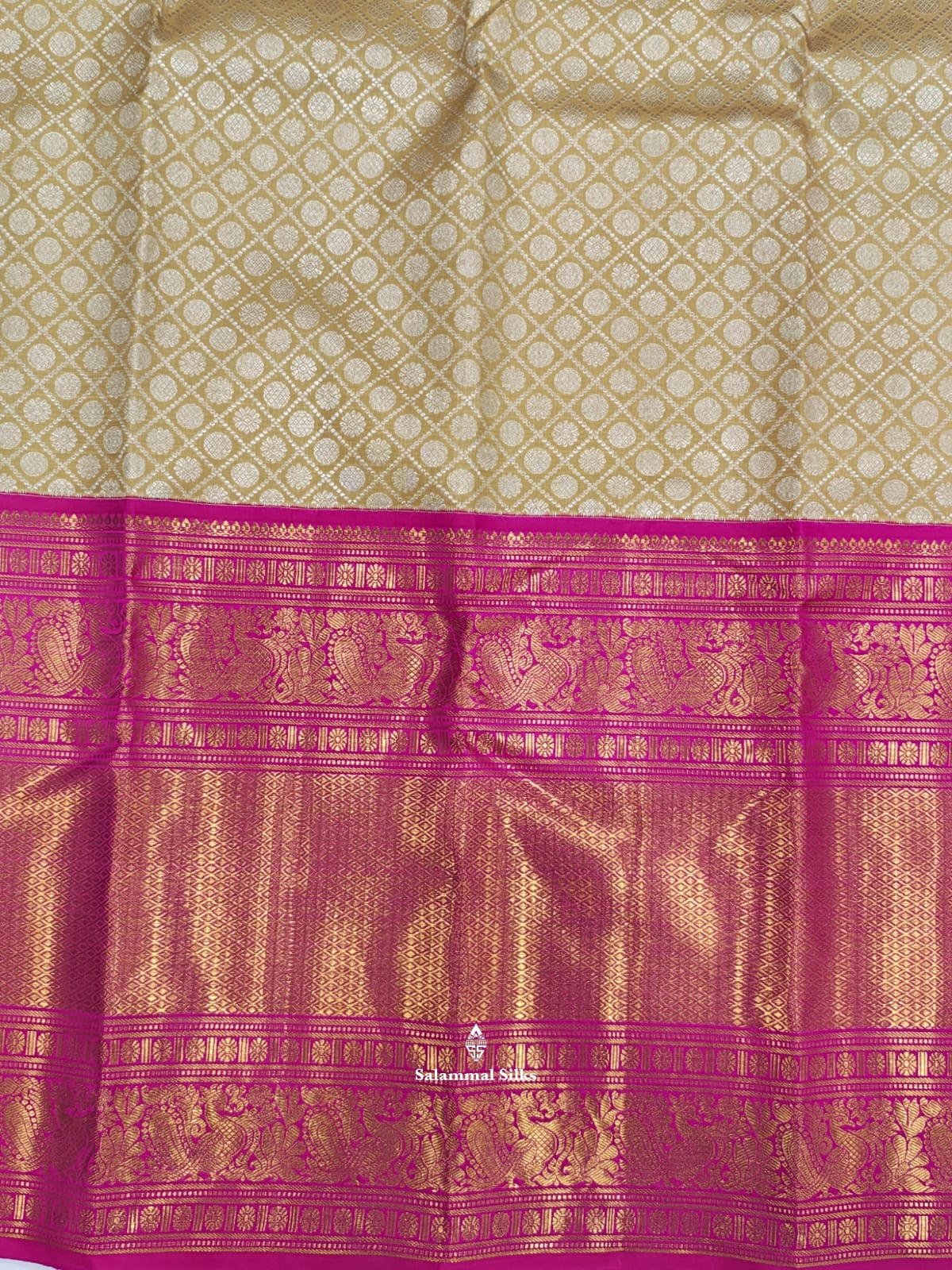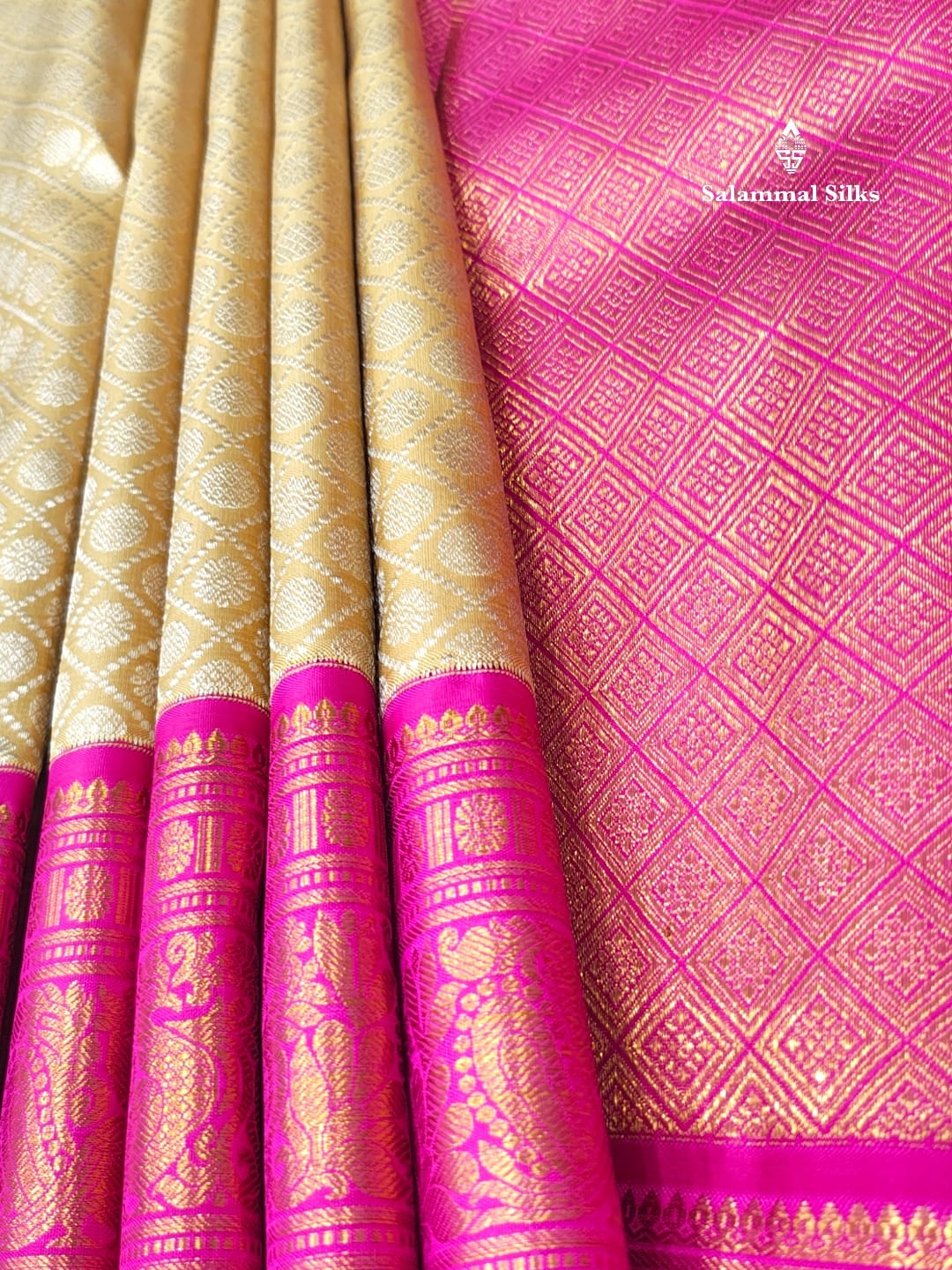 Salammal is known for its handloom sarees. In some sarees, there is cross-weaving between the body and the pallu, which is a sign of pure handloom sarees. This can be seen in Kanchipuram embossed sarees.