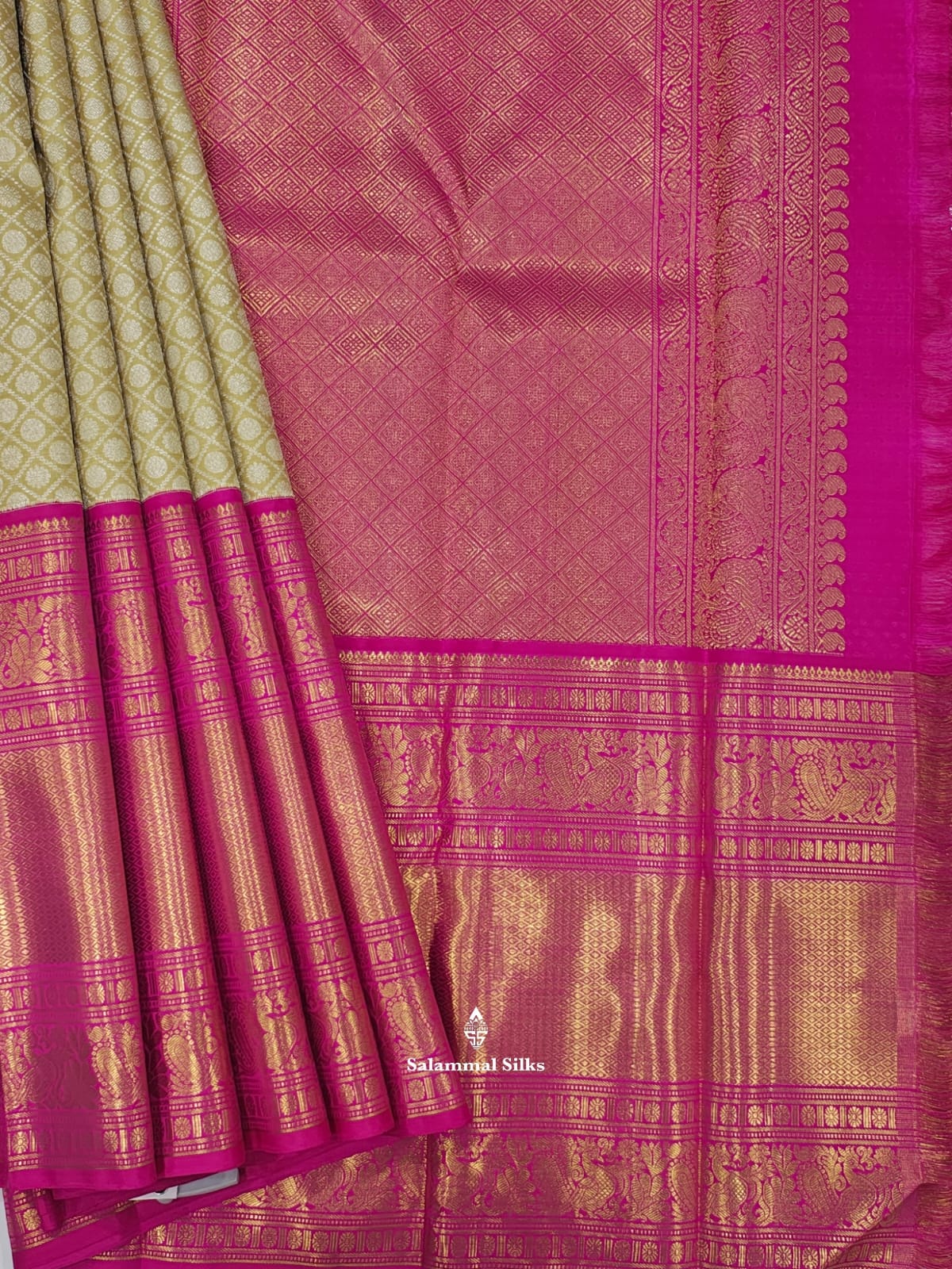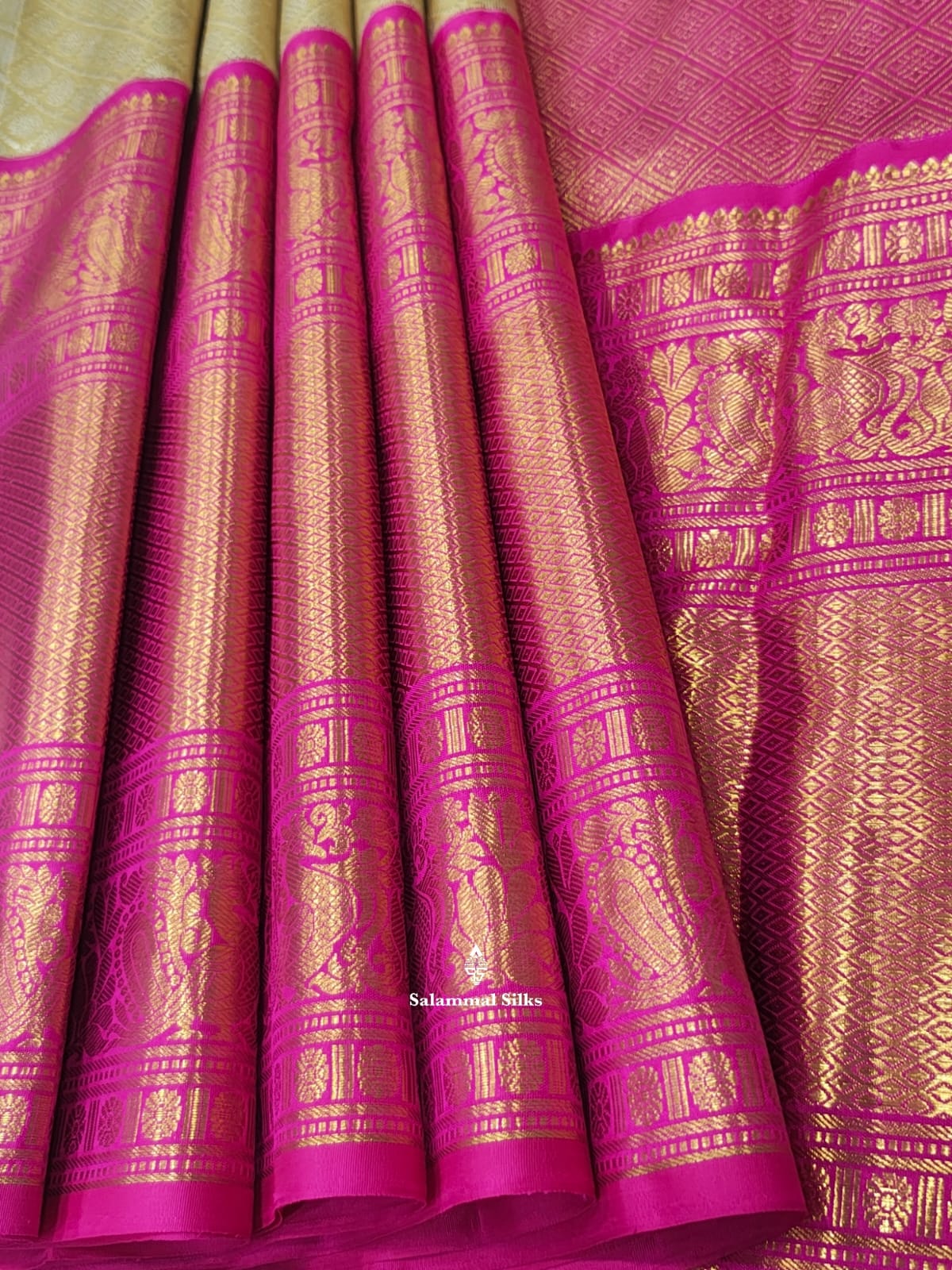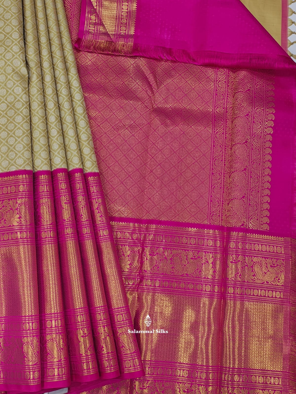 Salammal is known for its handloom sarees. In some sarees, there is cross-weaving between the body and the pallu, which is a sign of pure handloom sarees. This can be seen in Kanchipuram embossed sarees.