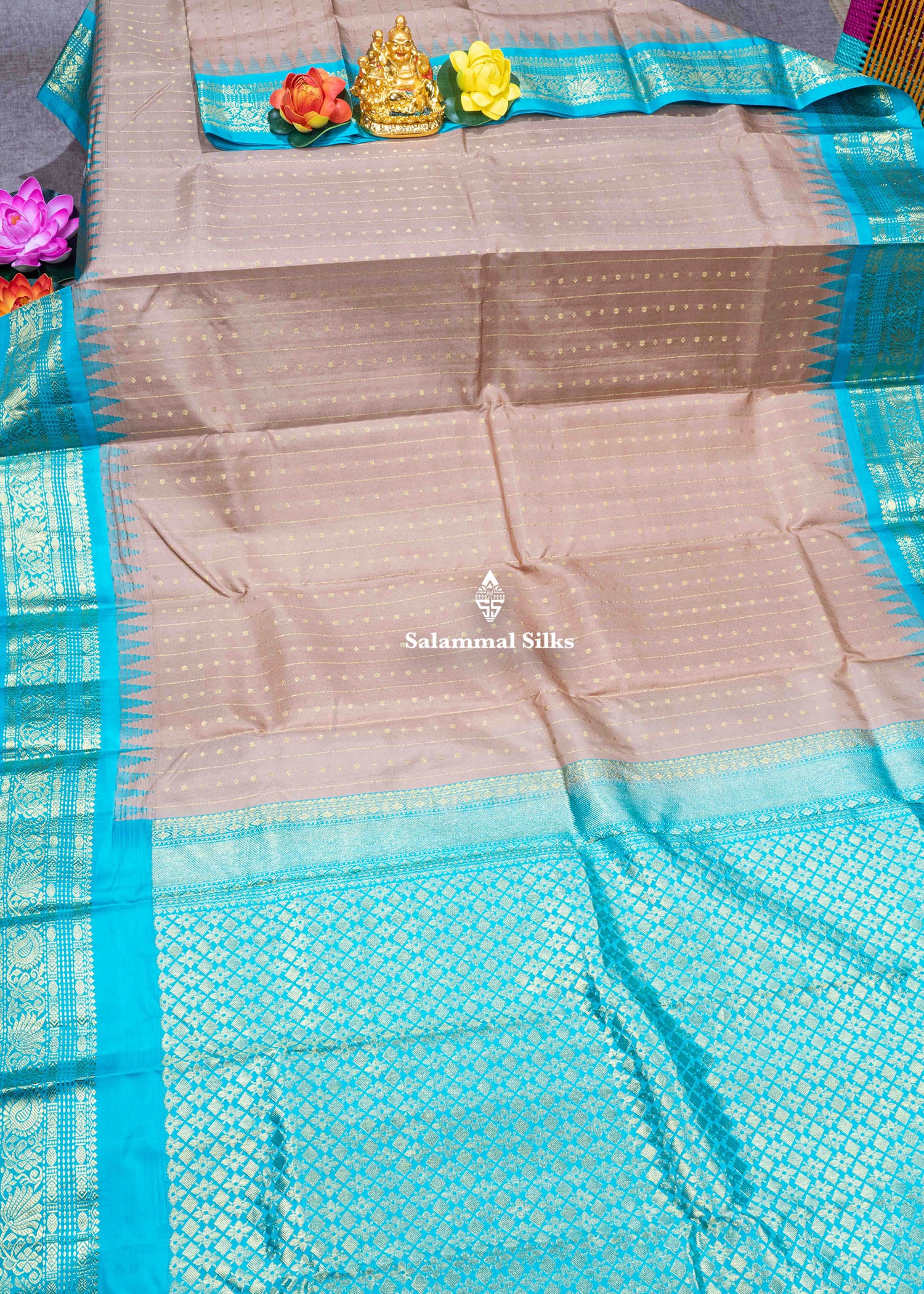 Kanjivaram Light Brown Pure Silk Saree With Sapphire Green Blouse