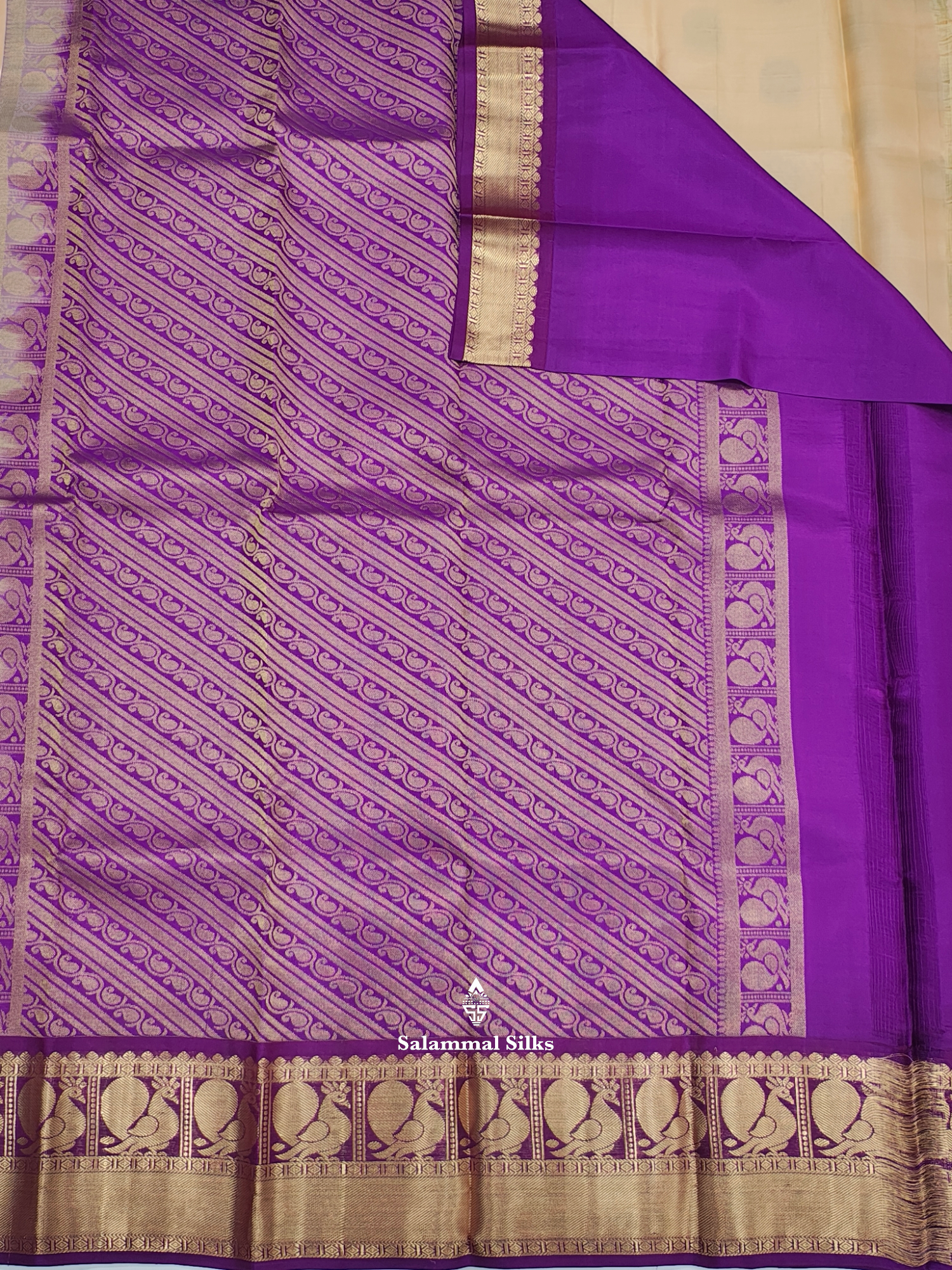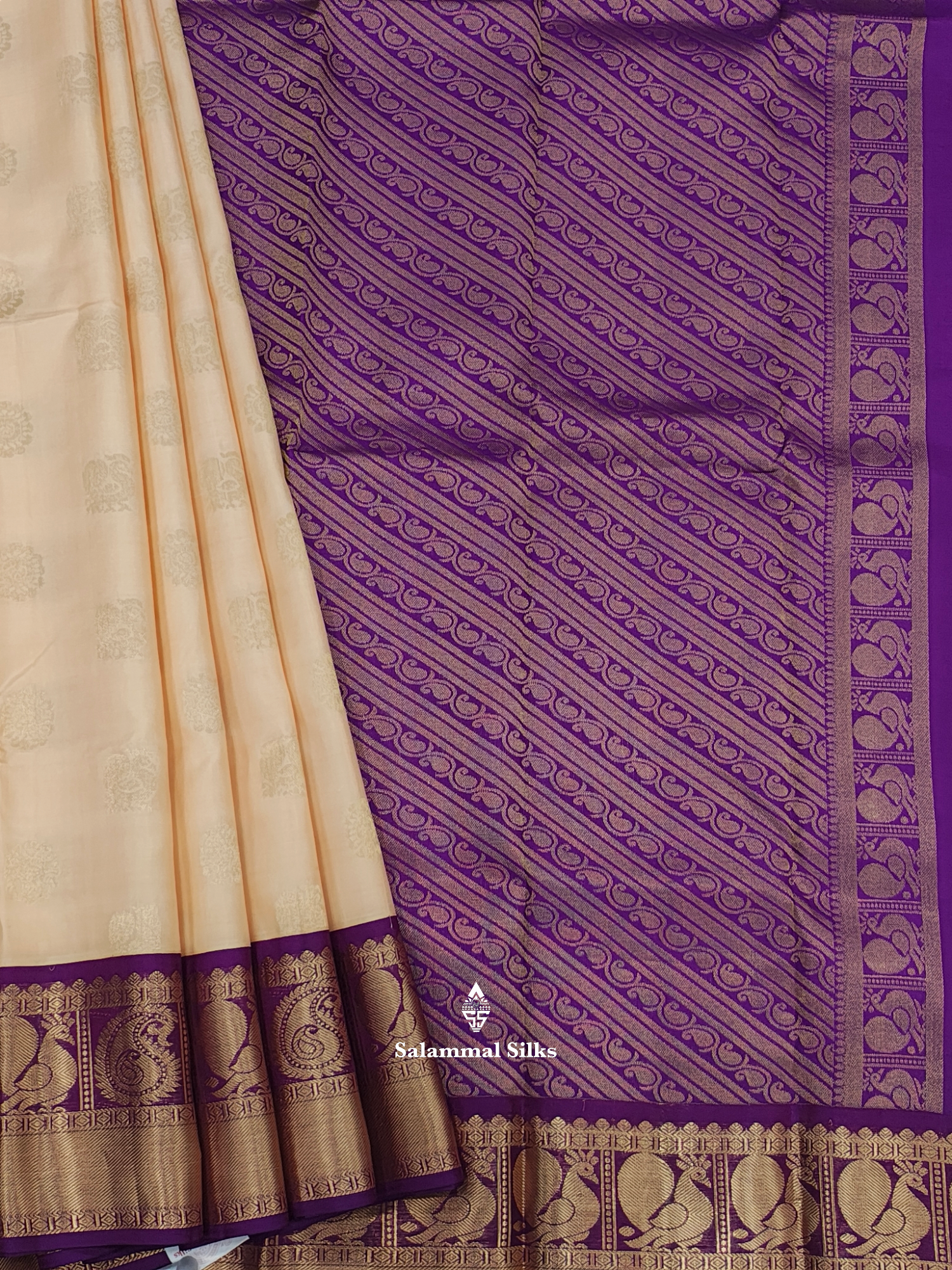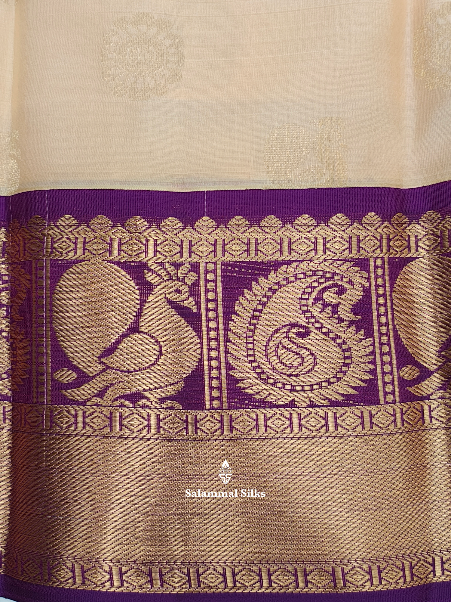 Salammal is known for its handloom sarees. In some sarees, there is cross-weaving between the body and the pallu, which is a sign of pure handloom sarees. This can be seen in Kanchipuram embossed sarees.
